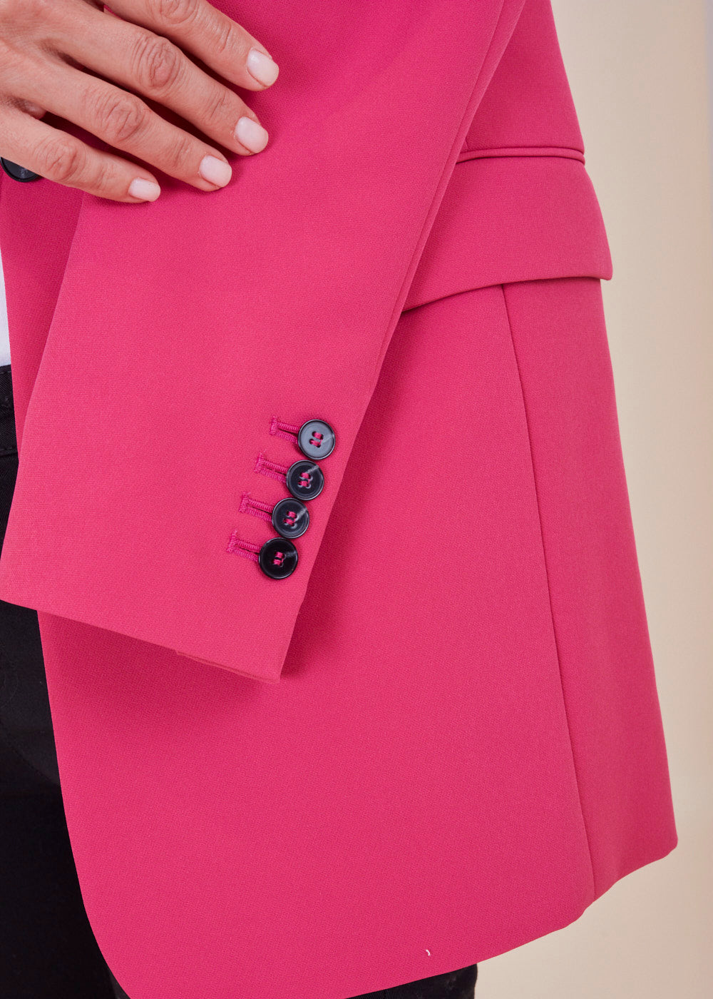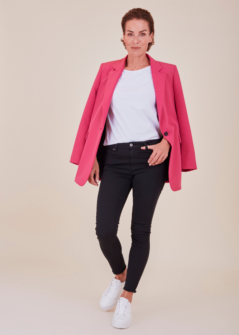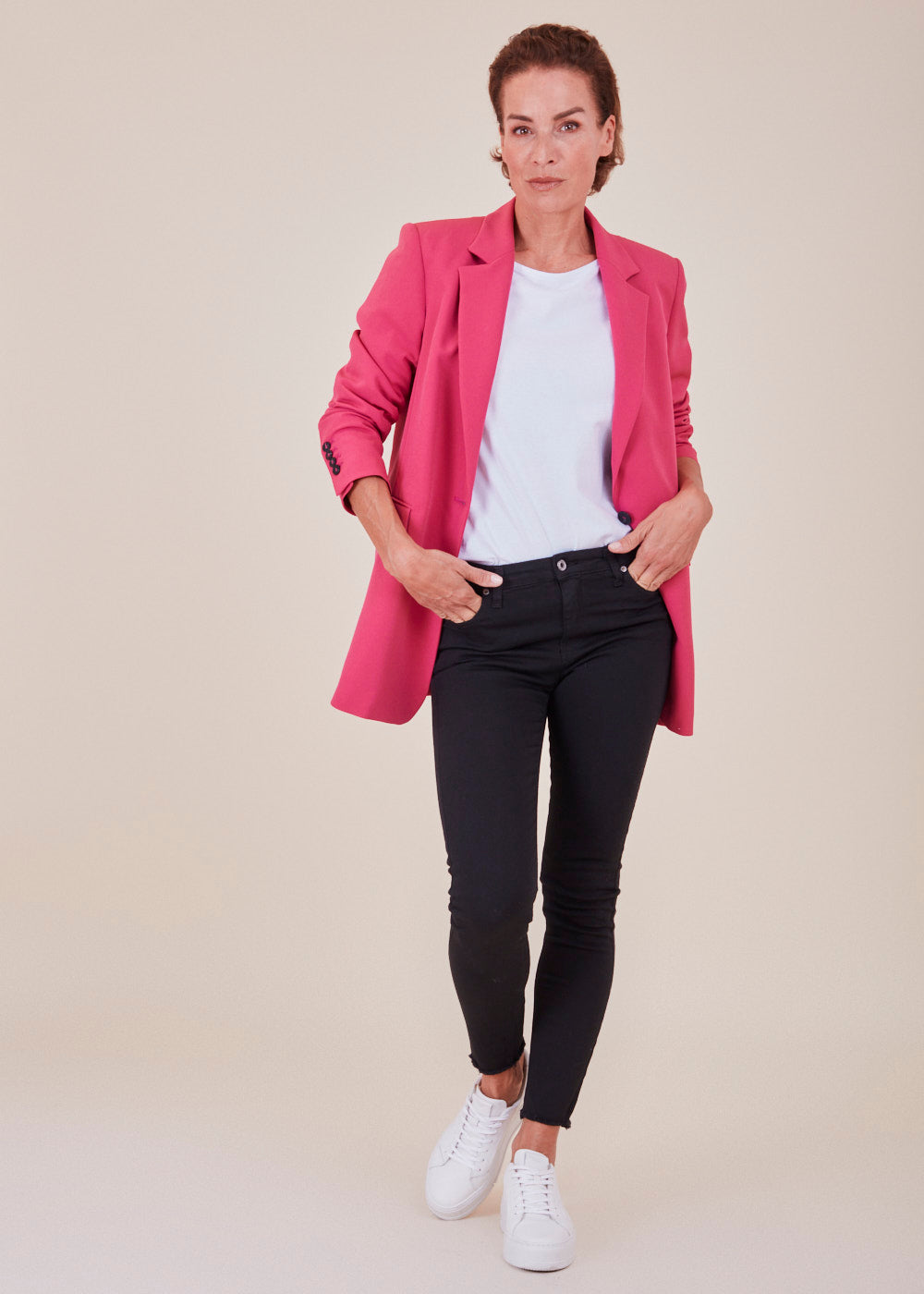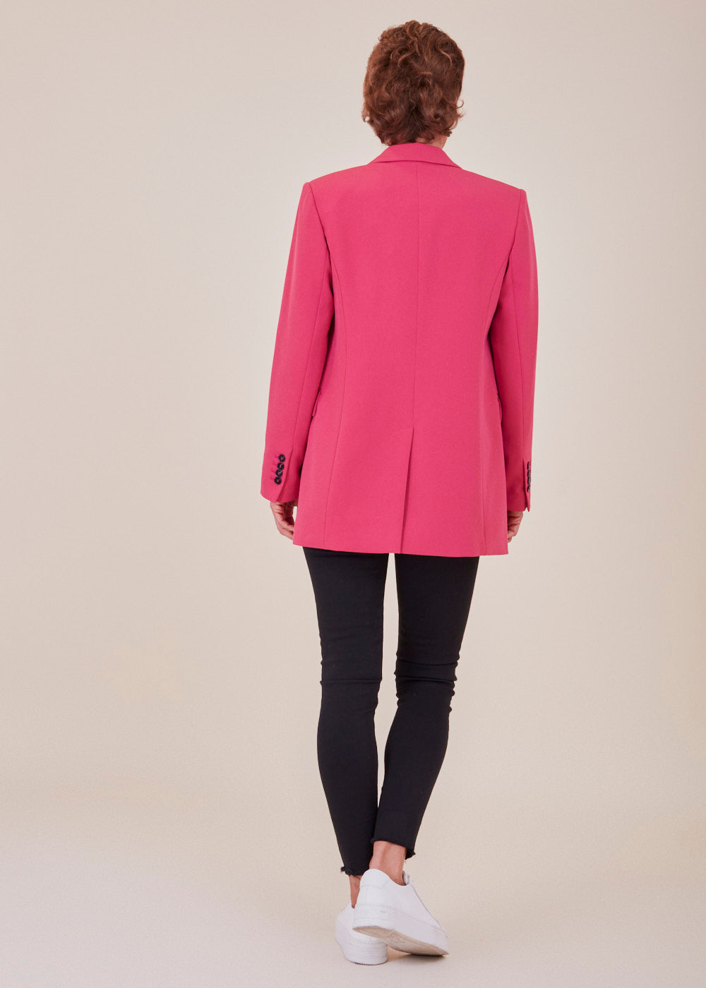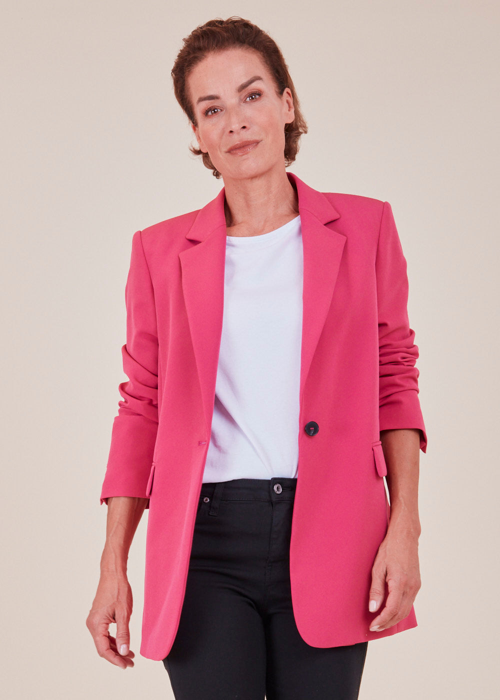 Länger geschnittener Blazer, in einem großartigen Design, in der Farbe Fuxia. Er hat feine Pattentaschen und ist schließbar durch einen Knopf. Die gekonnte Schnittführung zaubert eine feminine Silhouette. Wer es etwas legerer mag, kann ein lässiges Outfit aus Jeans und Shirt mit der stylischen Jacke aufpeppen. Stilvoller und zeitloser Begleiter.