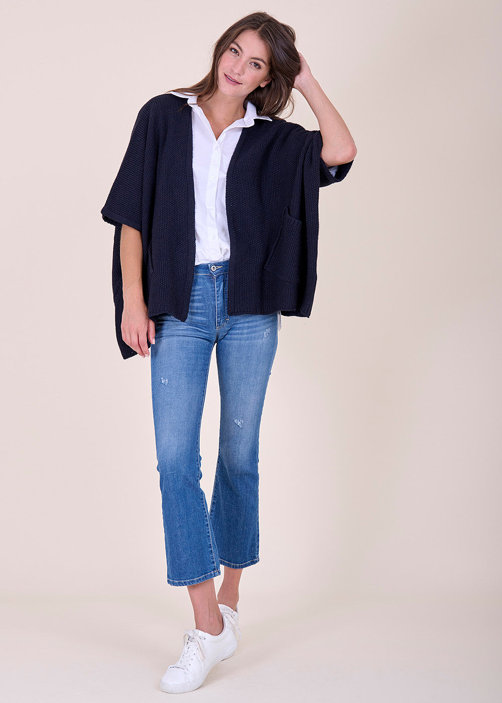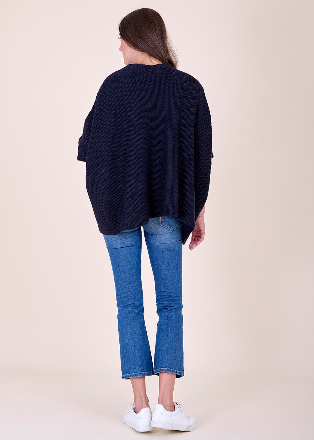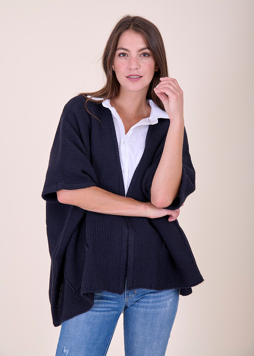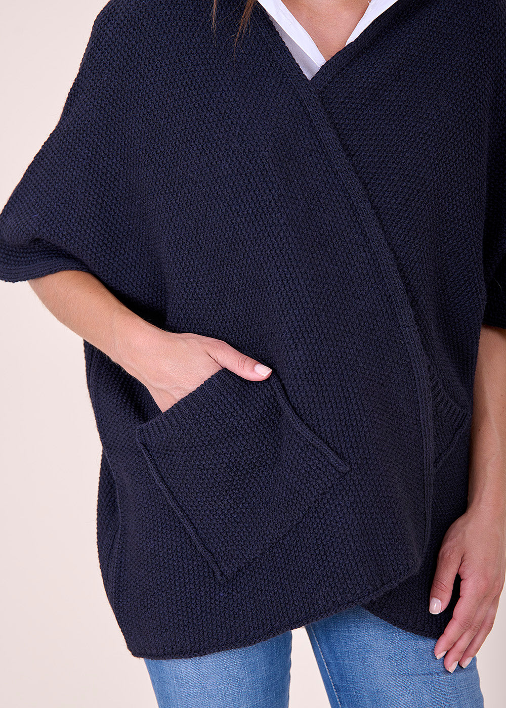 Wundervoller Mantella aus Strick in tiefem Blau mit seitlichen Eingriffstaschen. Ein wunderbarer Kombinationsartikel, der sich auch toll über ein Kleid tragen lässt.