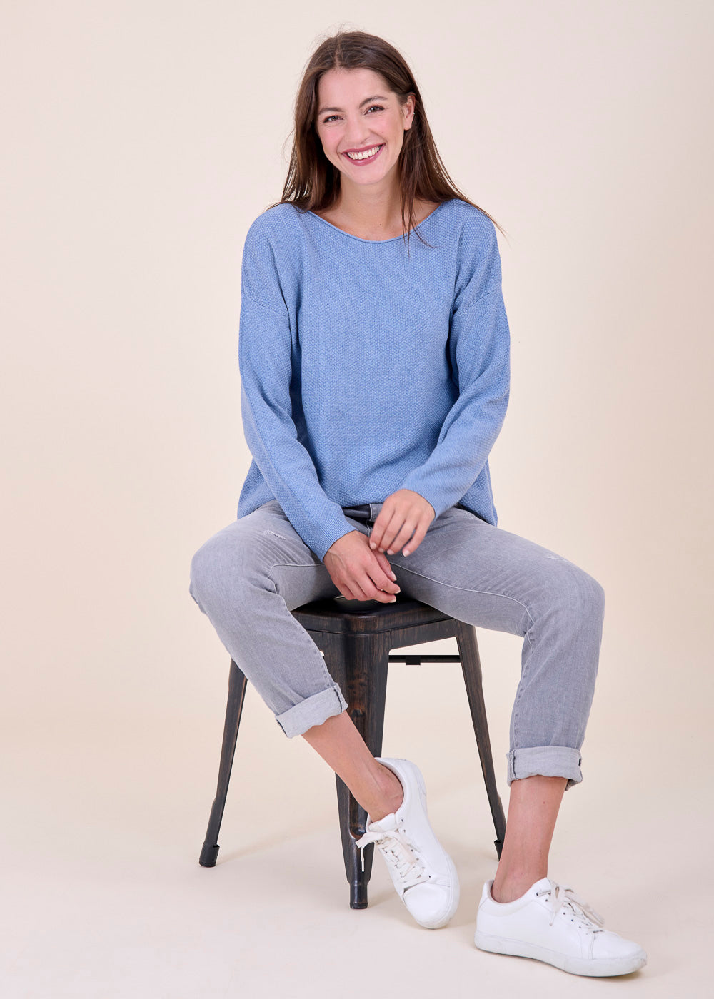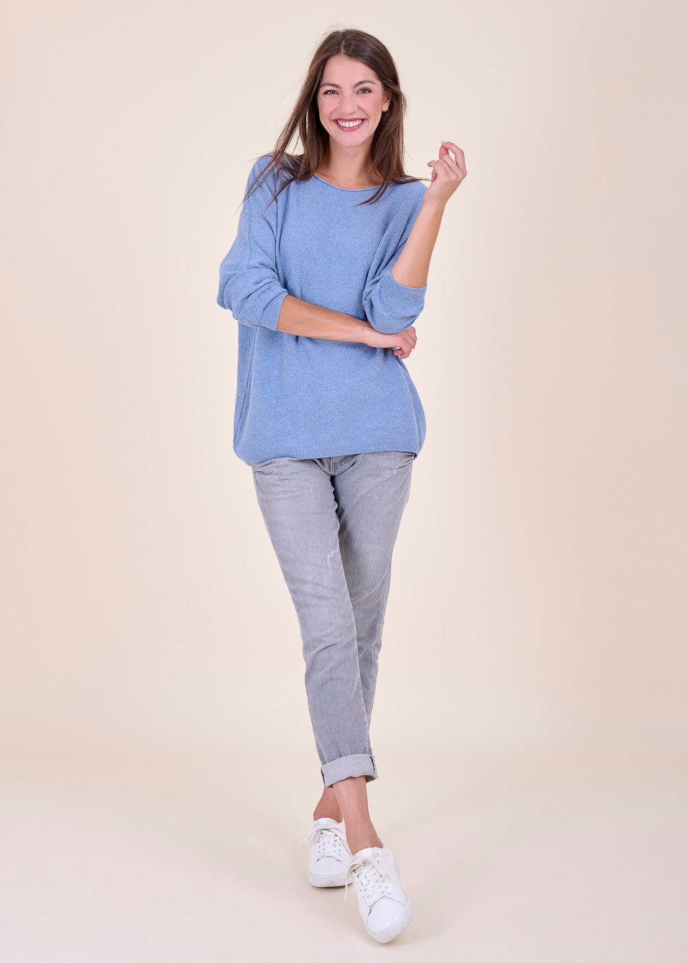 Leichter Pullover mit langen Ärmeln und Bündchen in Rippenstrickoptik. Der Pullover hat einen Rundhalsausschnitt und ist leicht oversized.