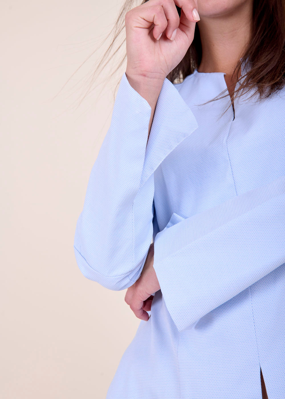 Fantastische Fashion-Bluse mit Schlitzen am Dekoltée, am Bund und an den Seiten. Die Bluse hat einen asymmetrischen Schnitt, der sich nach Hinten verlängert und lange Ärmel, die glockenförmig auslaufen. Ein umwerfendes Must-Have für echte Modeliebhaber!