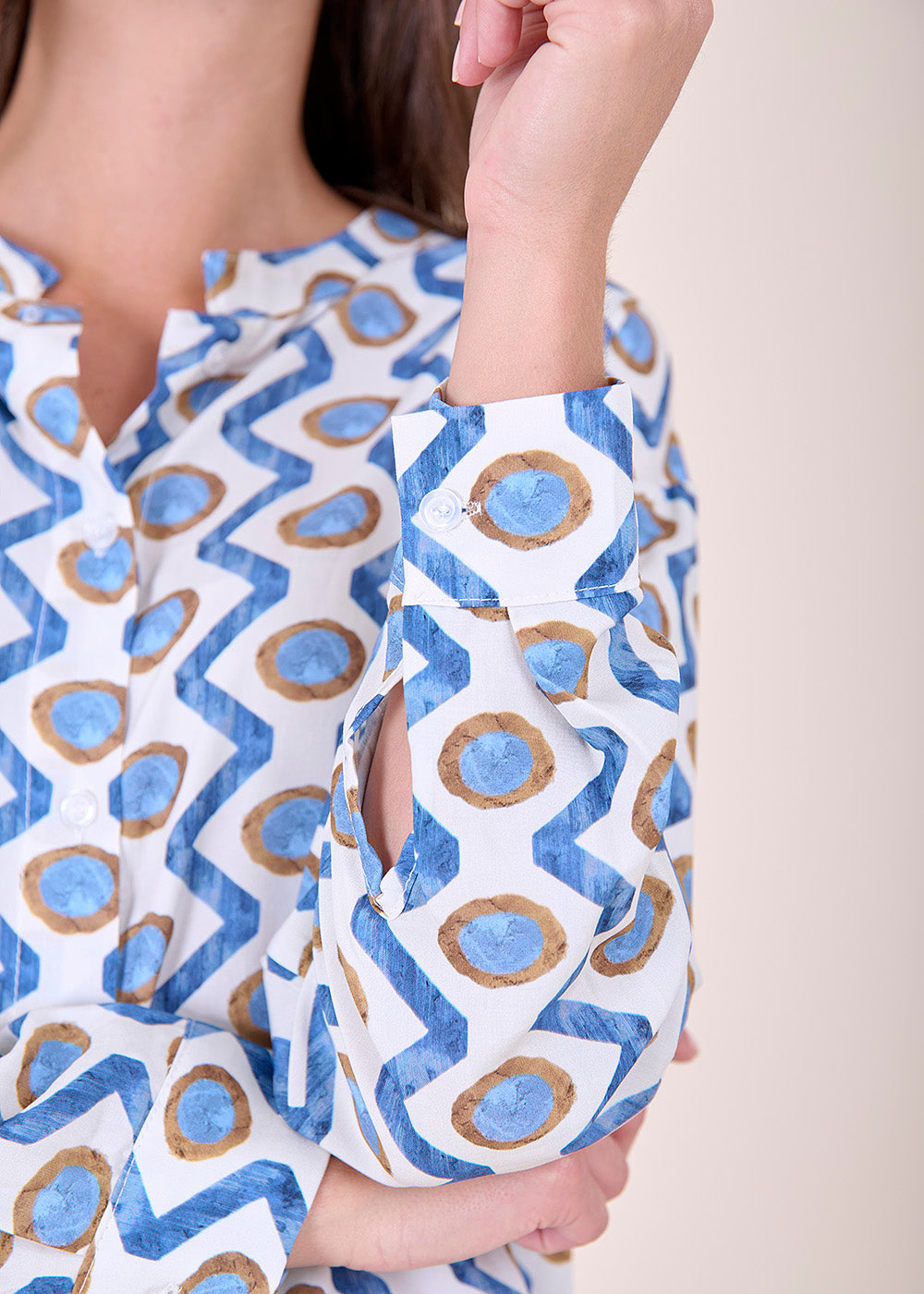 Viskosebluse im All-Over-Print mit langen Ärmeln. Die Bluse hat einen kleinen Stehkragen und einen leichten V-Ausschnitt, der in eine durchgezogene Knopfleiste mündet. Der Schnitt der Bluse ist gerade.