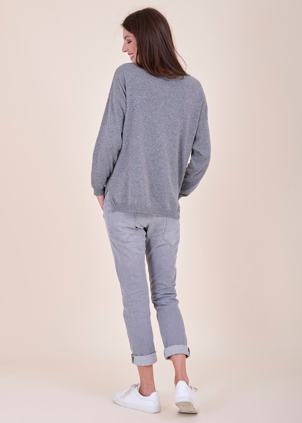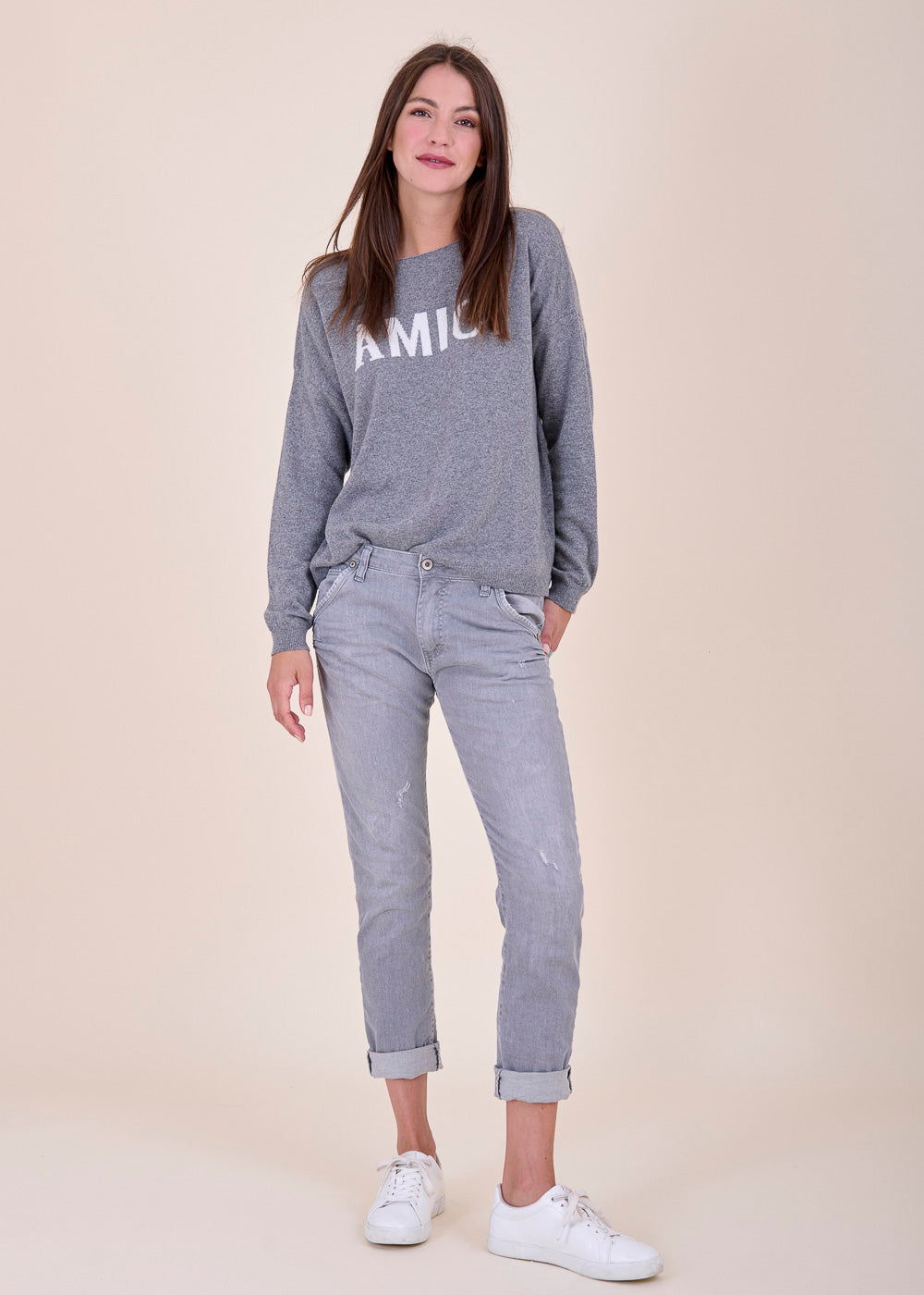 Kuscheliger Pullover mit langem Ärmeln und italienischem Print. Der Pullover hat einen leichten Rundhalsausschnitt und überschnittene Schultern. Die Ärmeln und Bund sind durch Rippenstrick gezäumt.
