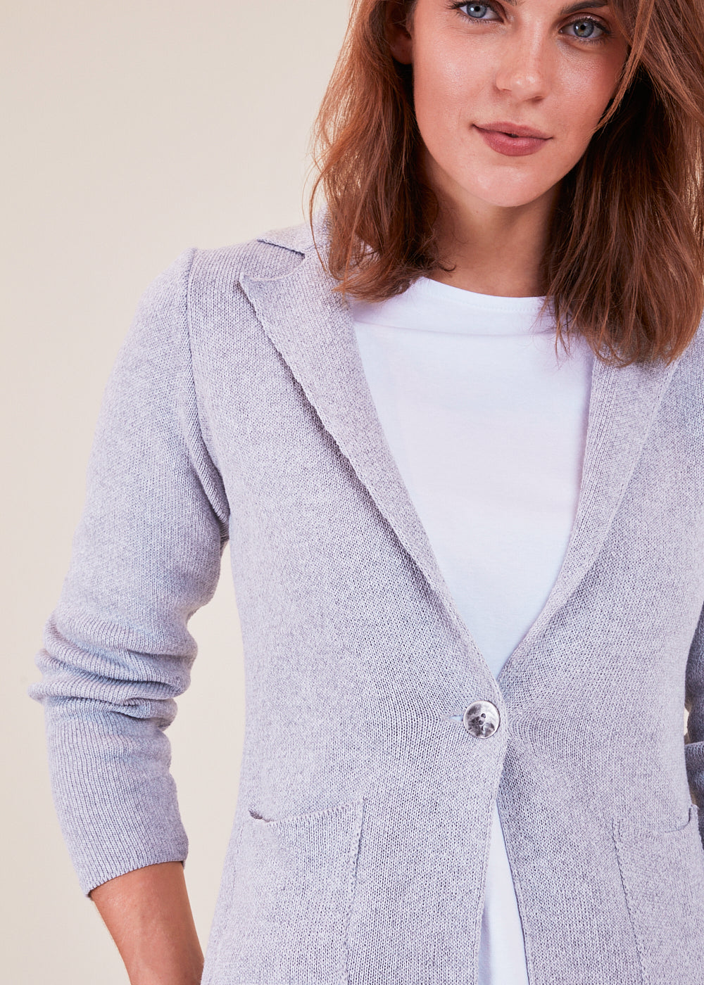 Taillierter Strickblazer mit langem Ärmeln und einem Knopf. Der Blazer hat aufgesetzte Taschen und einen weiten V-Ausschnitt.