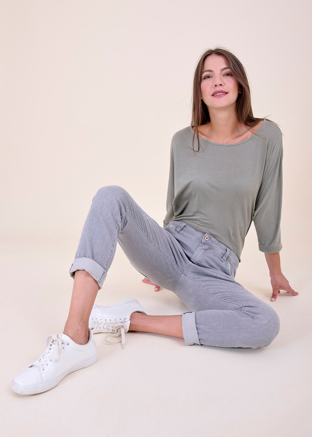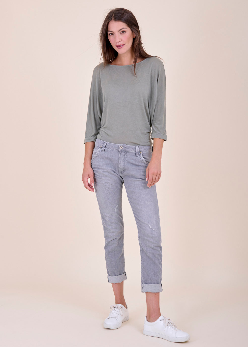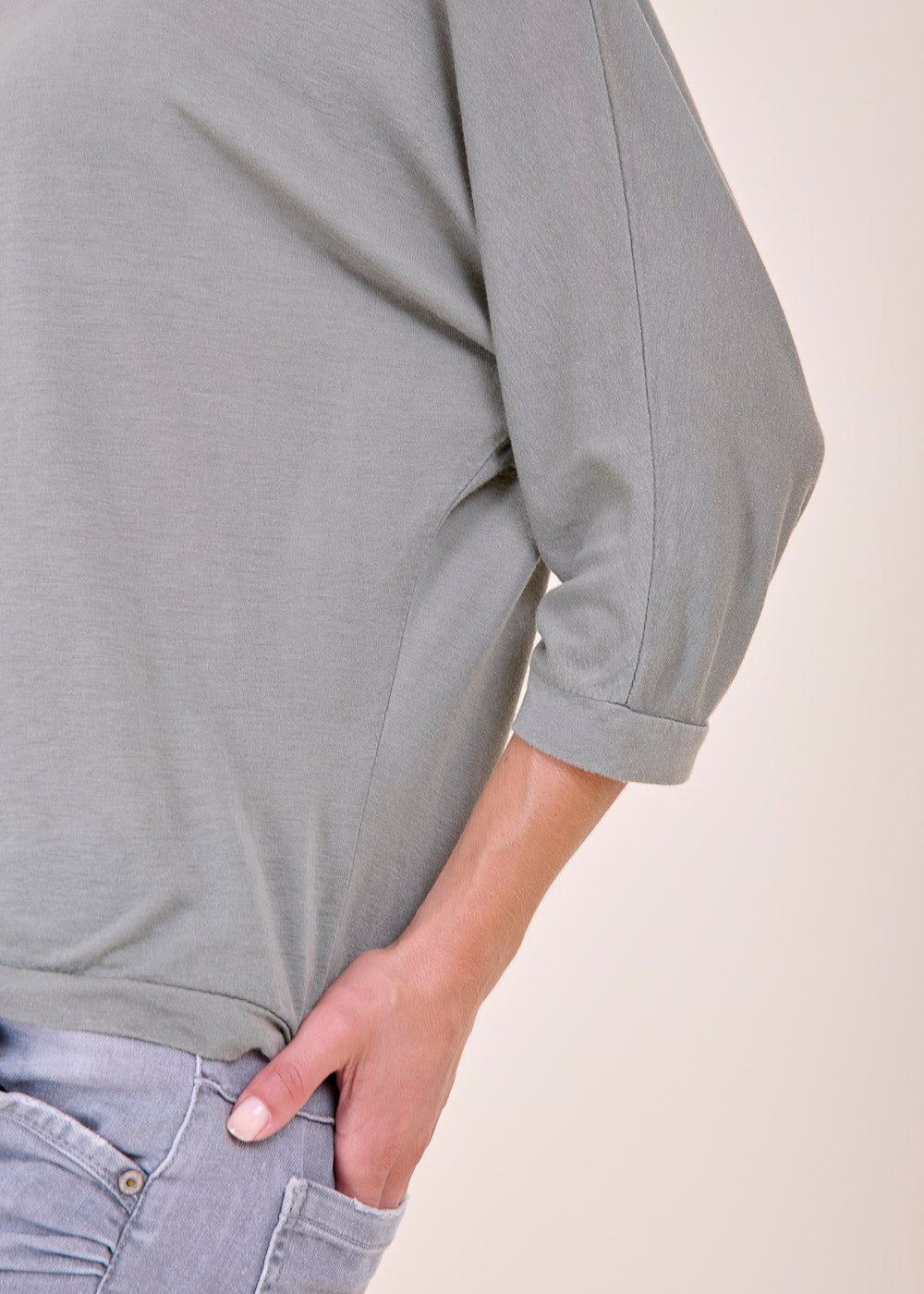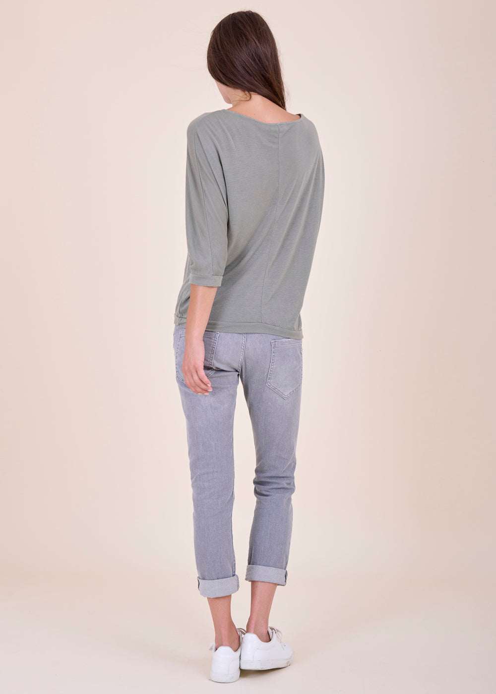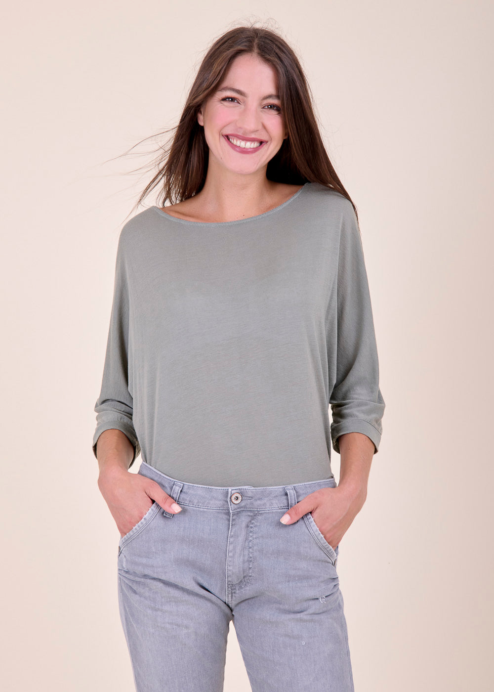 3/4-Arm Shirt aus Tencel. Das Oberteil hat einen Rundhalsausschnitt und Fledermausärmel. Es ist tailliert geschnitten und mit einem sichtbaren Bund versehen. Super bequem und toll zu kombinieren!