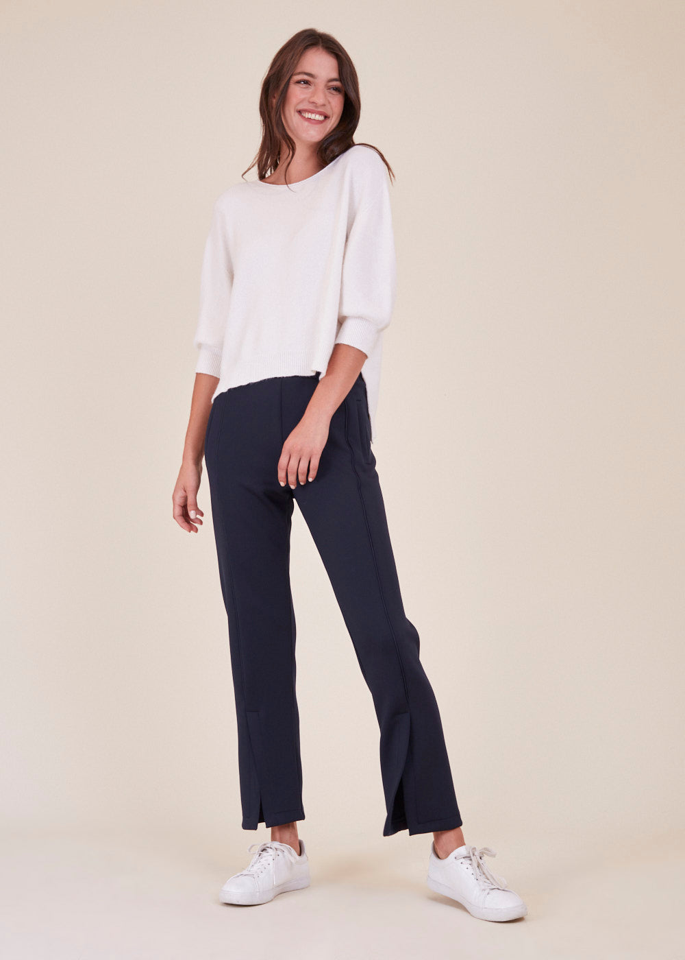 Hoch taillierte Hose in einem Mischgewebe aus Polyester und Elasthan. Dieses Modell hat einen Gummizug im Bund, schräge Seitentaschen und gerade, weite Beine mit vorderem Schlitz.