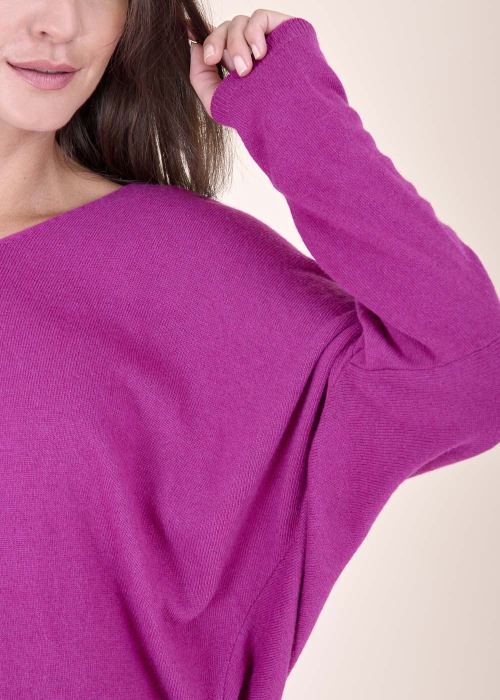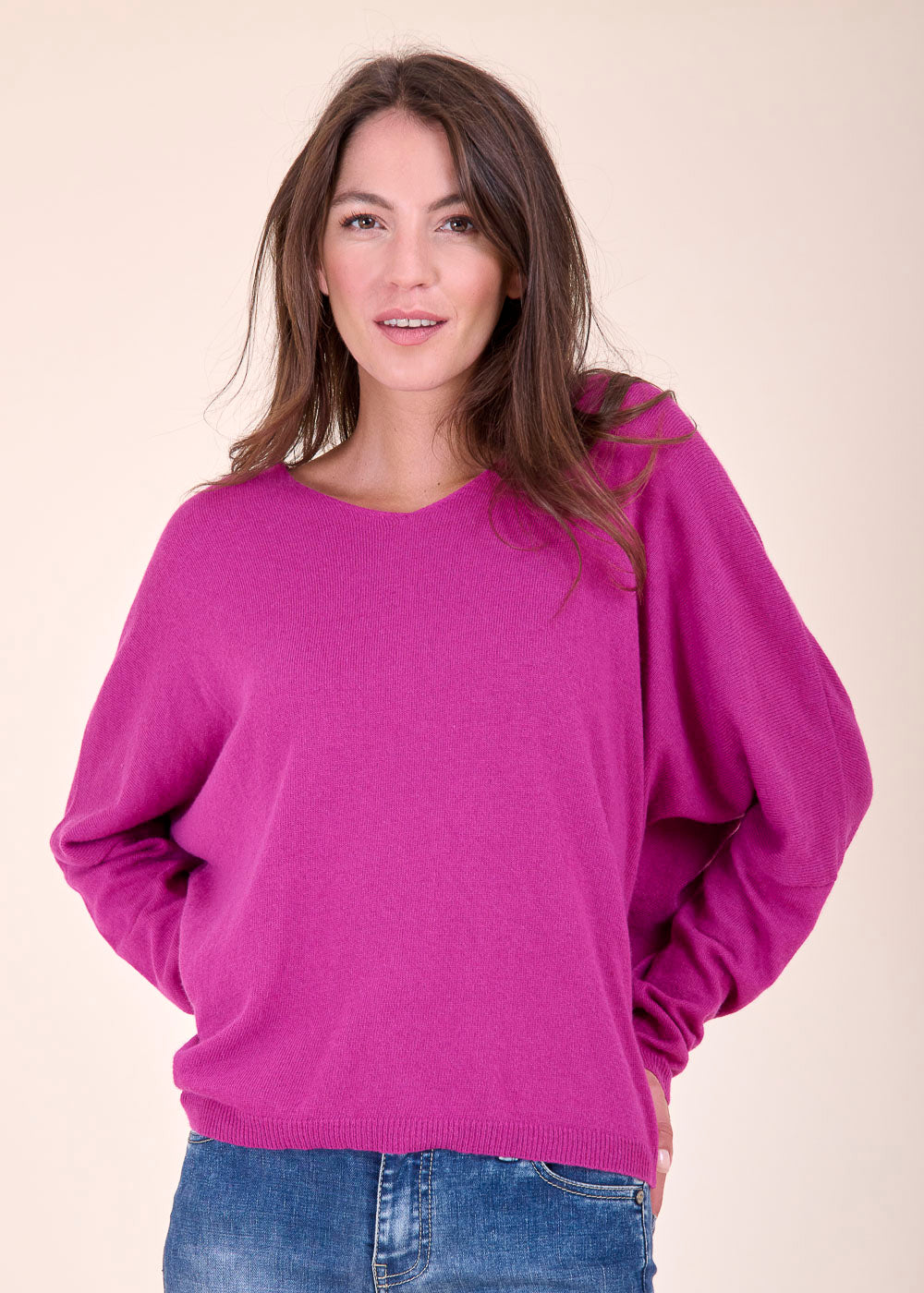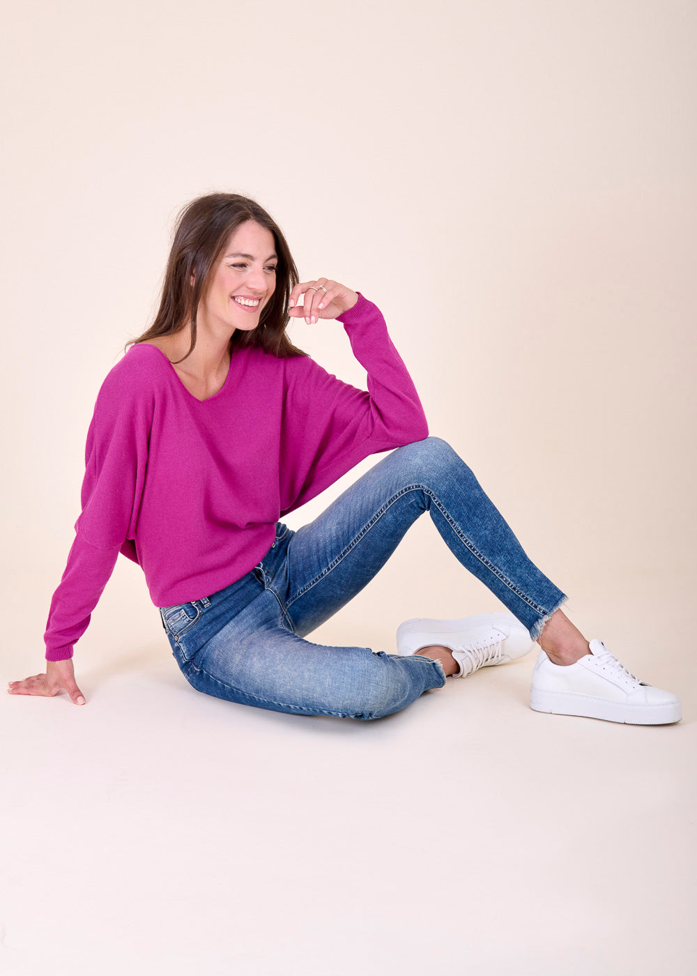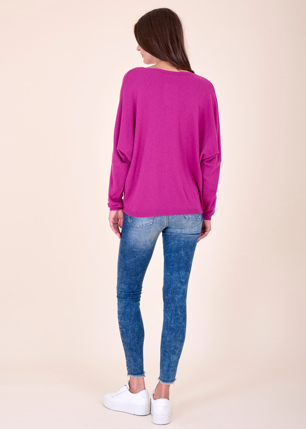 Der Kuschelpullover zeichnet sich durch seine langen Fledermausärmel und seinem besonderen Fuxia Ton aus. Die tief ausgeschnittenen Ärmel geben dir einen angenehmen Bewegungsspielraum. Dieser Pullover hat einen Rundhalsausschnitt und ist hüftbedeckend sowie Figur umspielend geschnitten, sodass der Oberkörper locker betont wird.