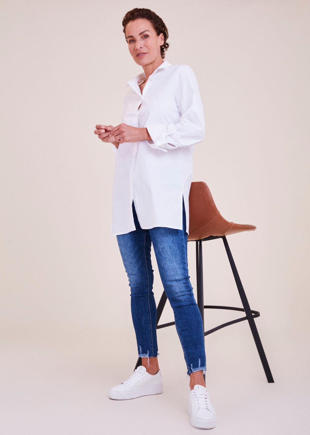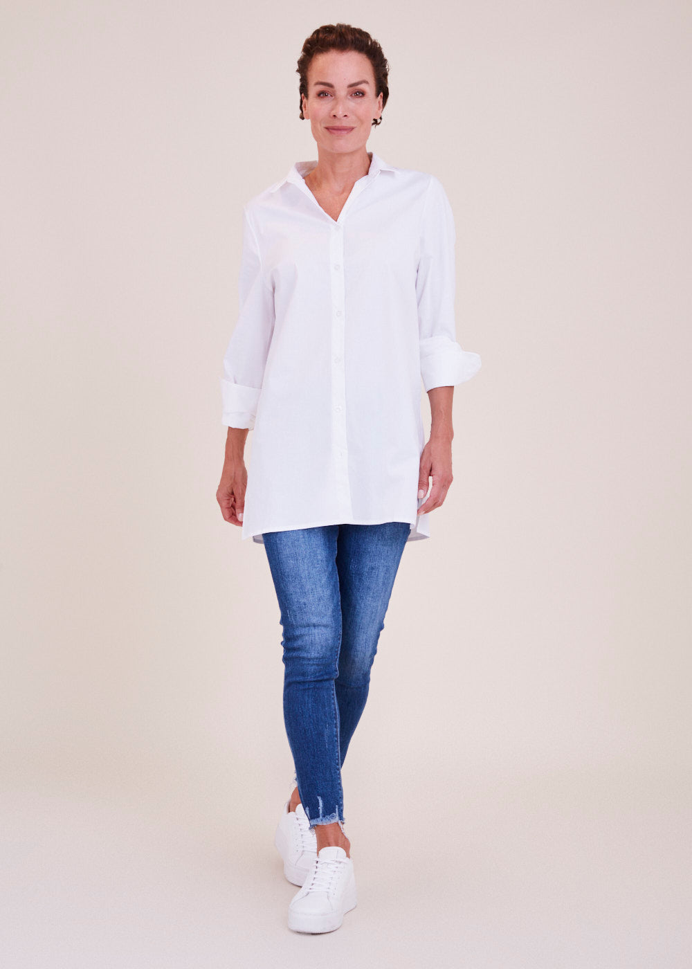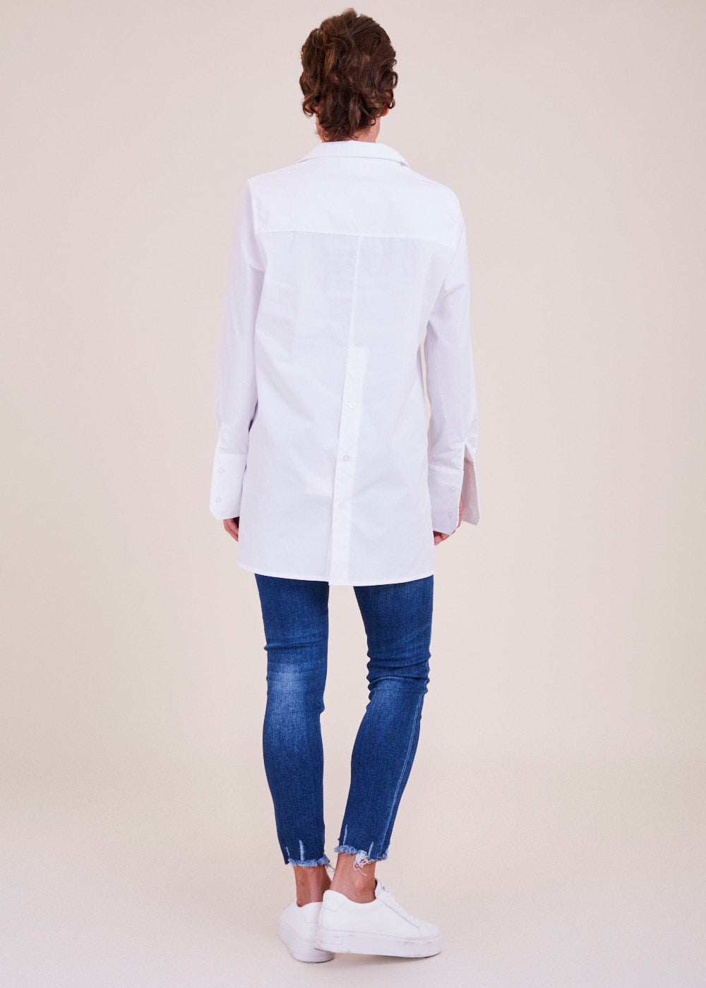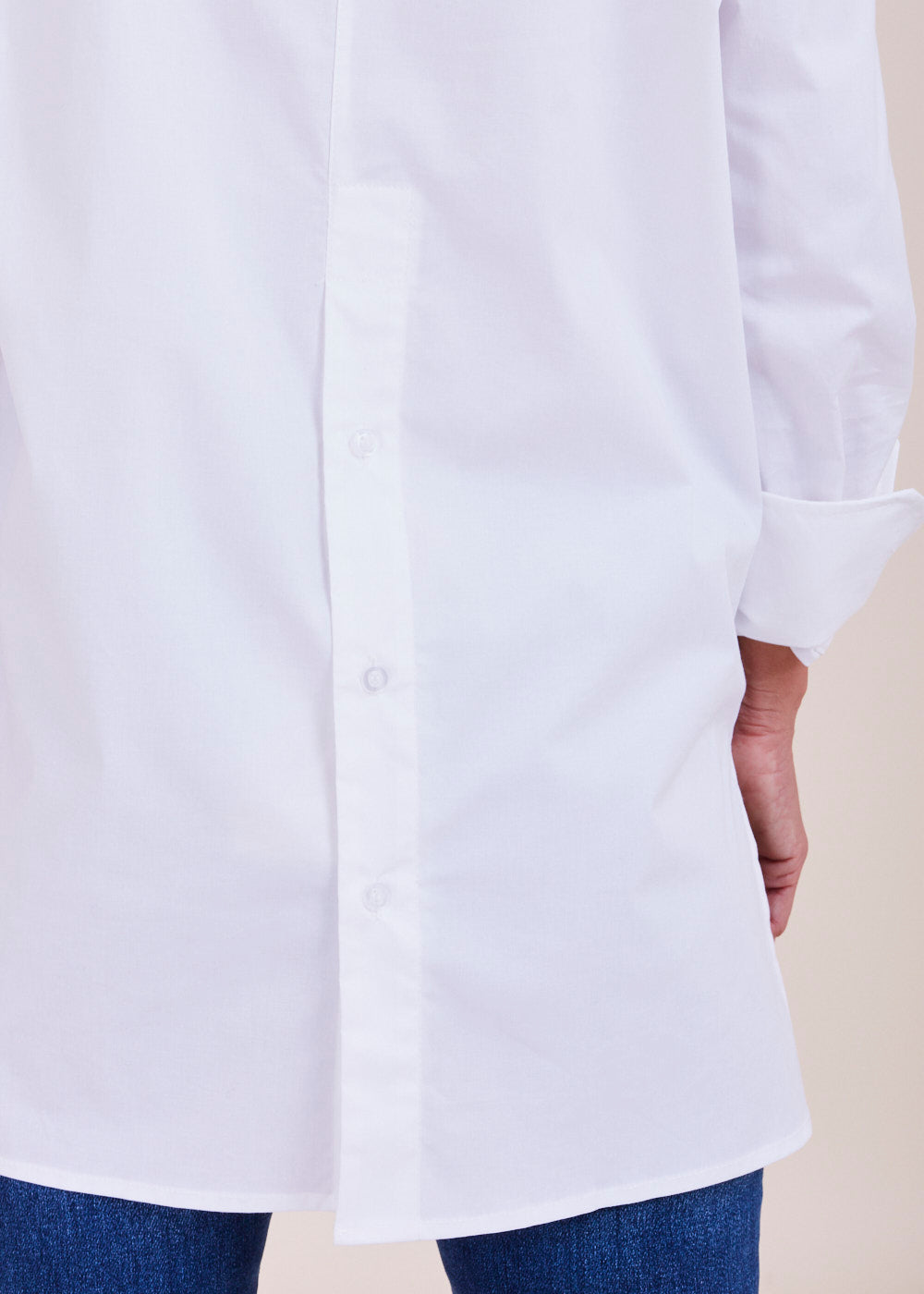 Hemdbluse aus Baumwolle. Modell mit Kragen, Knopfleiste, überschnittenen Schultern und langen Ärmeln mit geknöpften Manschetten. Sie hat seitliche Schlitze und eine Rückenpasse. Mit Schlitz am Rücken der ebenfalls durch eine Knopfleiste geschlossen werden kann.