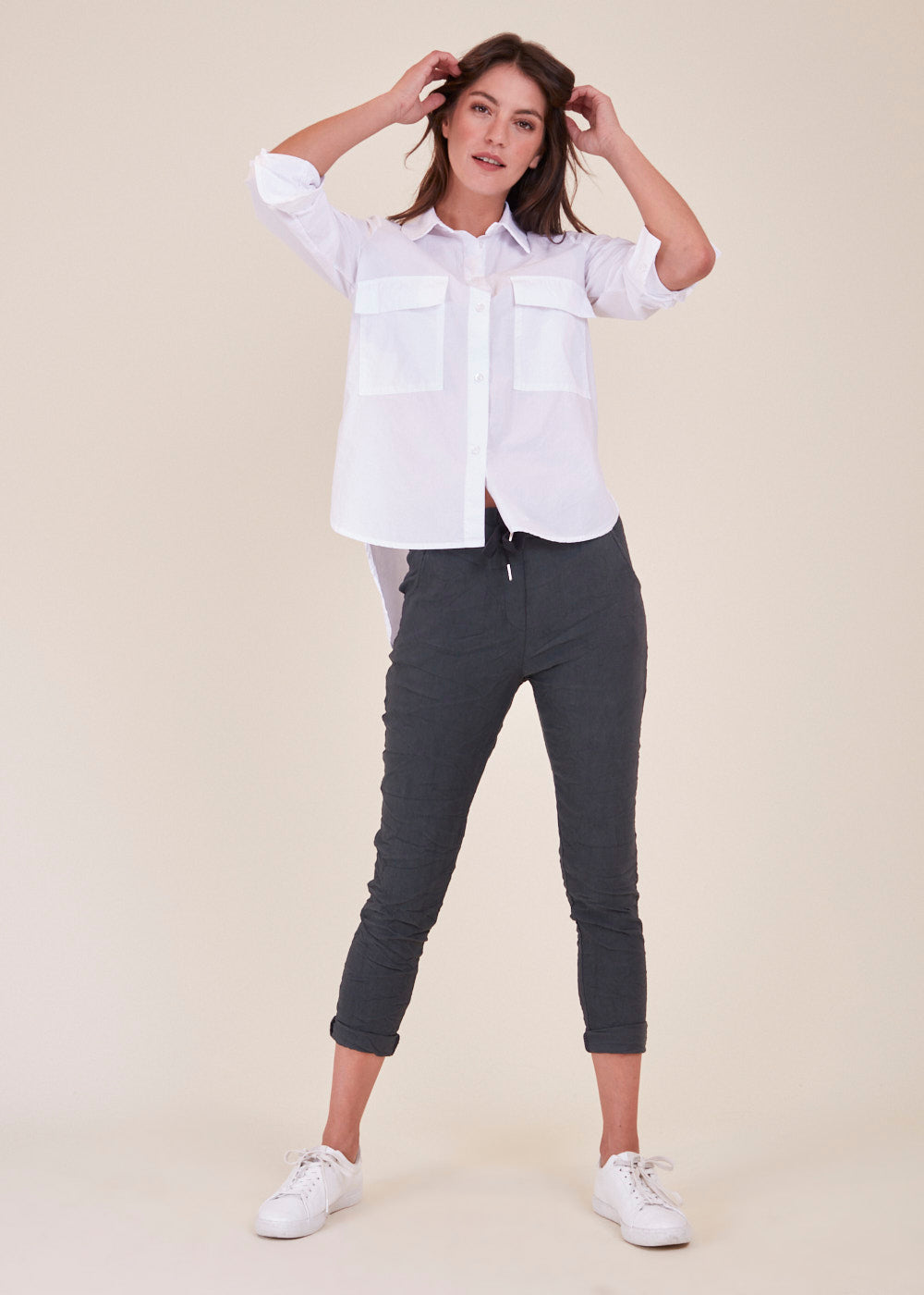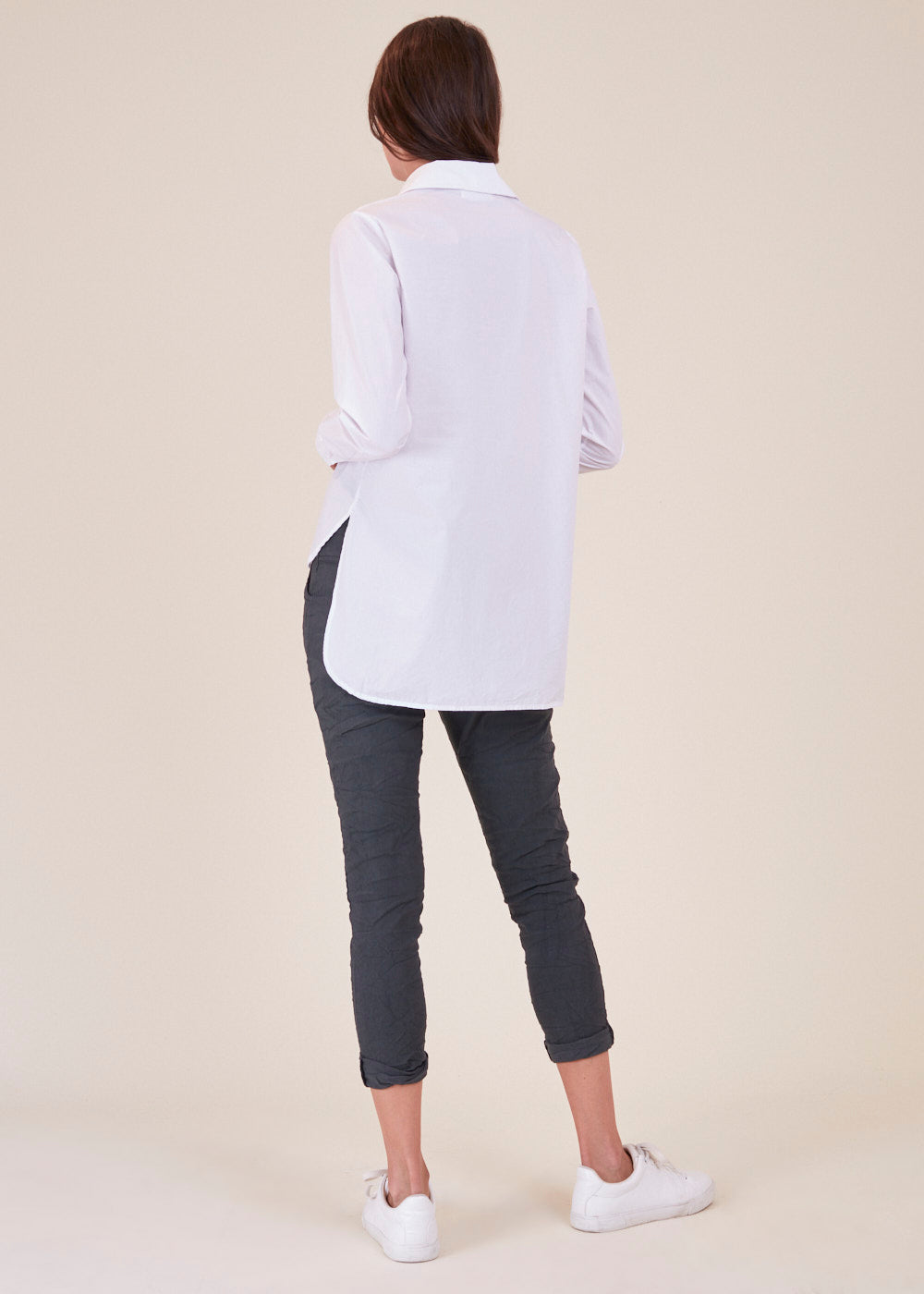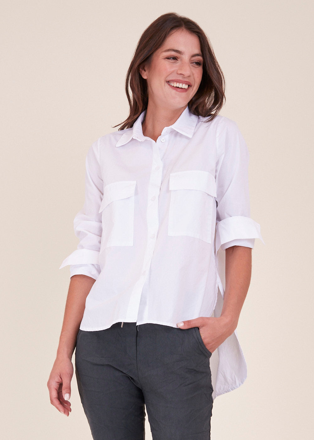 Wundervolle lässig geschnittene Bluse aus Baumwolle mit Hemdkragen und durchgezogener Knopfleiste. Die Bluse hat lange Ärmel, die sich ebenfalls mit Knöpfen verschließen lassen. Die Schultern sind leicht überschnitten. Als besonderes Highlight besitzt diese Bluse zwei Brusttaschen und ein verlängertes Rückenteil.