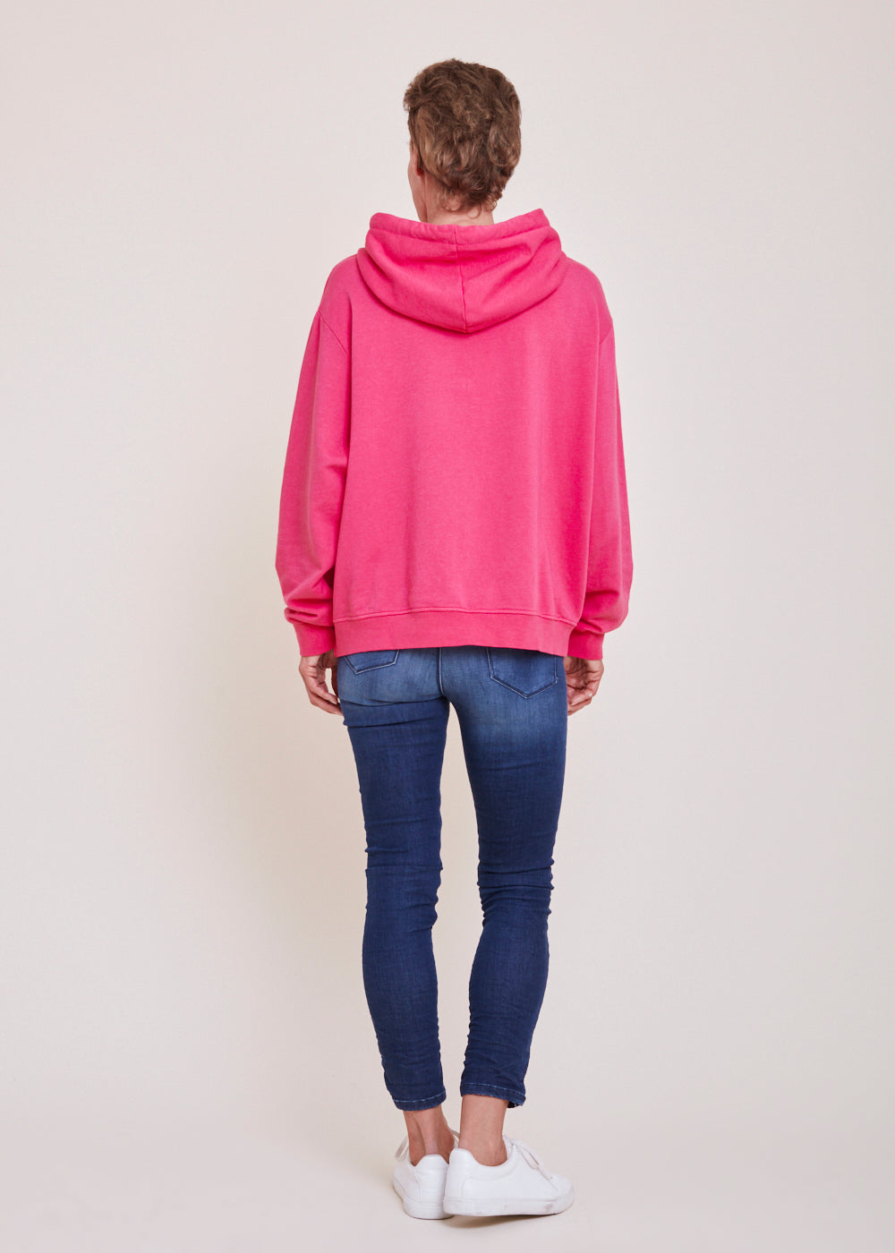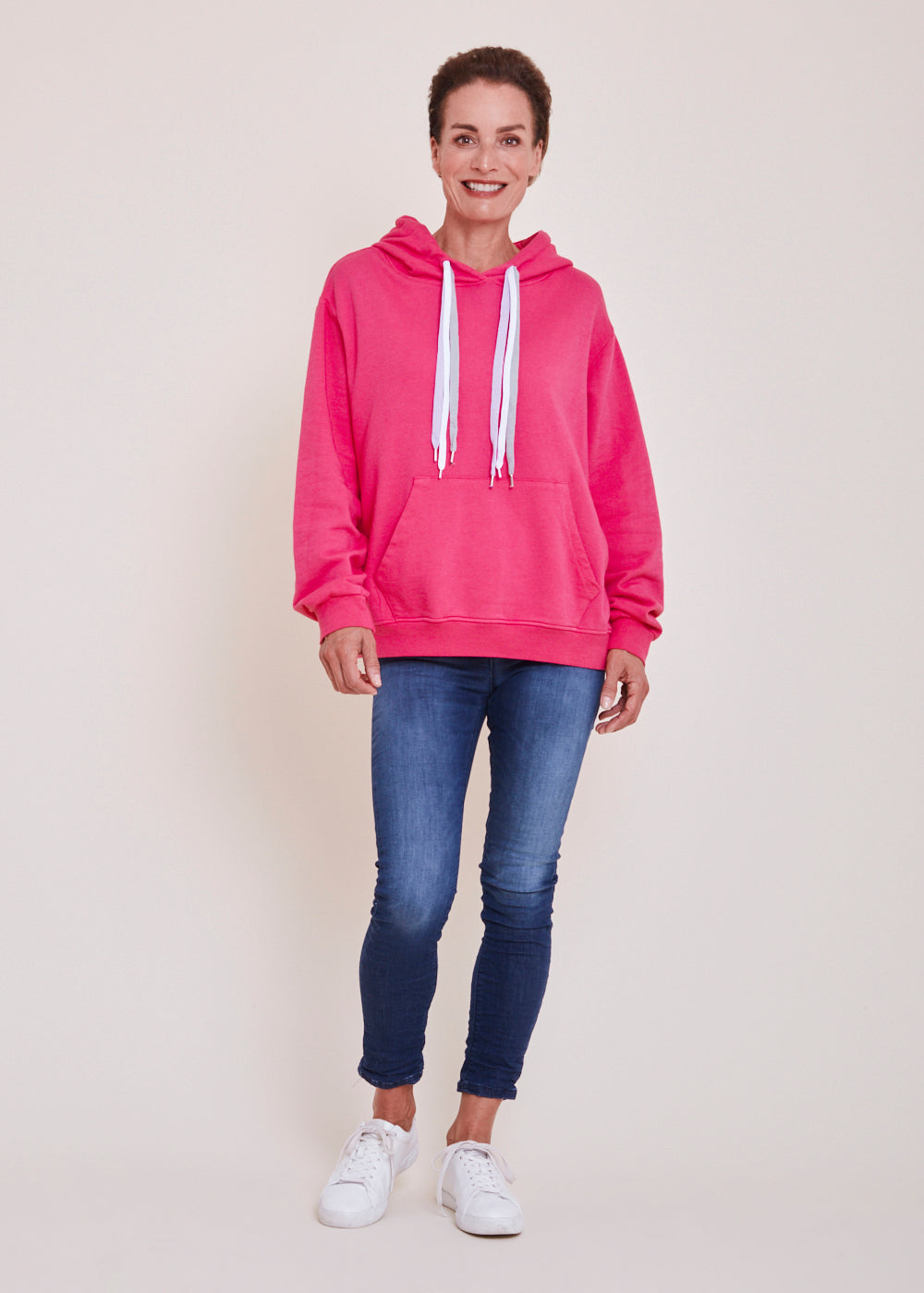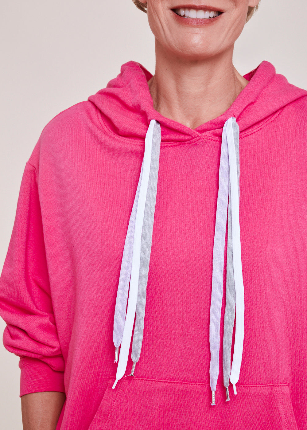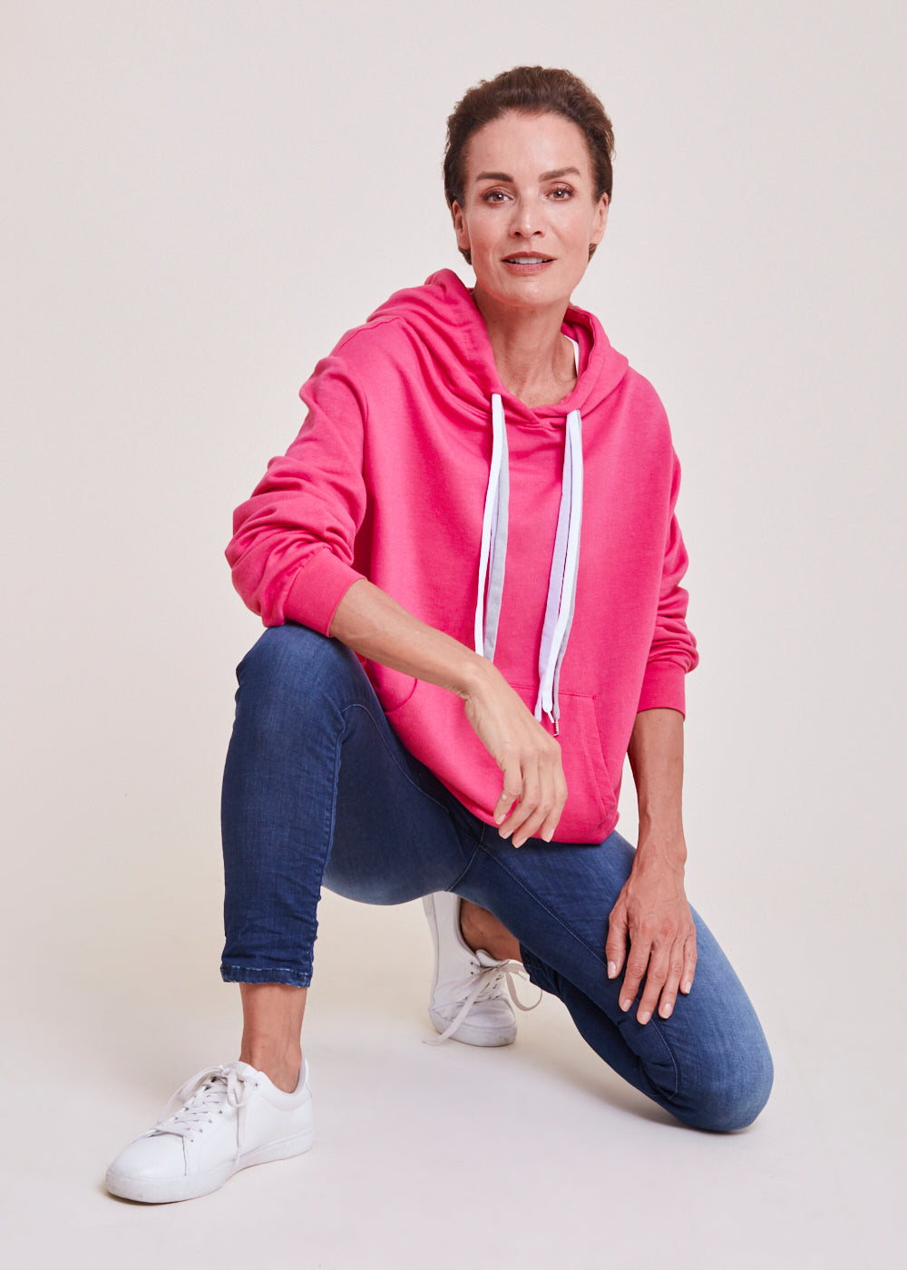 Sweatshirt mit Kapuze in der Trendfarbe Fuchsia. Die langen Ärmel und der Saumen sind mit einem Rippenbündchen gezäumt. Die drei verschiedenen farbigen Schmuckbänder geben dem Pullover das gewisse Extra.