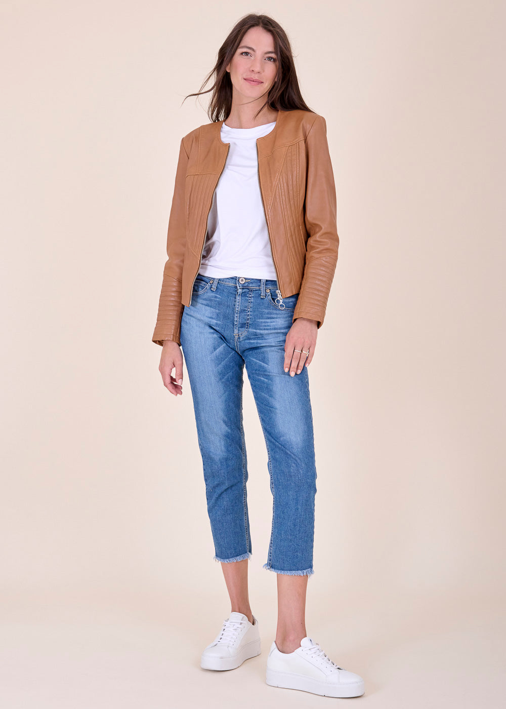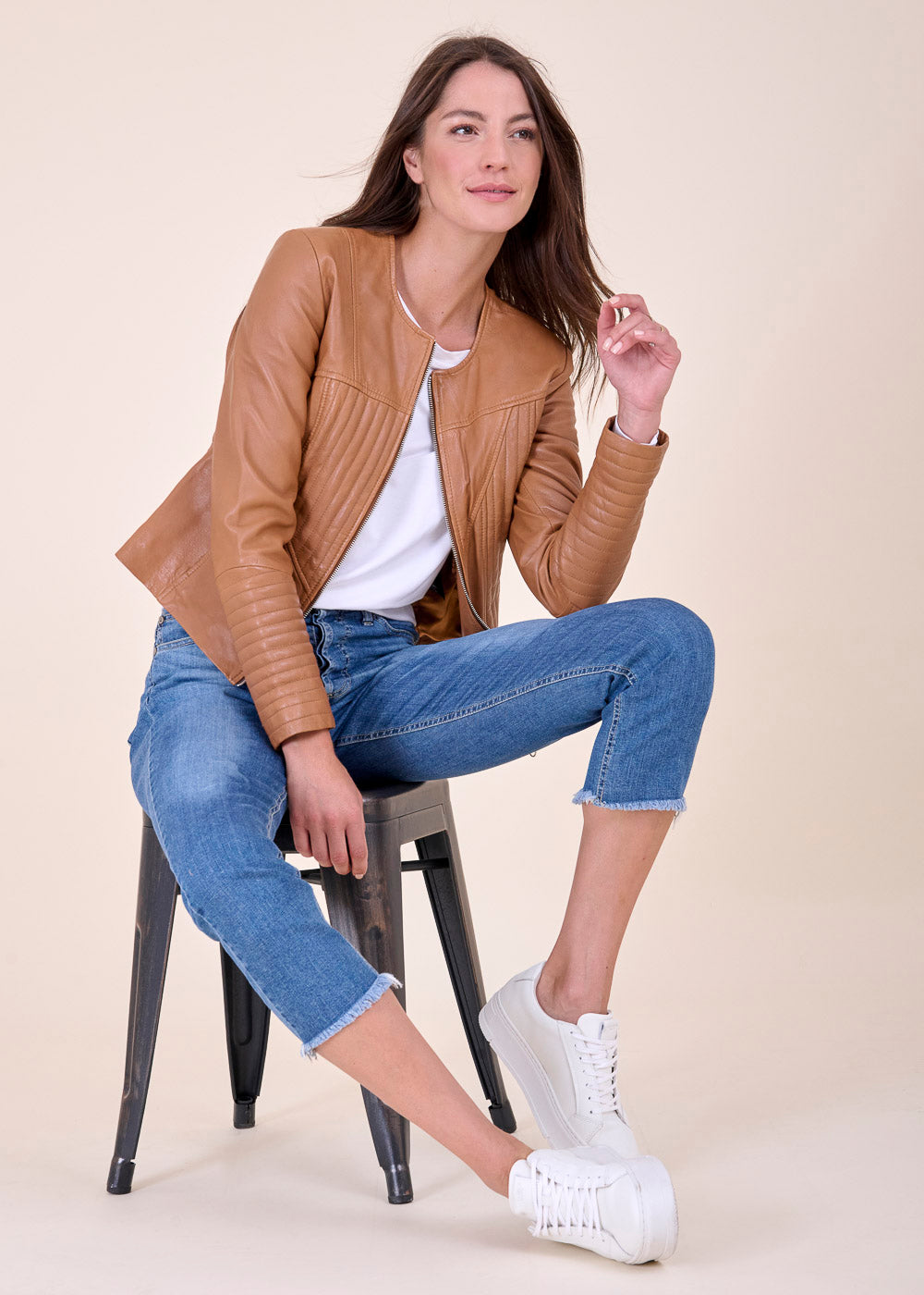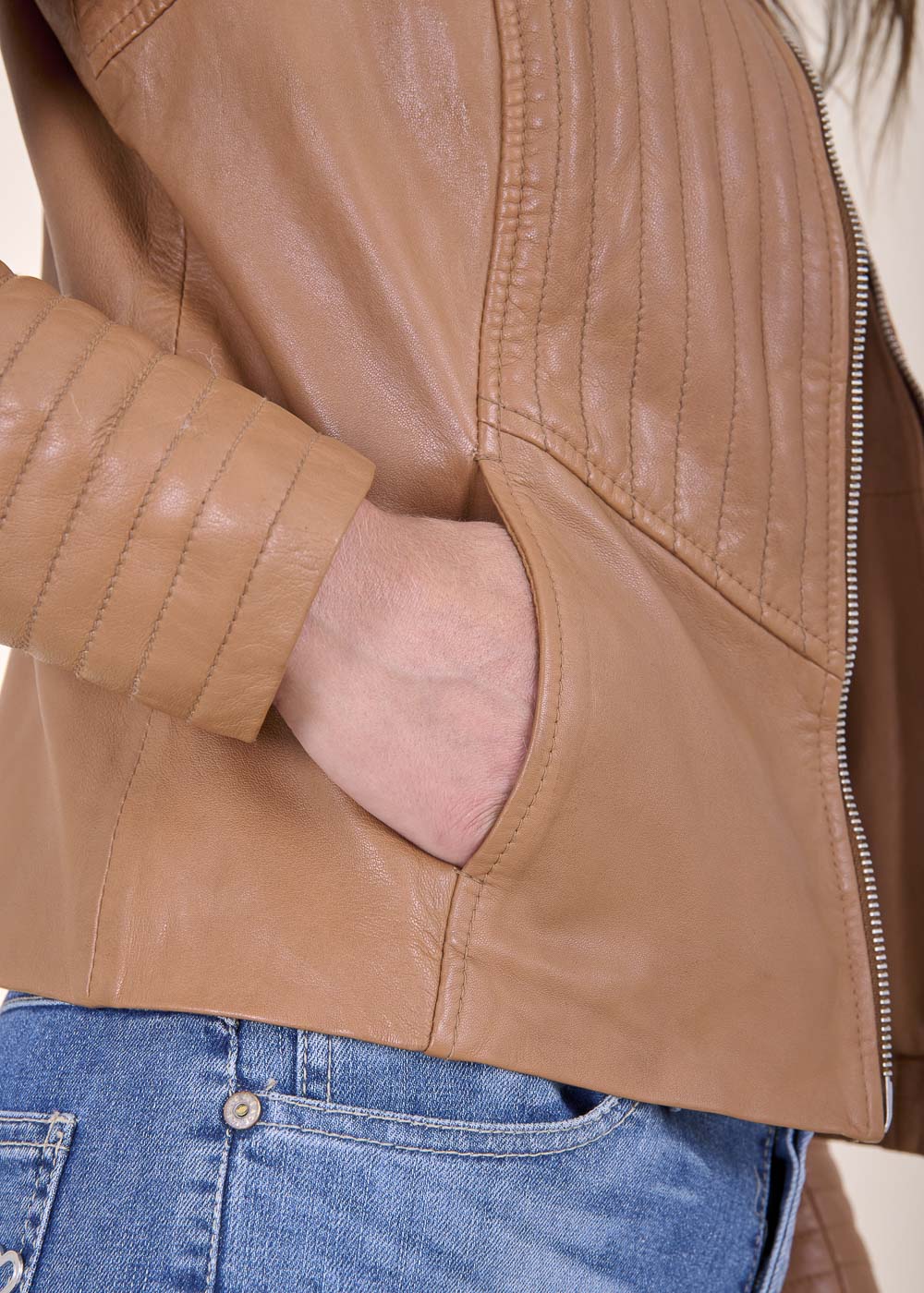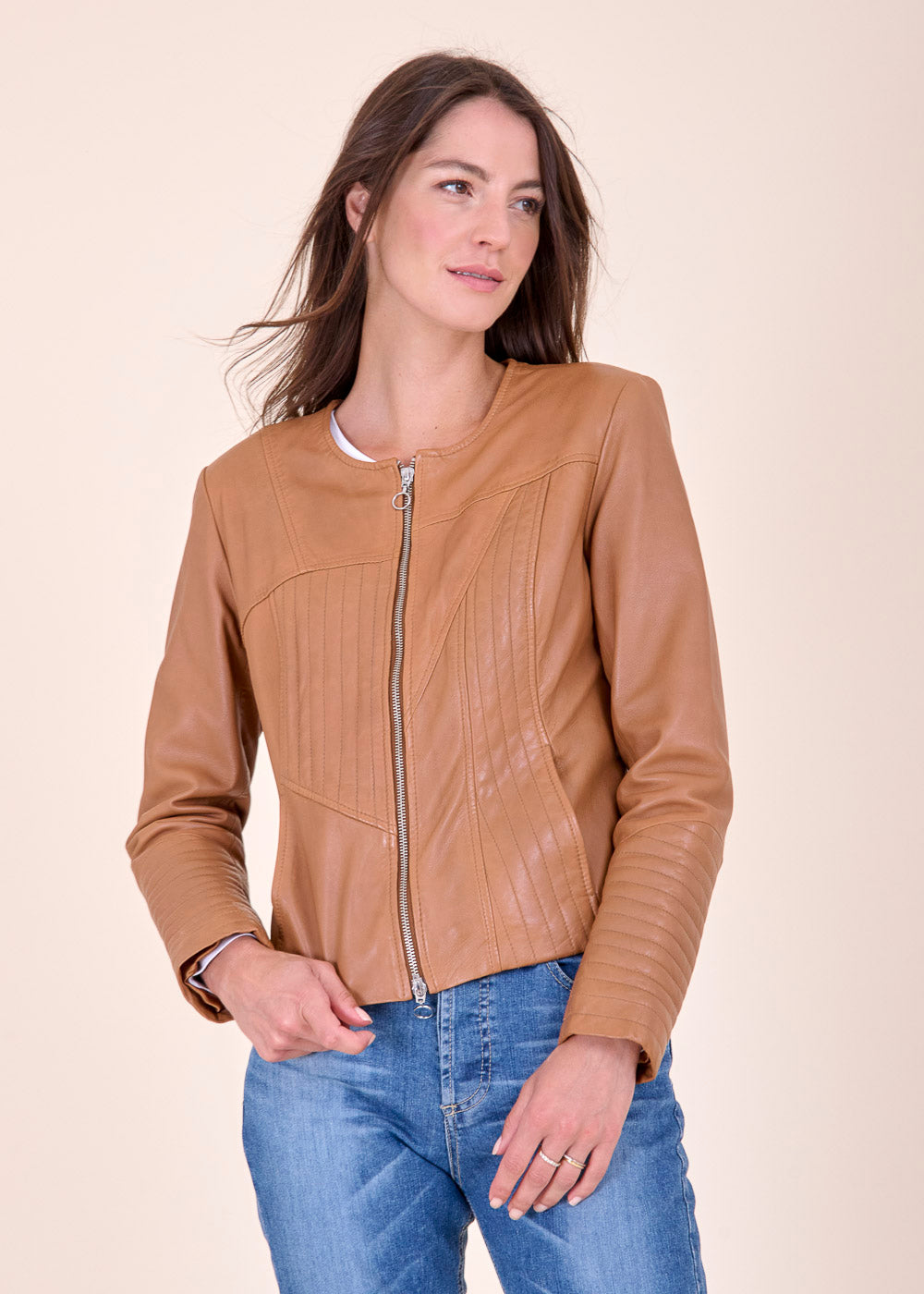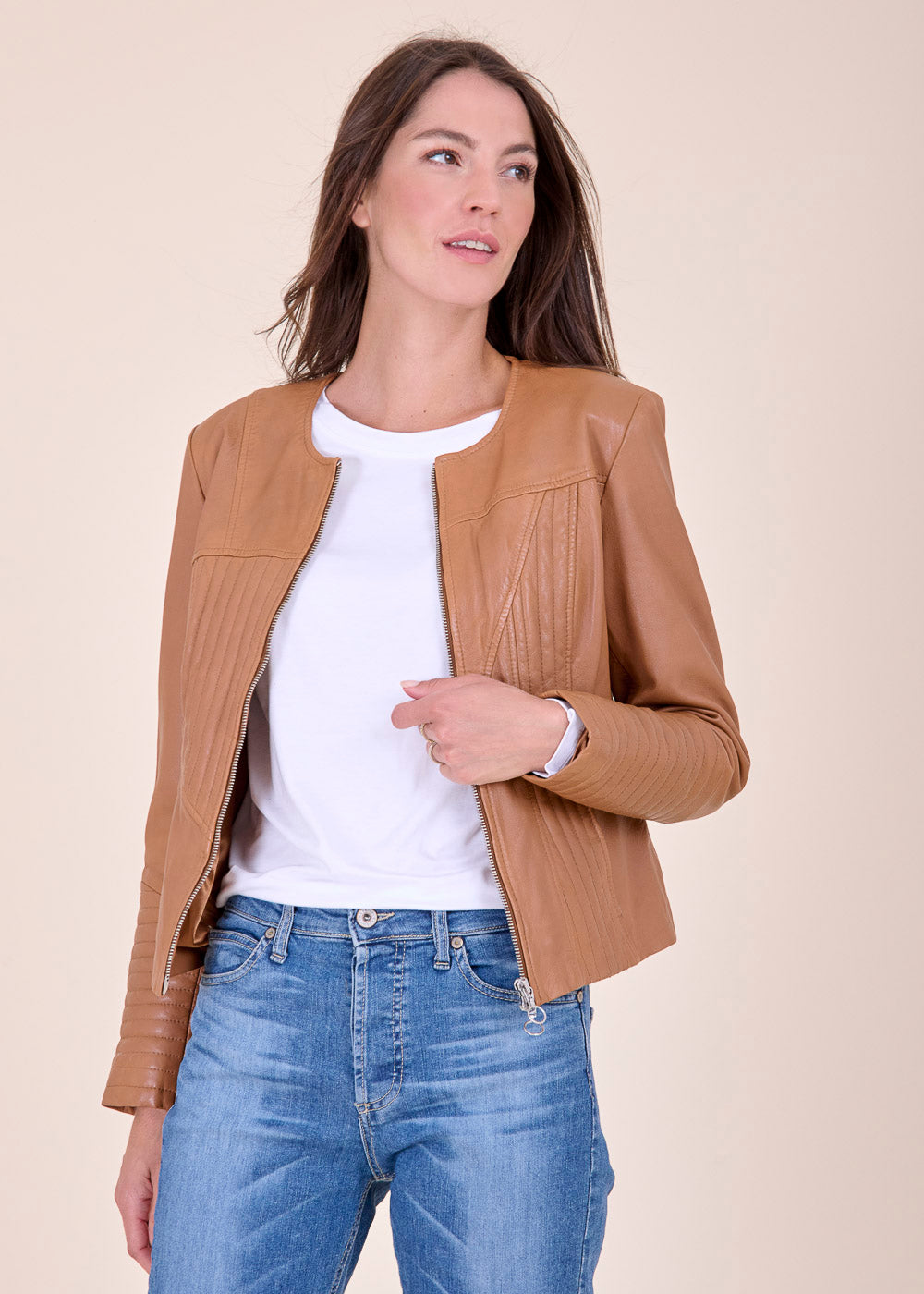 Kürzer geschnittene Lederjacke mit besonderen Nähten. Sie ist Figur nah geschnitten und hat einen Rundhalsausschnitt. Durch seine Schnittform ist sie das optimale Basic zum drüber werfen. Kombiniere dieses Artikel gerne, mit einem Kleid oder trage sie ganz lässig zur Jeans mit einem Shirt, um es sportiver wirken zu lassen.