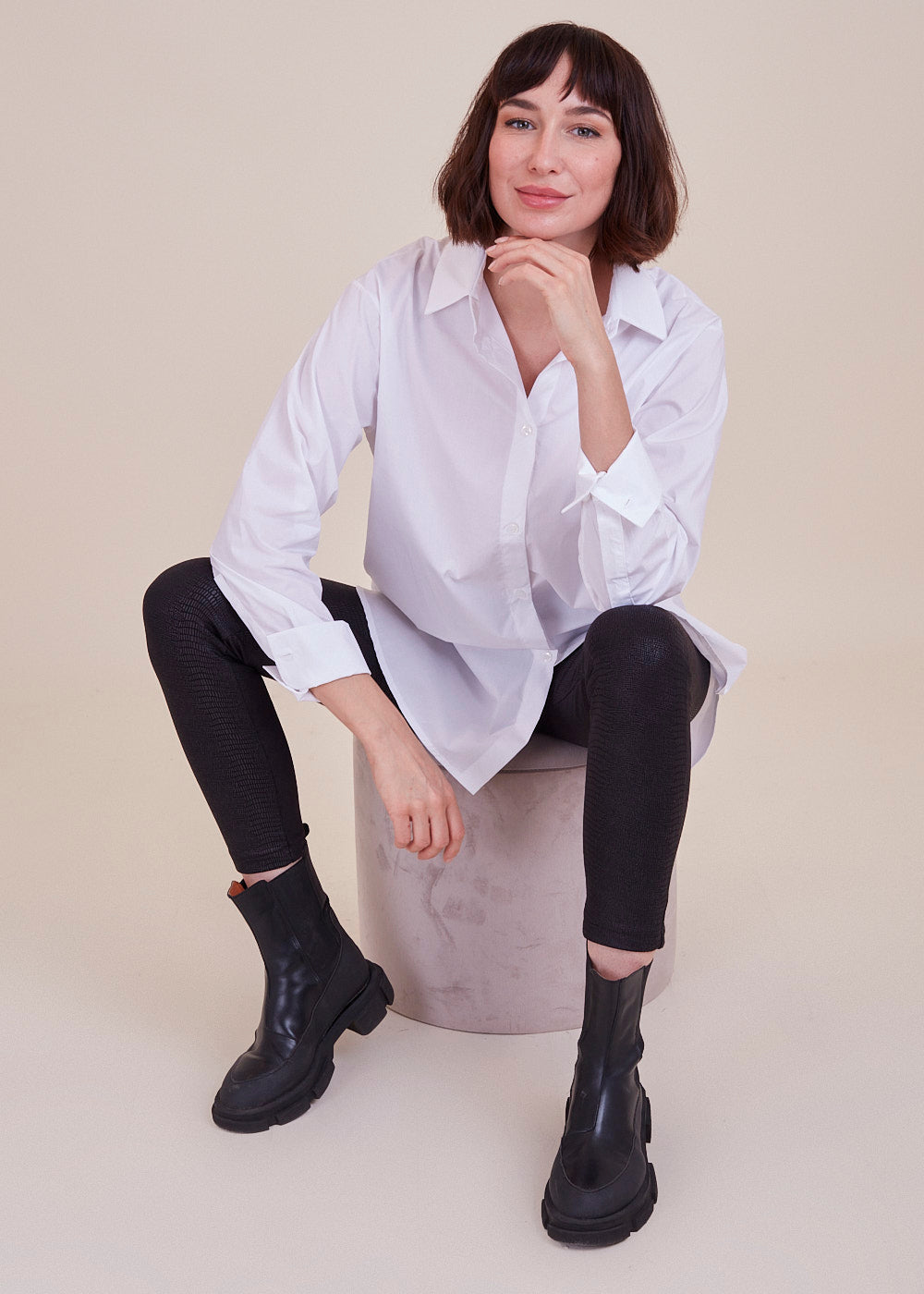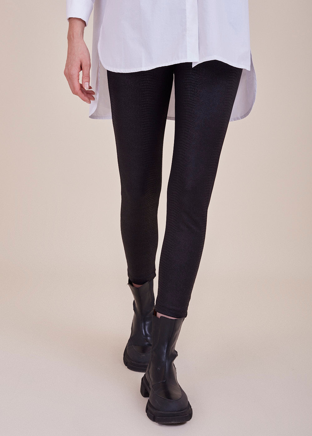 Mit dieser Leggings im Snake Muster setzt du den Maßstab für Trends ganz nach oben. Ihr cooler All Over-Druck im Animal-Design verleiht der Hose einen aufregenden Look. Mit extrahohem Bund, der sich schön weich an deine Körpermitte anschmiegt, werden die Damenleggings zum stylischen It-Piece für besondere Anlässe. Das trageangenehme Baumwollmaterial ist sehr elastisch und gibt dir dadurch viel Bewegungsfreiheit. Ein unifarbenes Pullover und Boots machen den Look komplett.