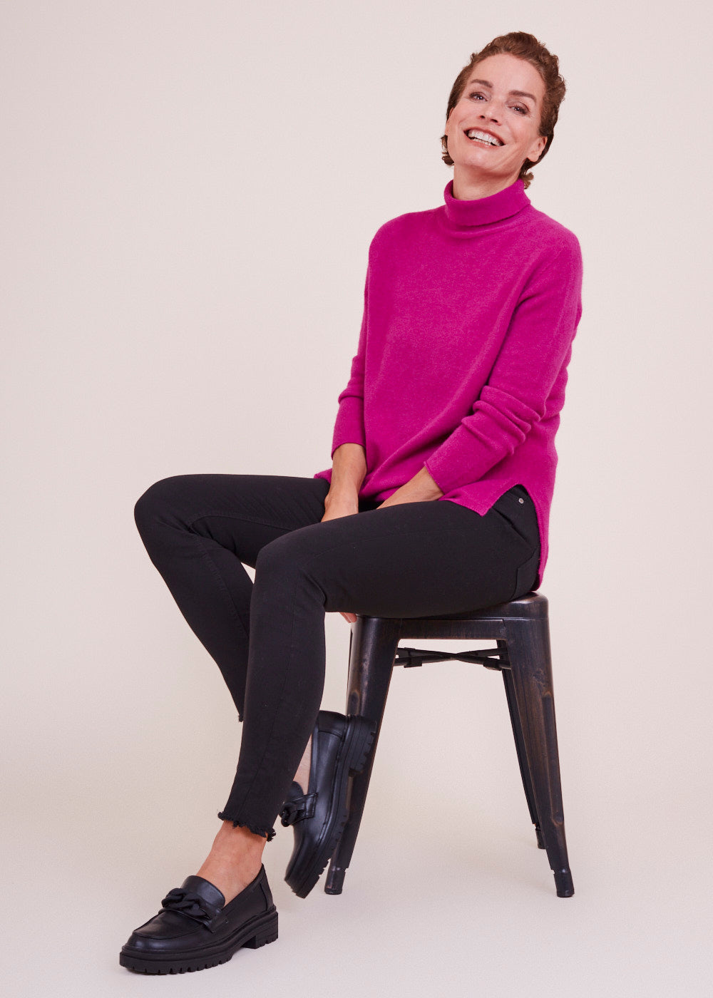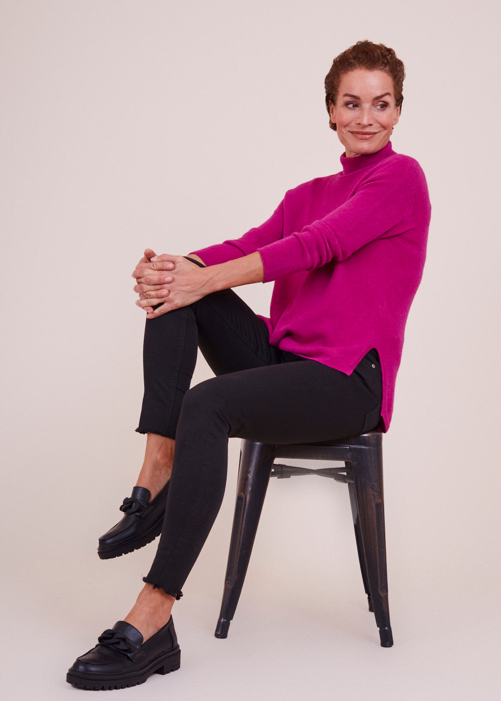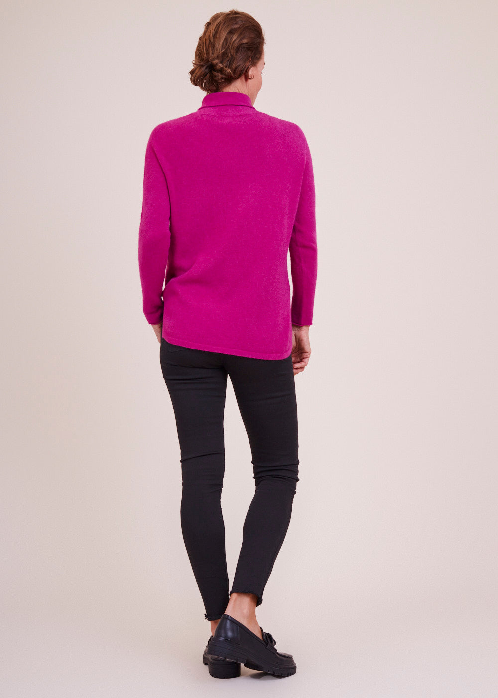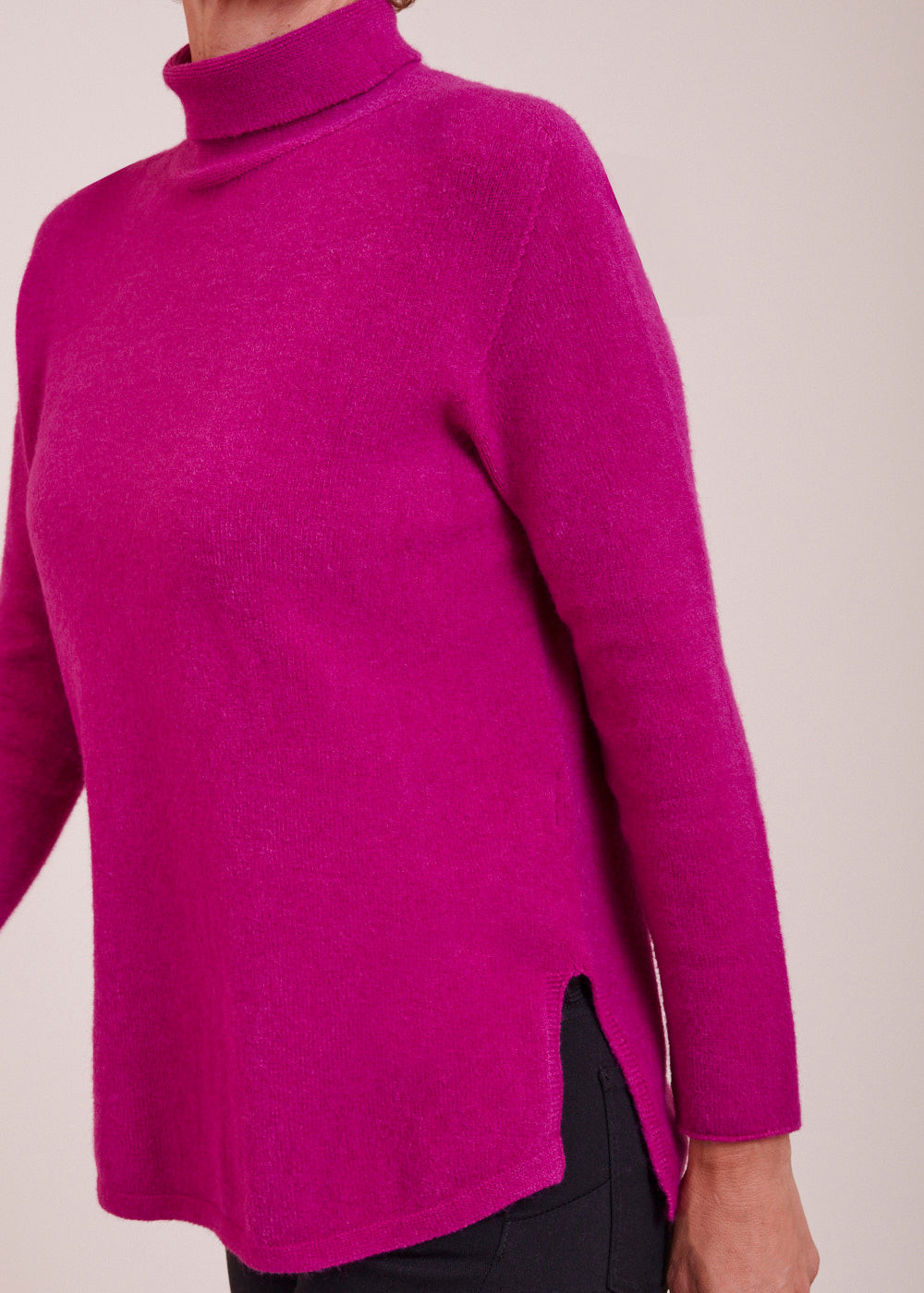Ein Rolli zum Verlieben: Der gestrickte Pullover in der Farbe Fuxia besticht durch sein besonderes Design. Er hat Schlitze an den Seiten und ein leicht verlängertes Rückenteil. Ein kuscheliger und wunderschöner Begleiter.