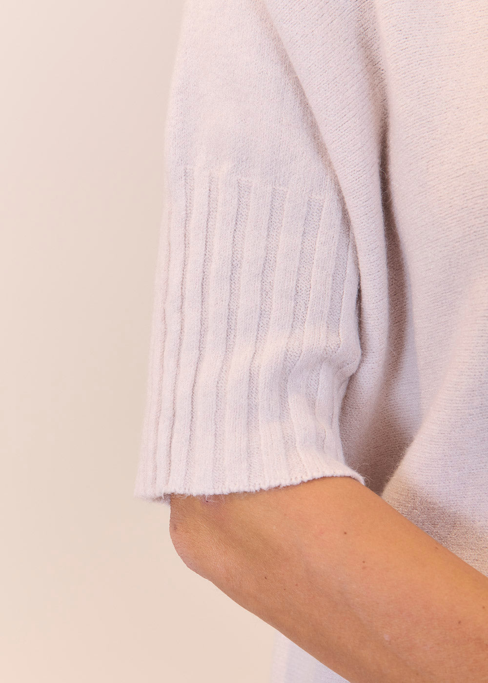 Kurz geschnittener Strickpullover mit Rollkragen aus unserem Kuschelgarn. Er hat ein Rippenbündchen am Kragen und an den Ärmeln. Mit kurz geschnittenen Armen.