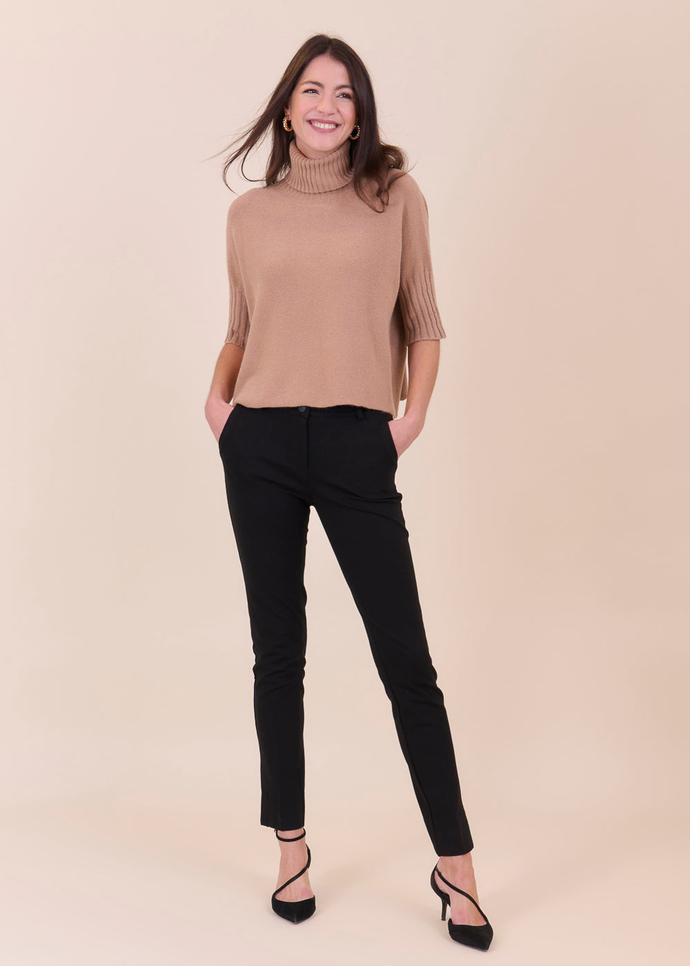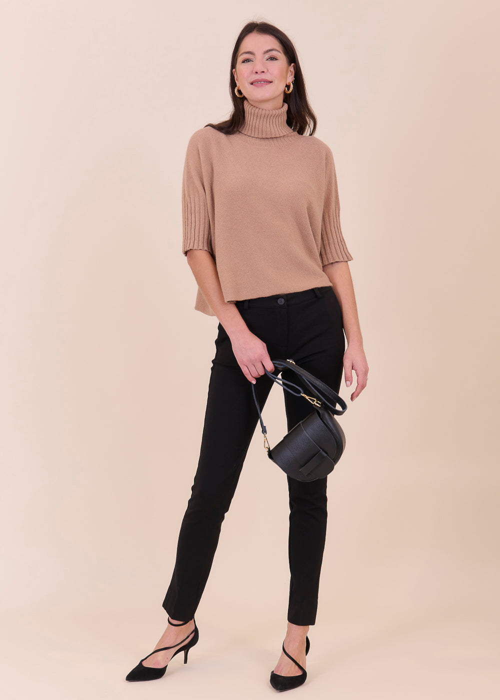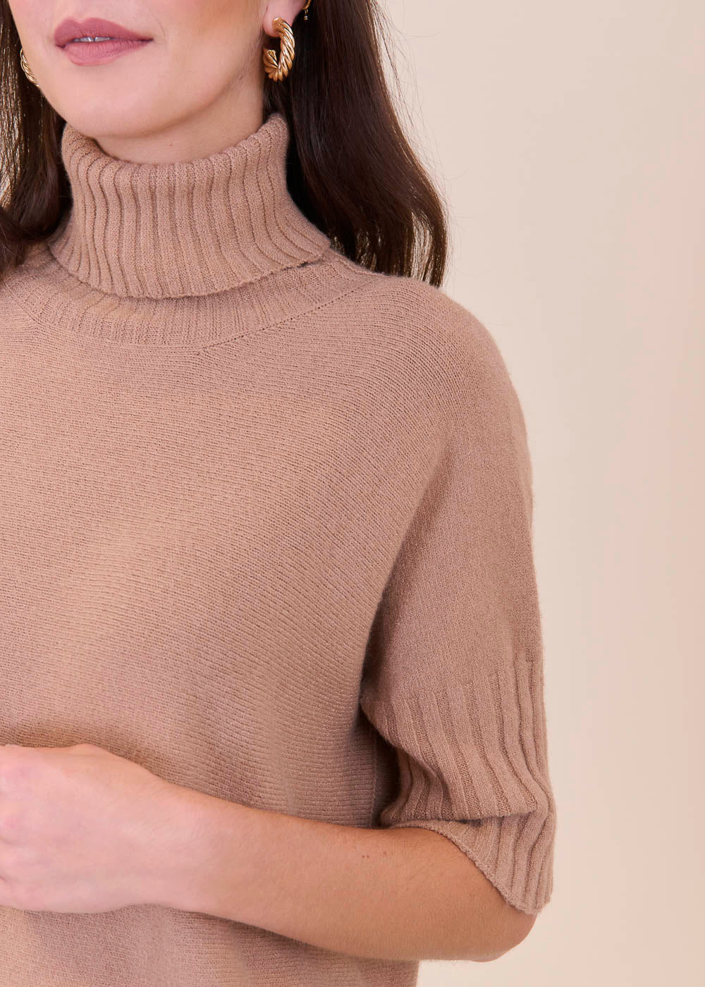 Kurz geschnittener Strickpullover mit Rollkragen aus unserem Kuschelgarn. Er hat ein Rippenbündchen am Kragen und an den Ärmeln. Mit kurz geschnittenen Armen.