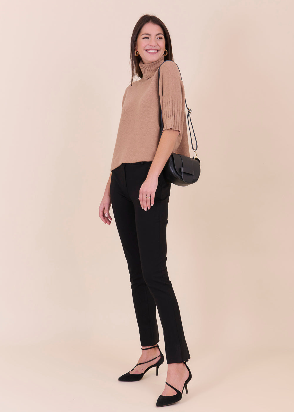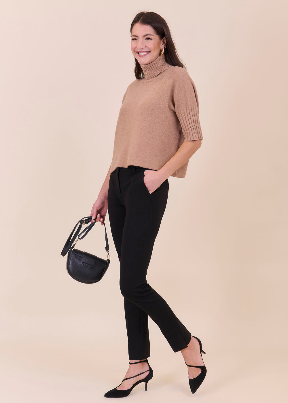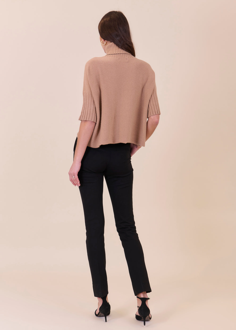 Kurz geschnittener Strickpullover mit Rollkragen aus unserem Kuschelgarn. Er hat ein Rippenbündchen am Kragen und an den Ärmeln. Mit kurz geschnittenen Armen.