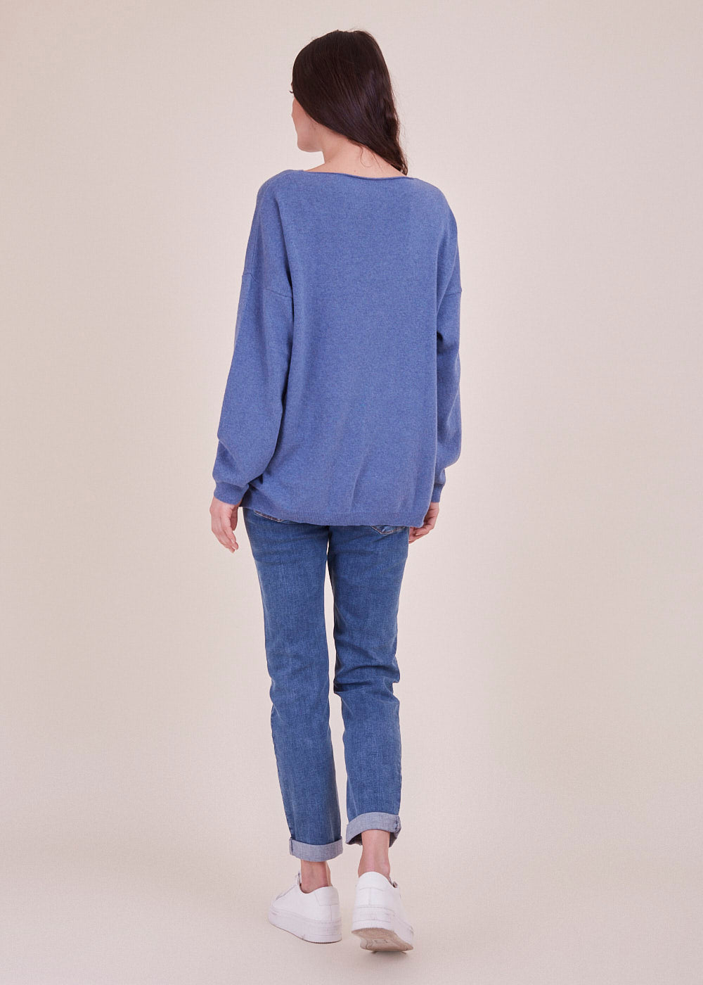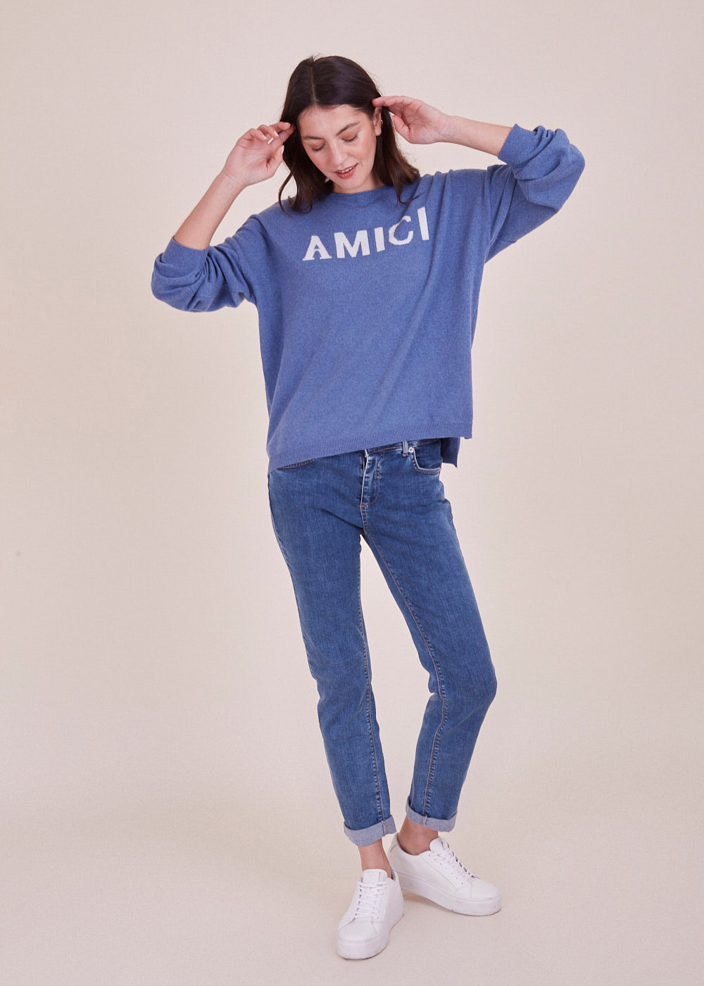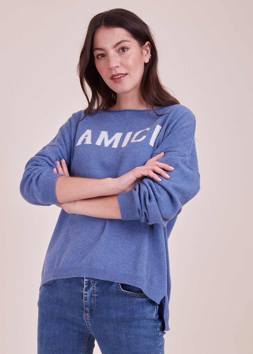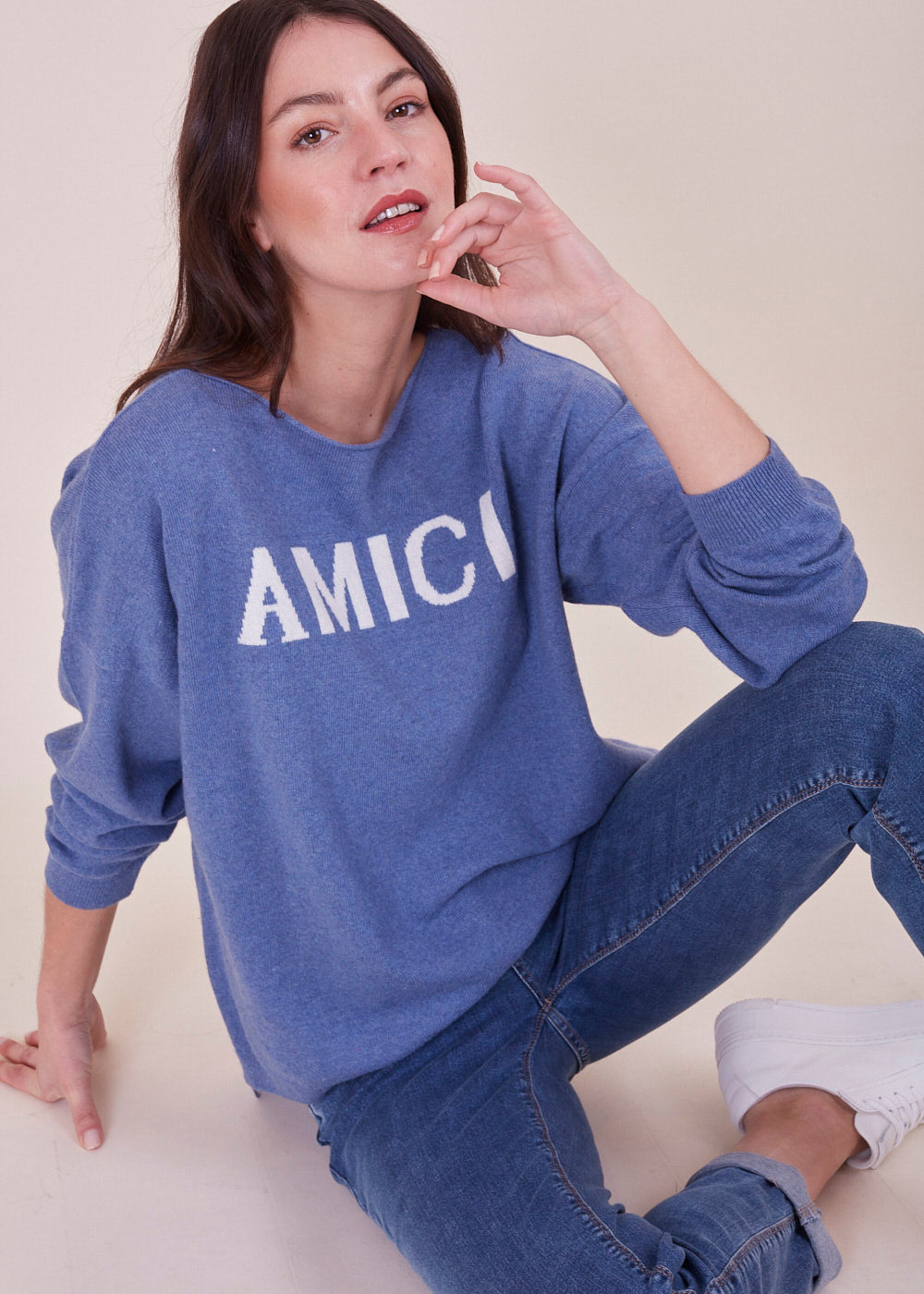 Kuscheliger Pullover mit langem Ärmeln und italienischem Print. Der Pullover hat einen leichten Rundhalsausschnitt und überschnittene Schultern. Die Ärmeln und Bund sind durch Rippenstrick gezäumt.