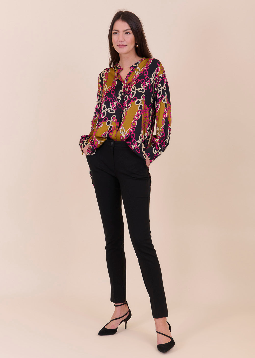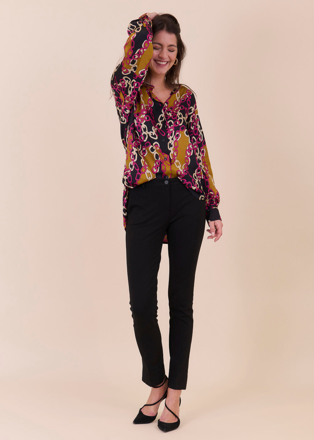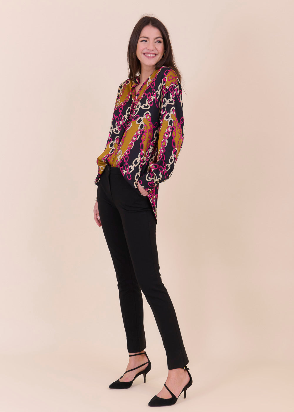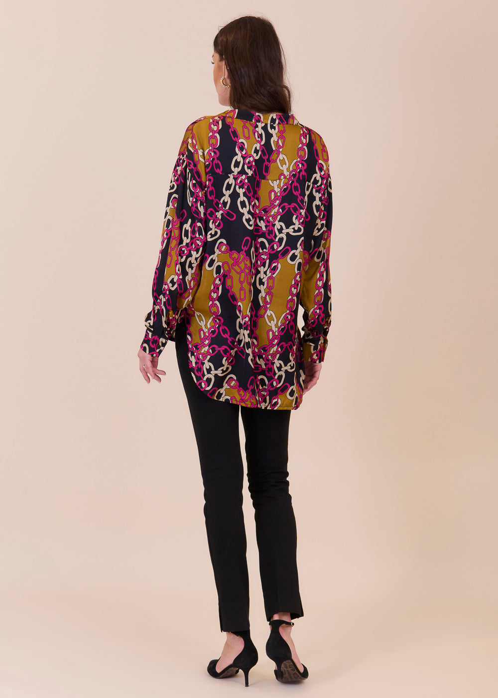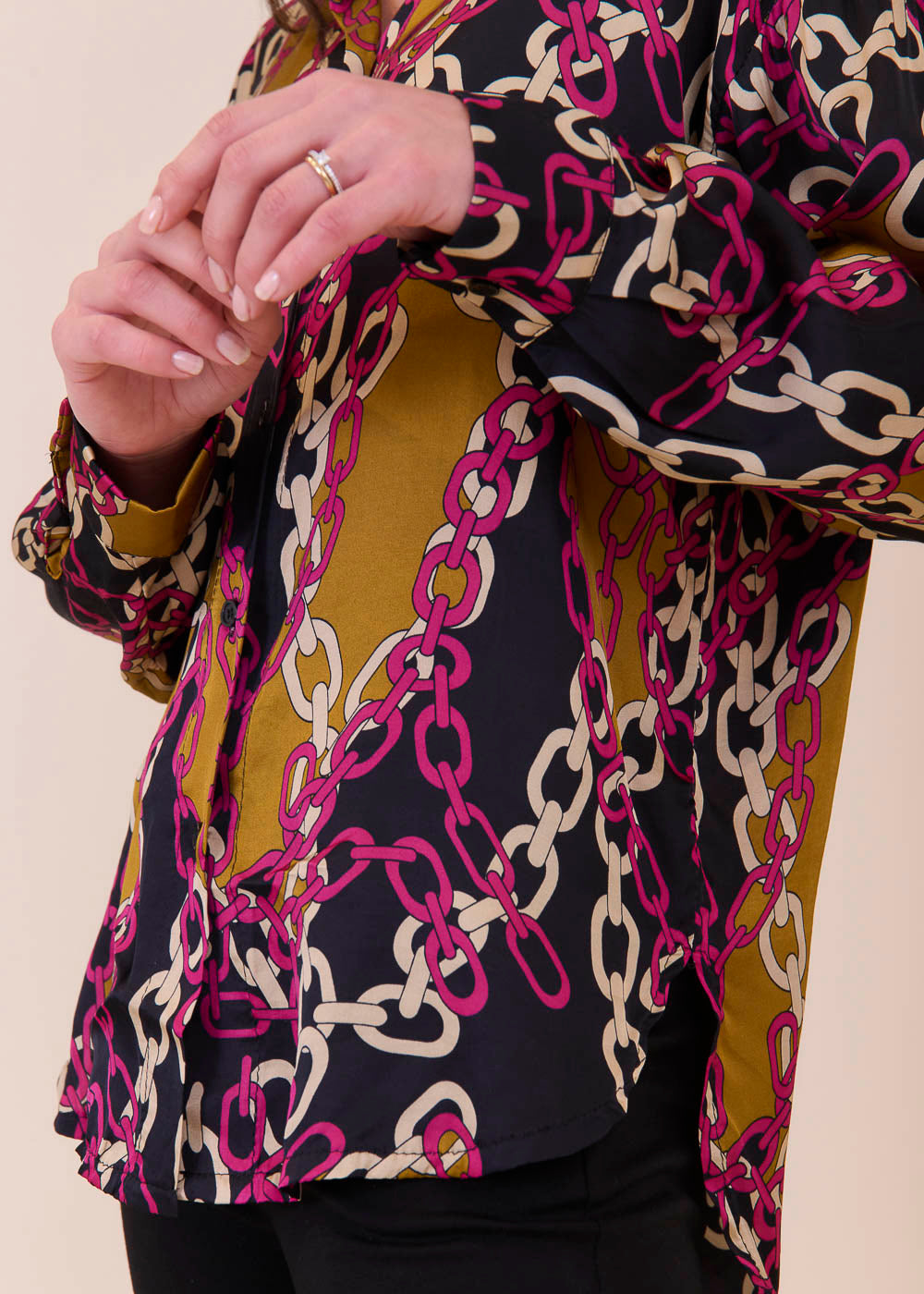 Fließende modische, bedruckte Tunika mit Kettenmuster aus einem großartigen Viskosematerial. Etwas länger und legerer geschnitten mit durchgängiger Knopfleiste und Manschette an den Armen. In den neuen Trendfarbe und absoluter Hingucker.