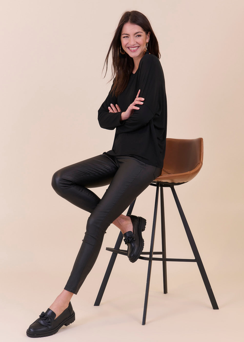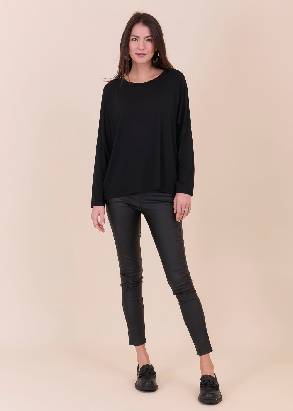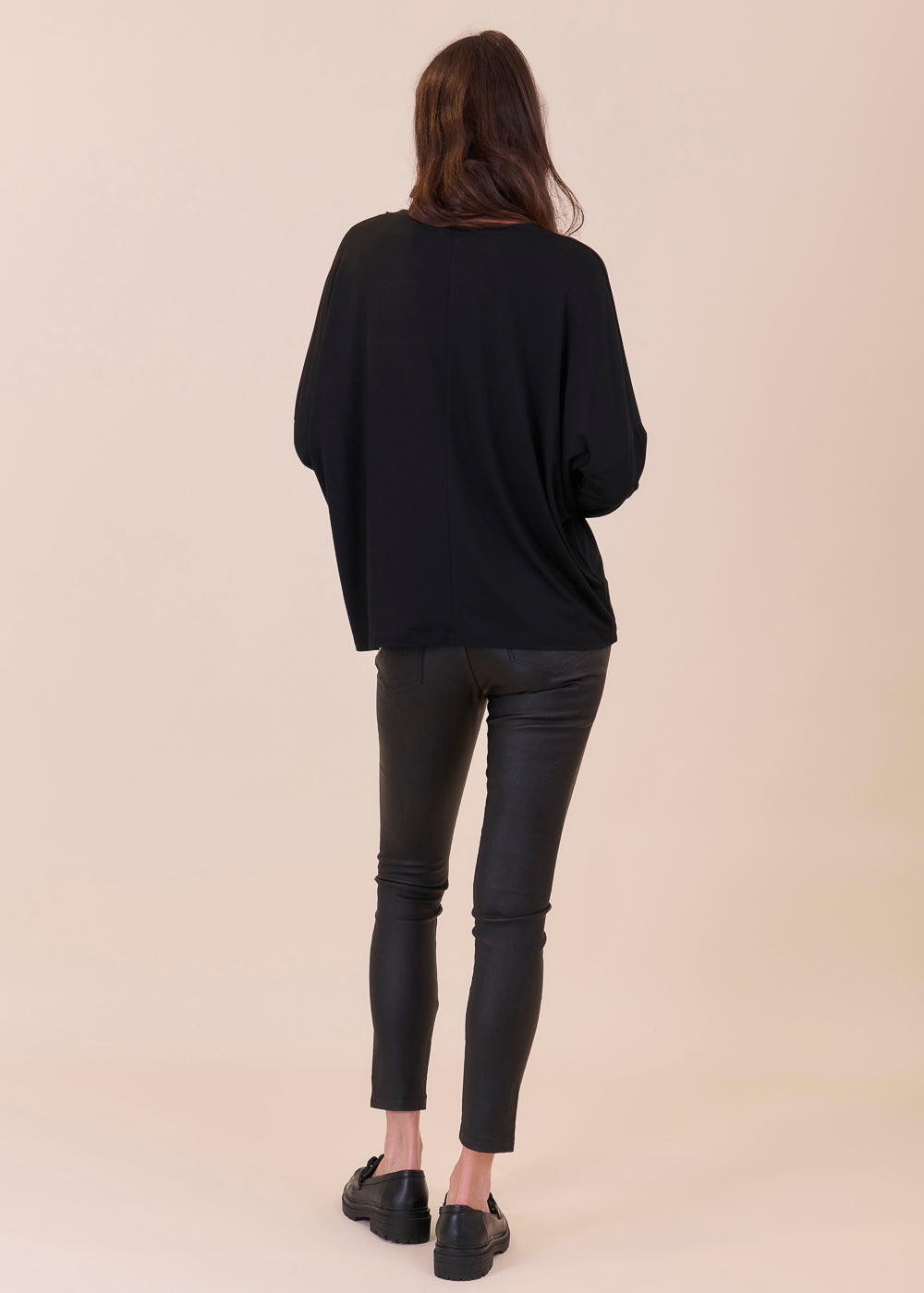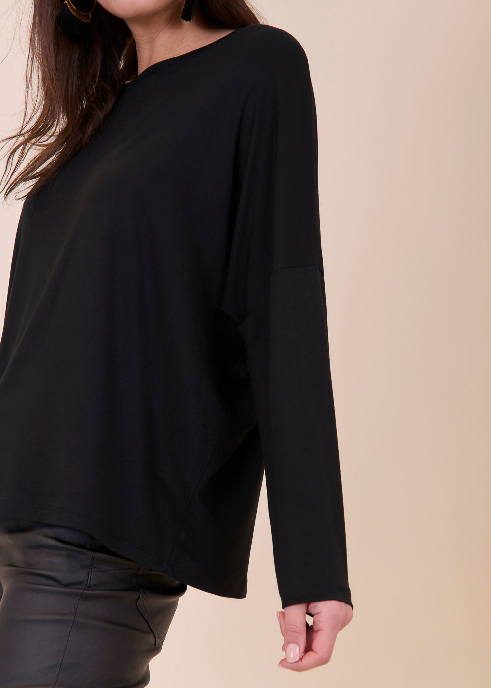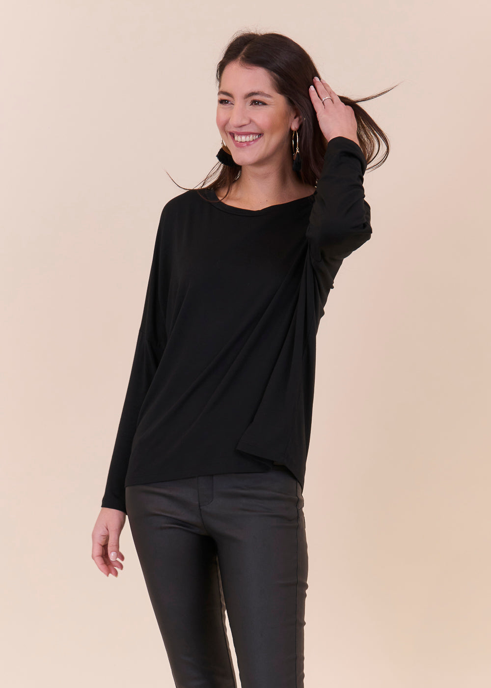 Lässig geschnittenes Shirt aus einer angenehmen Viskose Ware. Es hat einen kastenförmigen Schnitt mit überschnittenen Schultern und einem langen Arm. Ein absolutes Wohlfühlteil mit vielseitigen Kombinationsmöglichkeiten.