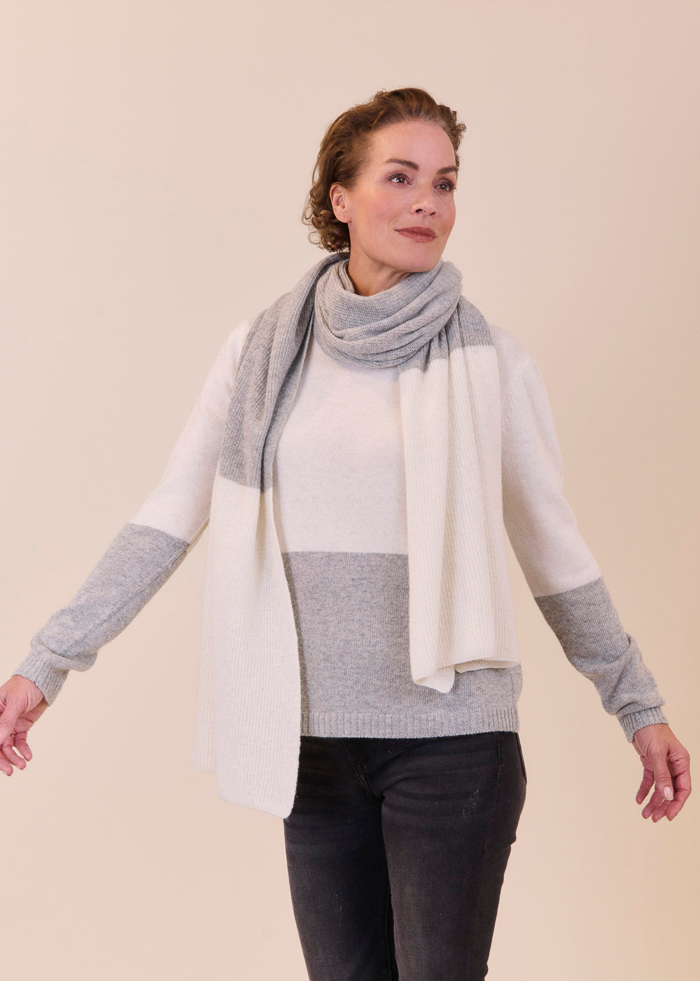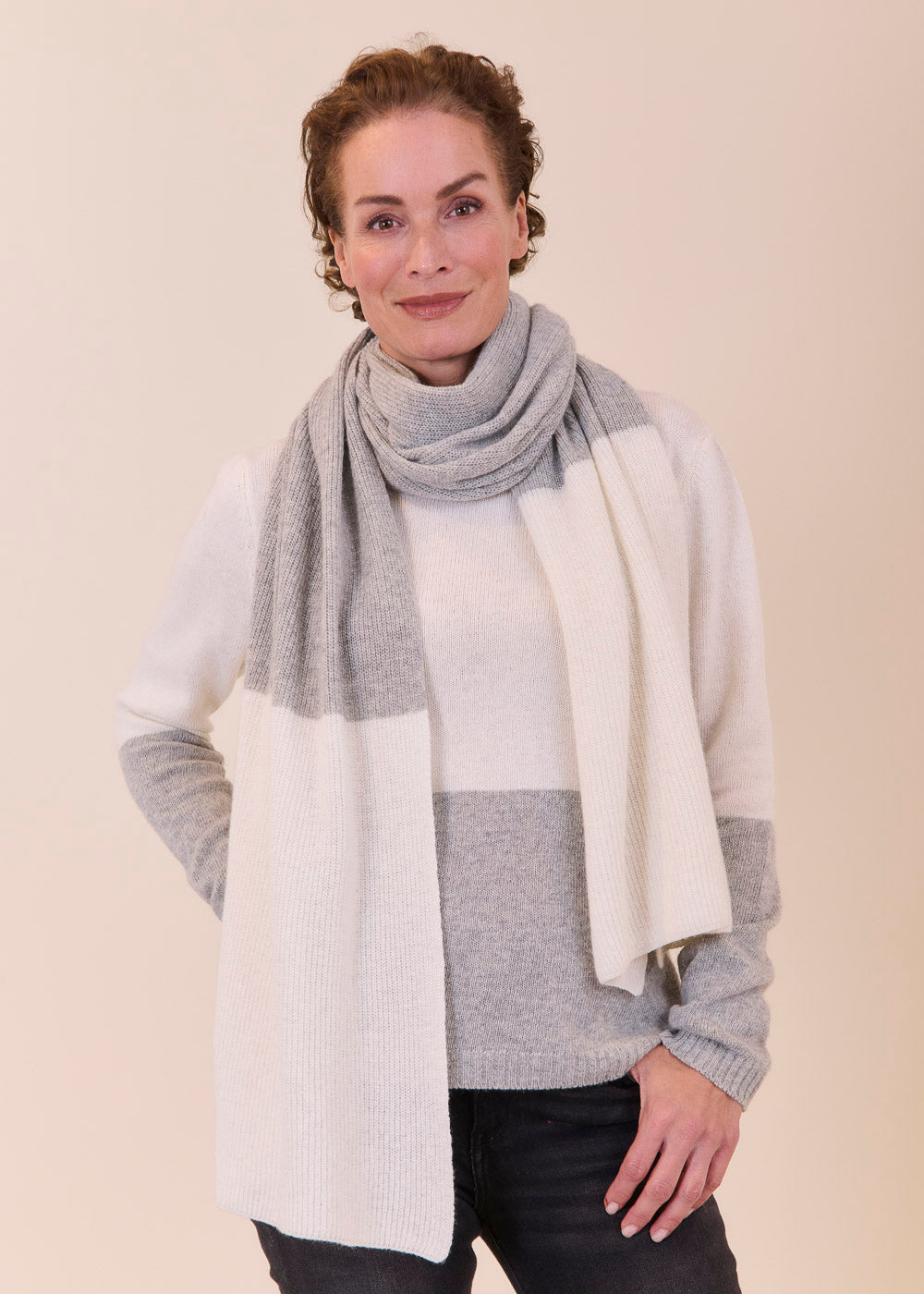 Besonderer Schal aus einem Materialmix im Strick Design. Durch seine Zweifarbigkeit ist er ein besonderer Hingucker. Mit dem kuschelig weichen Schal kannst du dein Outfit ganz einfach vervollständigen und hast gleichzeitig einen großartigen Begleiter für Reisen und kühlere Tage dabei. Wir haben auch noch den passenden Pullover in unserem Shop.