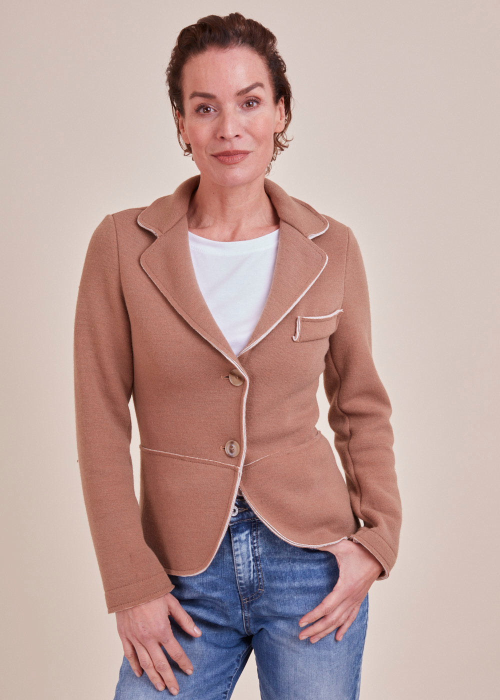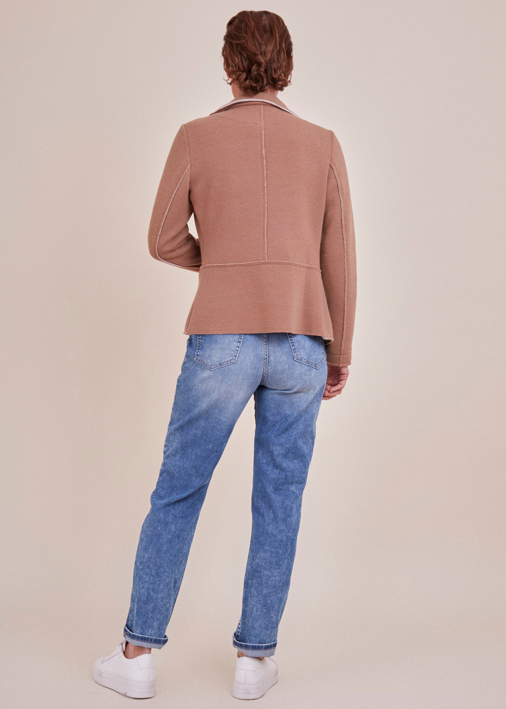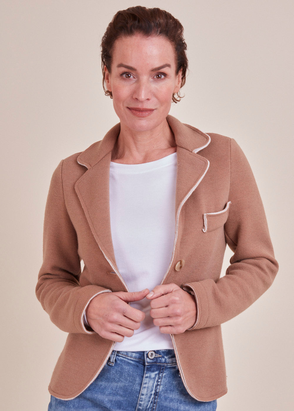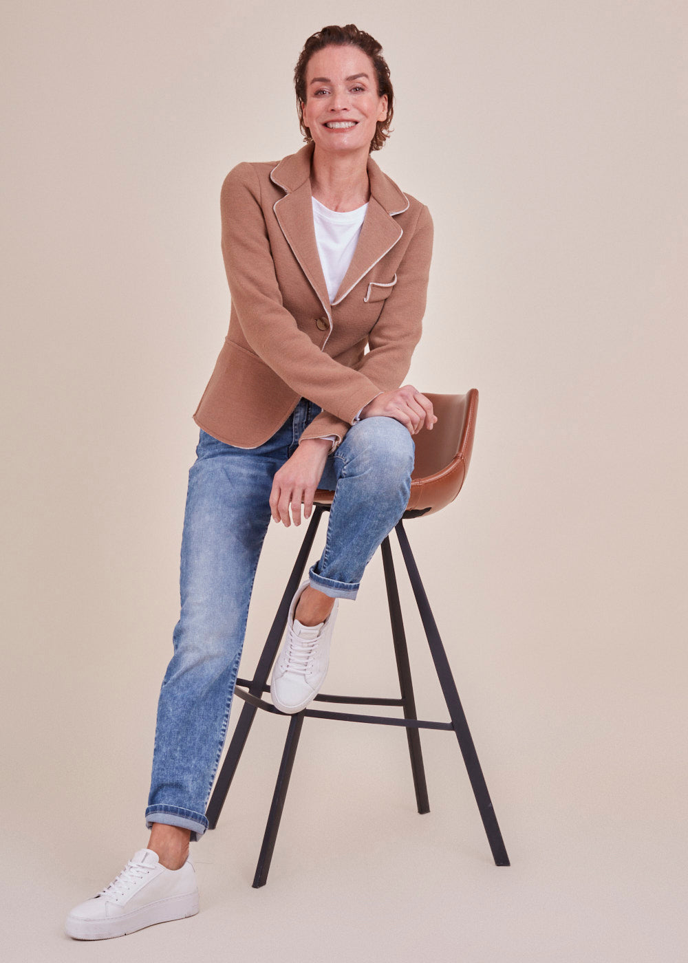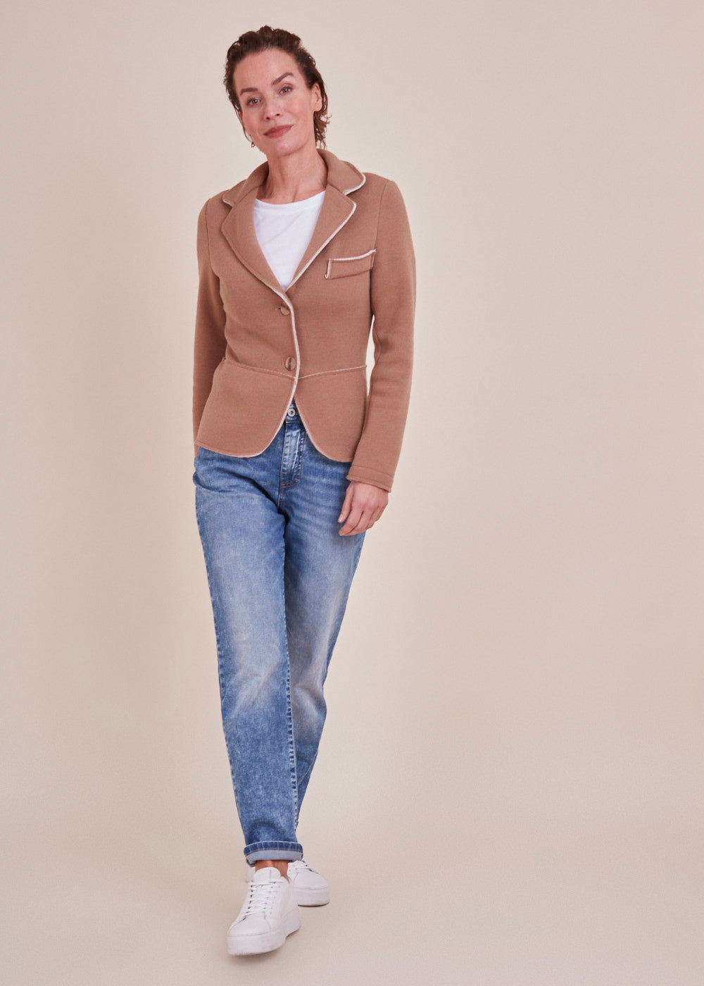 In jeder Situation gut aussehen – mit diesem Strickblazer ist das überhaupt kein Problem. Der besondere Blazer mit seinen offenen andersfarbigen Nähten ist ein echtes Highlight. Er hat einen Reverskragen. Darüber hinaus ist er ist gerade geschnitten. Langer Ärmel mit geraden Abschlusses. Hergestellt aus einem Baumwoll-Elasthan Material. Schöne Accessoires, gepflegte Schuhe und die passende Tasche runden Ihr Outfit ab. Dabei gilt: Umso lässiger Style und Anlass sind, umso eher kann man auch mal einen Stilbruch wagen.