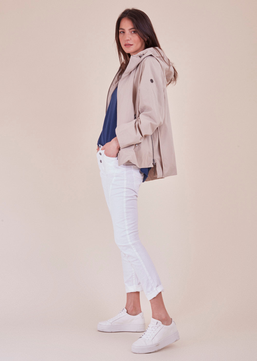Unsere geliebte lässig geschnittene Fashionjacke kommt aus dem Hause BLONDE NO.8!  Das lässig geschnittene Modell Valentina hat ein leicht verlängertes Rückenteil und eine lässige Kapuze. Mit seitlichen Reißverschlüssen zum einfachen erweitern der Jacke.