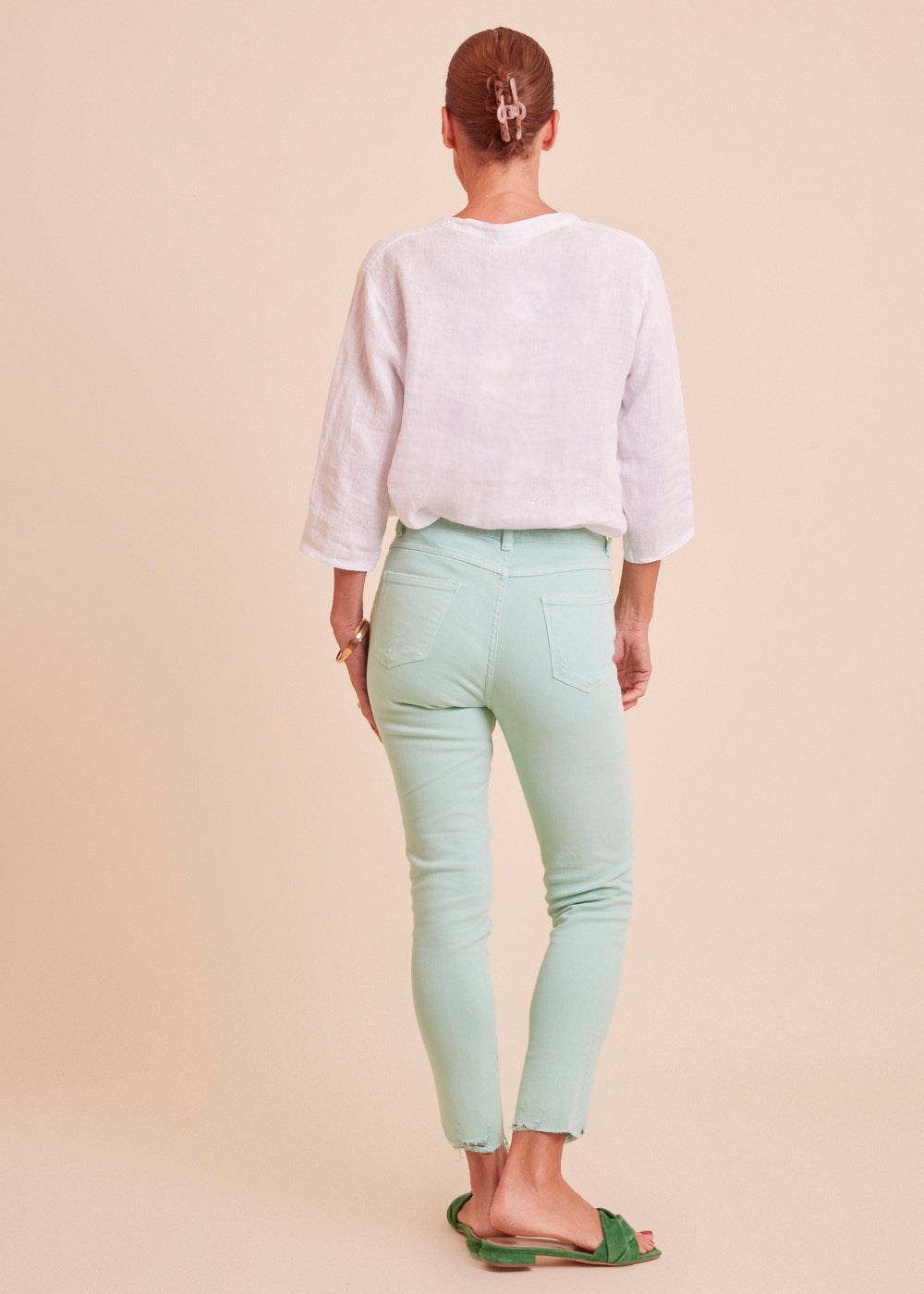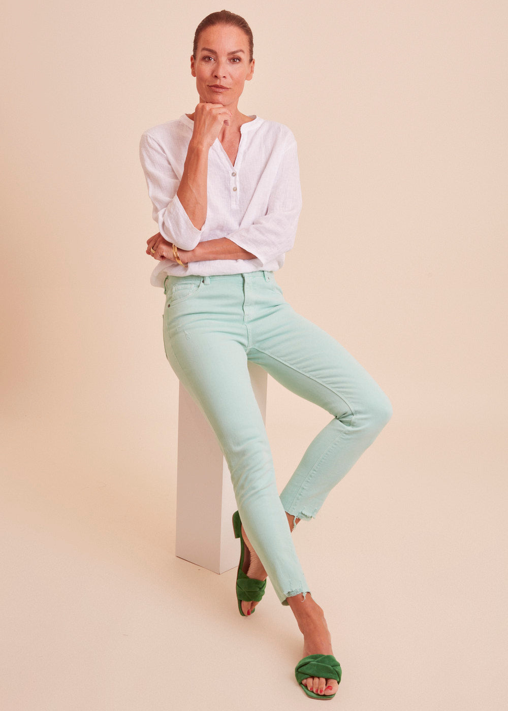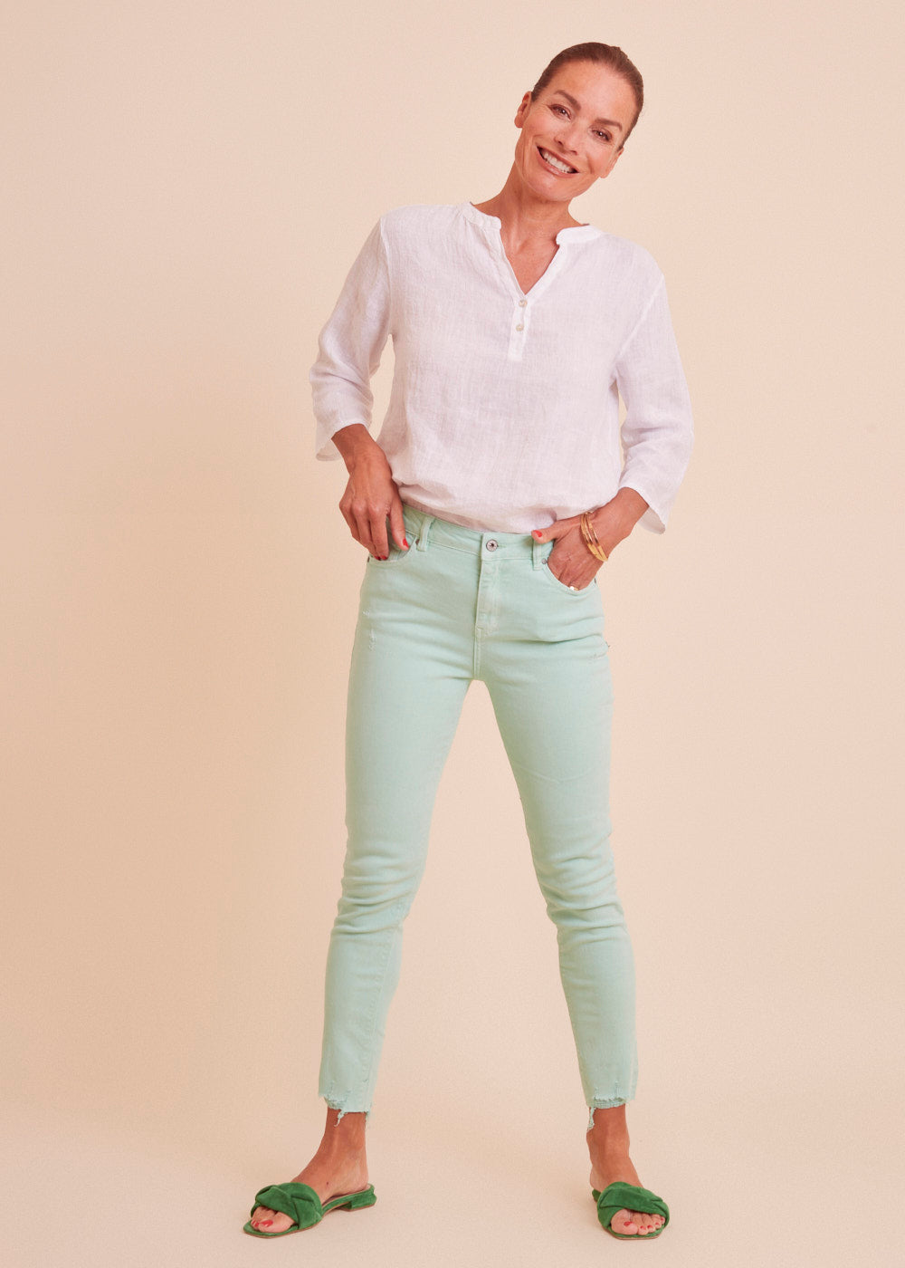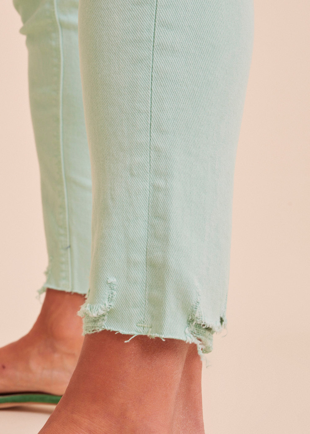 Jeans mit heller mint Waschung, seitlichen Eingriffstaschen und destroyed Effekten. Die Jeans hat einen engen Schnitt und passt sich durch ihr wundervolles Material optimal an deine Figur an. Mit offenen Saum Details, einfach Perfekt!