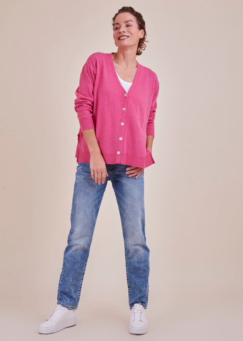 Kurz und kastenförmig geschnittene Strickjacke mit langen Armen. Sie hat ein Rippenbündchen an den Ärmeln und am Saum. Durch die besonderen Frontknöpfe lässt sich diese Jacke wunderbar geschlossen tragen. Zum darunter tragen empfehlen wir dir unsere Basic Tops. Kuschelig weicher Tragekomfort mit absoluter Wohlfühlgarantie.