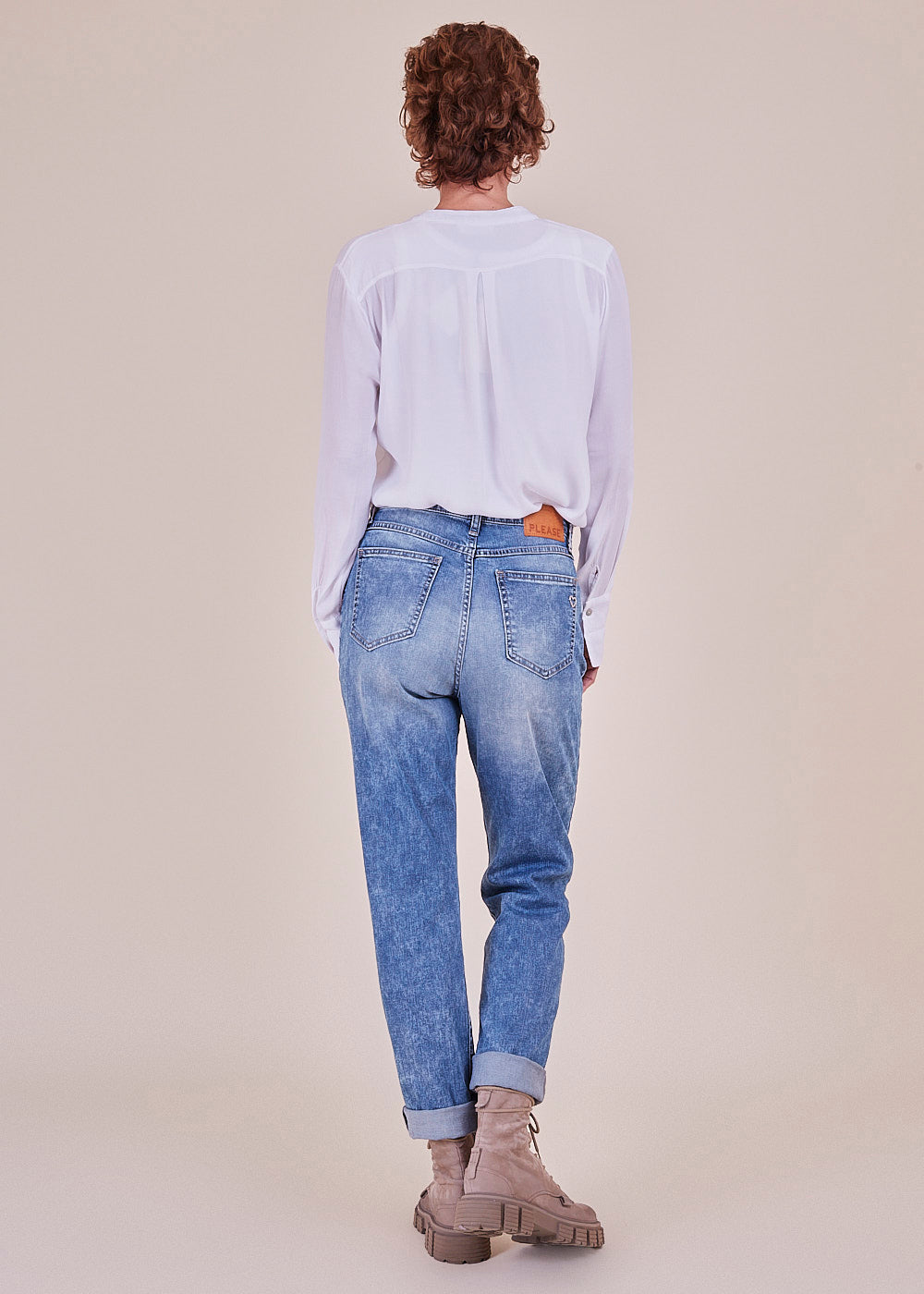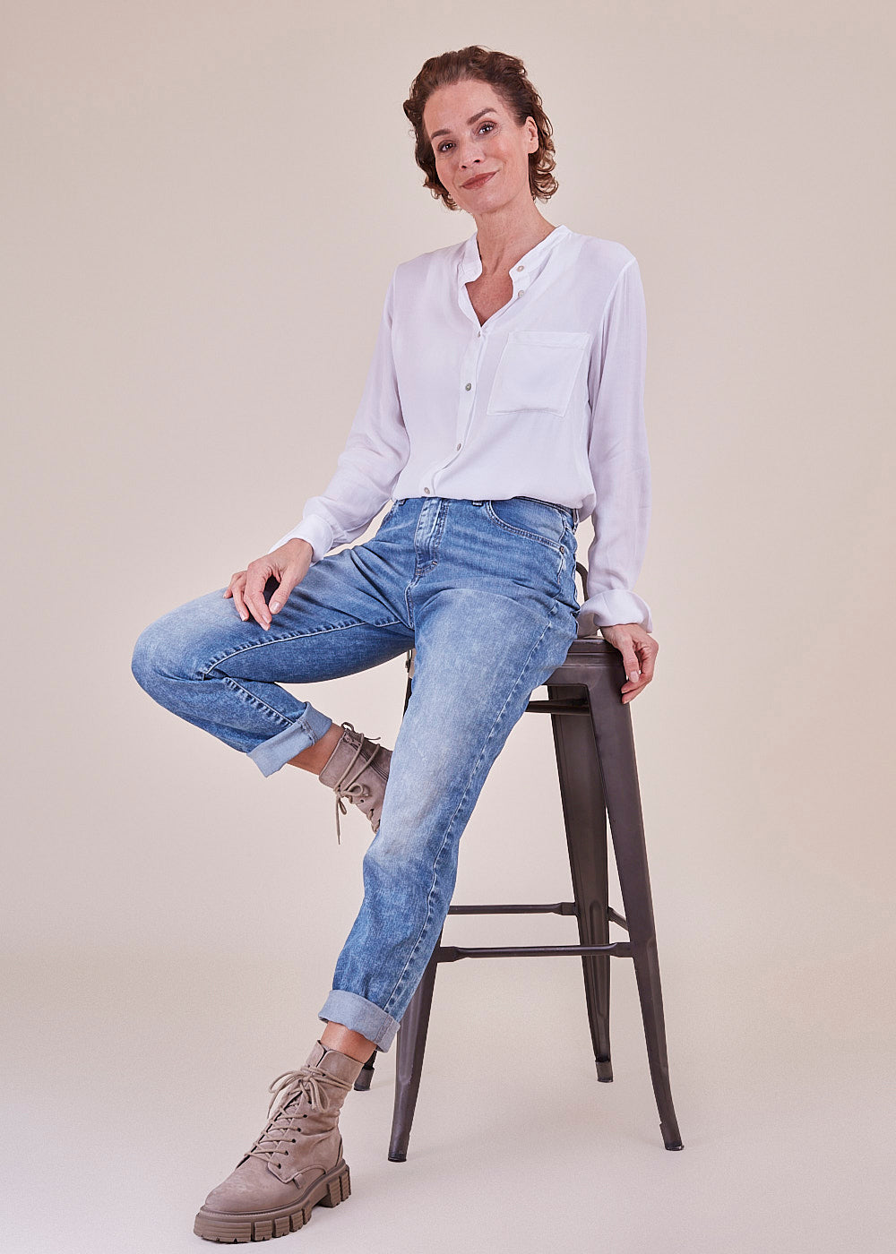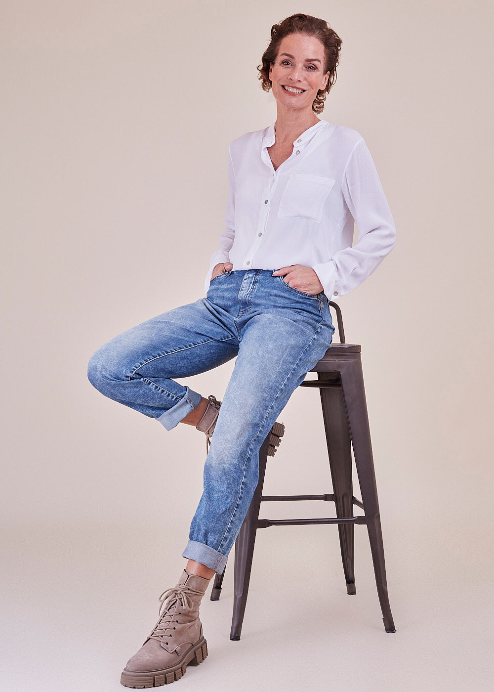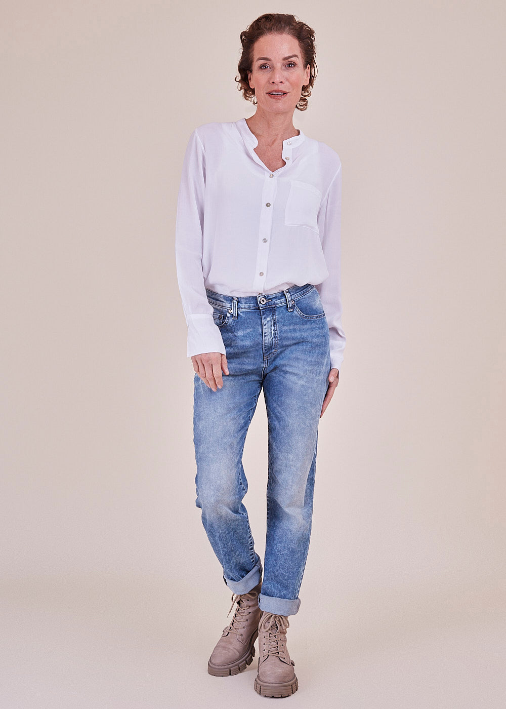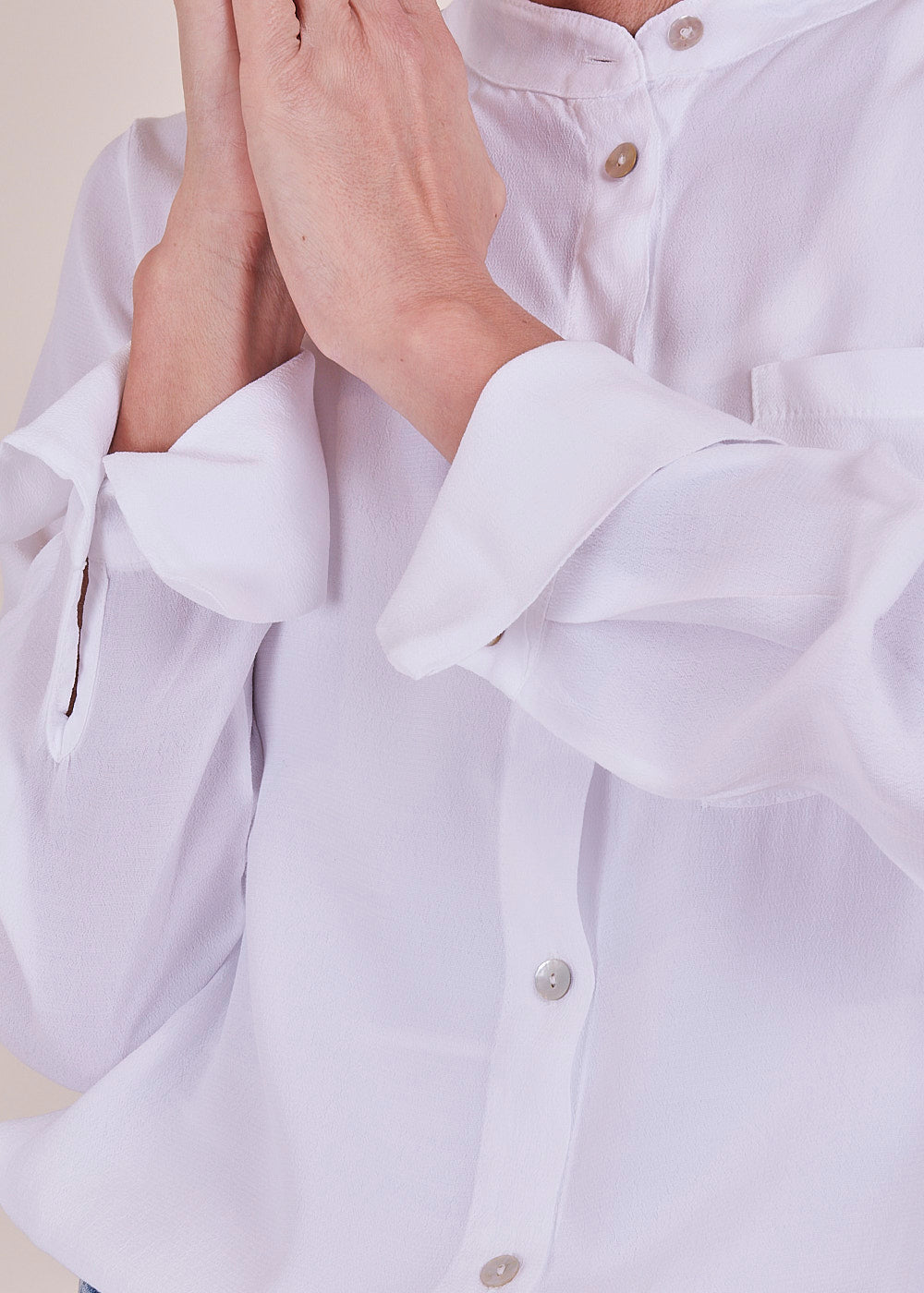 Stehkragen Bluse mit durchgehender Knopfleiste aus einem fließenden Viskosematerial. Sie lange Arme die in einer Manschette enden. Ein großartiger Kombinationsartikel.