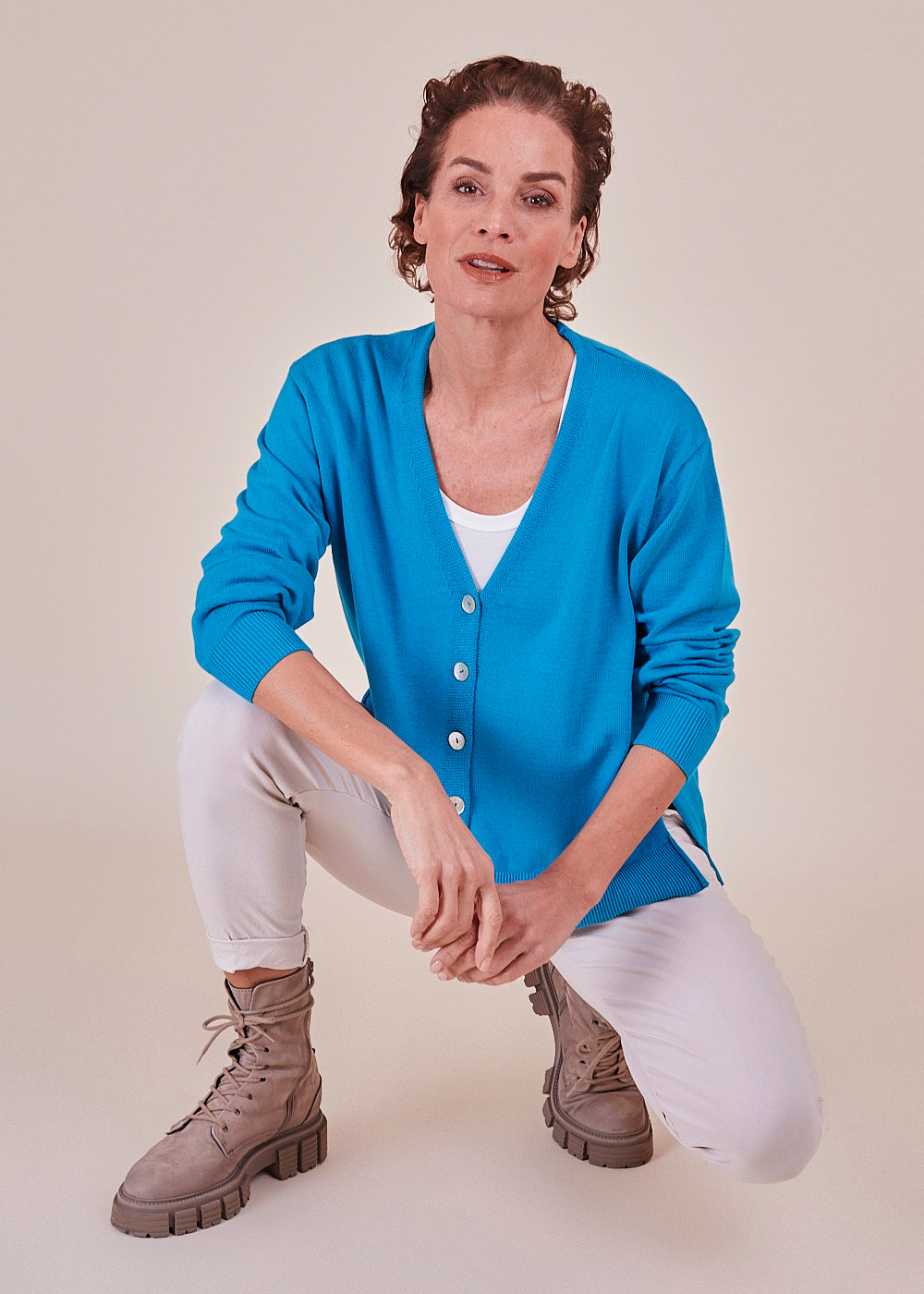 Kurz und kastenförmig geschnittene Strickjacke mit langen Armen aus unserem Bestseller Garn. Sie hat ein Rippenbündchen an den Ärmeln und am Saum. Durch die Frontknöpfe lässt sich diese Jacke wunderbar geschlossen tragen. Zum darunter tragen empfehlen wir dir unsere Basic Tops. Kuschelig weicher Tragekomfort mit absoluter Wohlfühlgarantie.