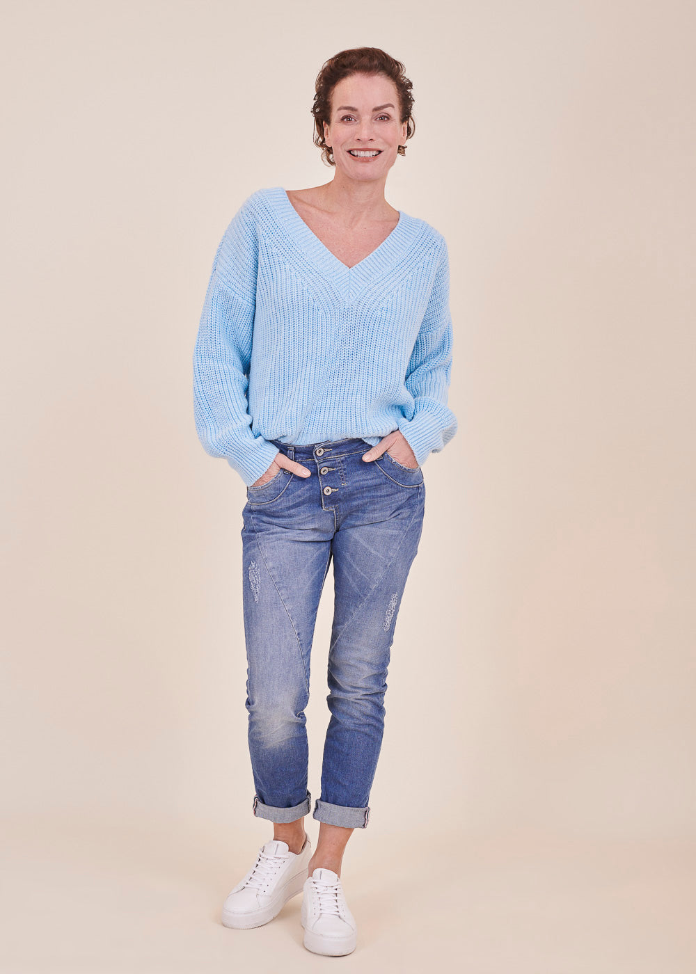 Wer kann dem schon widerstehen? Ein absoluter Traum ist dieser Grobstrick-Pullover in der Farbe Celeste. Der Langarmpullover ist nicht nur traumhaft schön, er ist auch ein super bequemes Teil. Sowohl die behagliche Materialmischung, als auch der legere Schnitt sorgen für einen optimalen Tragekomfort. Der V-Ausschnitt rundet das schicke Gesamtbild ab und unterstreicht zudem die gestreckte Form.