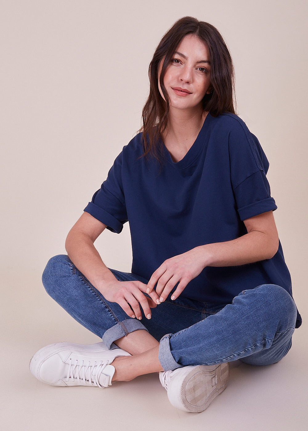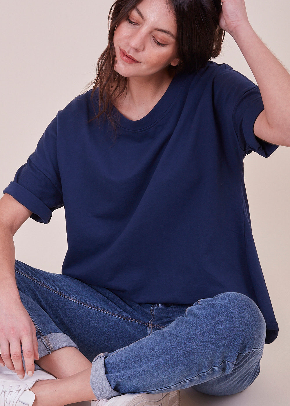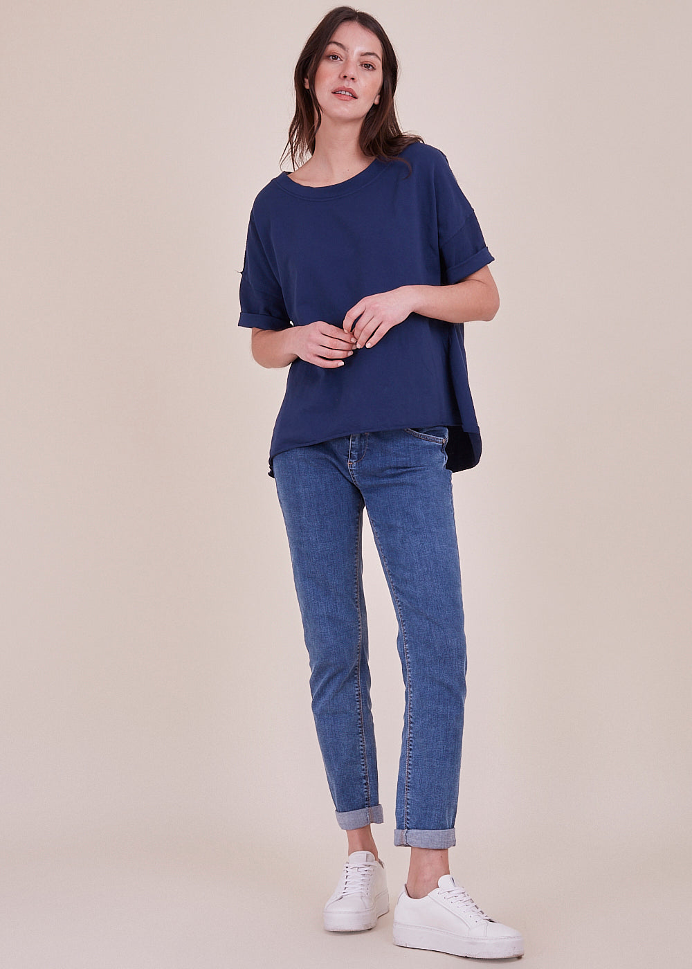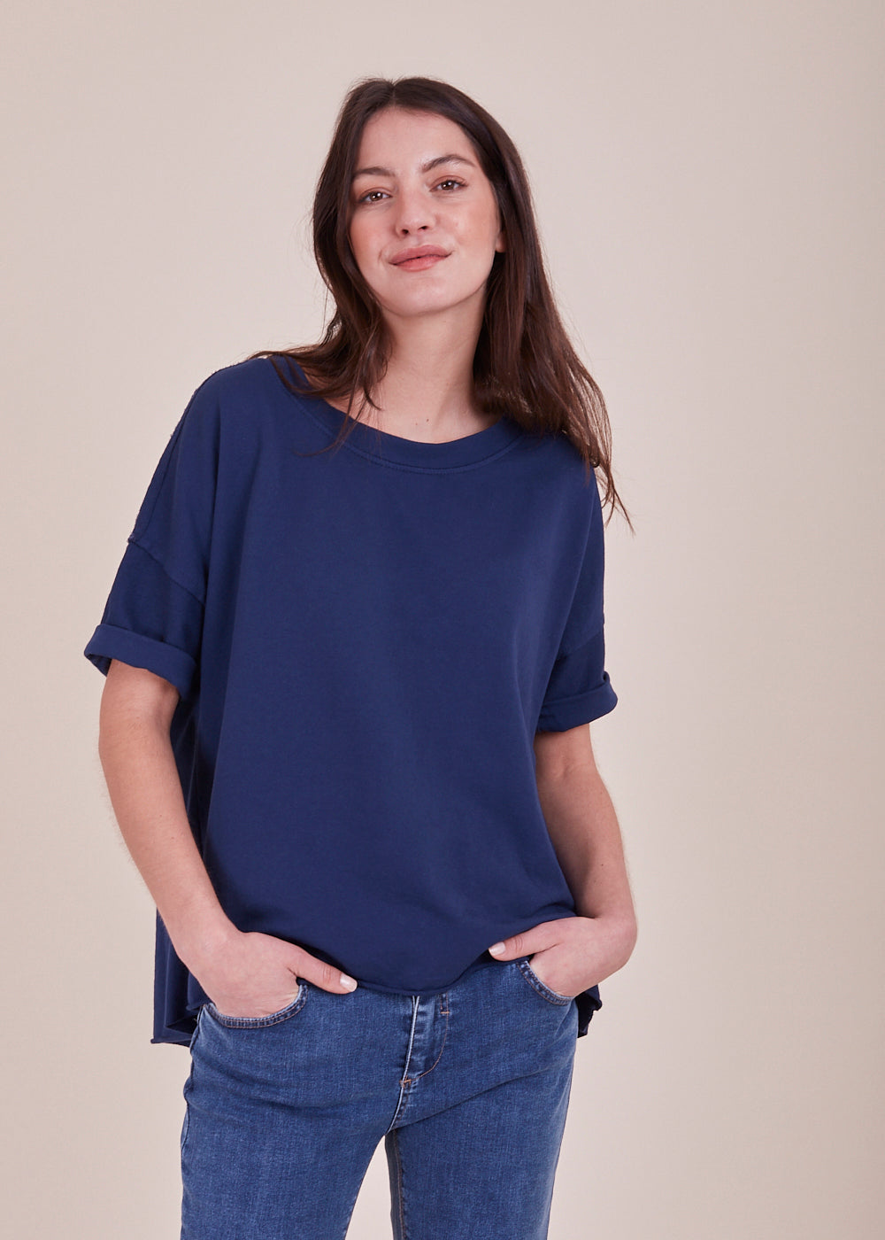 Lässig geschnittenes Sweatshirt mit kurzen Armen und Rundhalsausschnitt. Ein absolutes Must-Have für deinen Kleiderschrank. Es lässt sich ideal unter unseren Strickjacken kombinieren. Oder trage es als Basic zu einer Jeans und Sneakern.