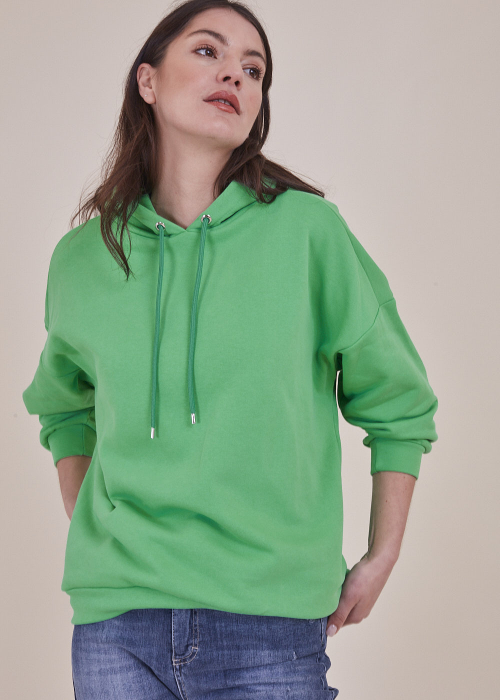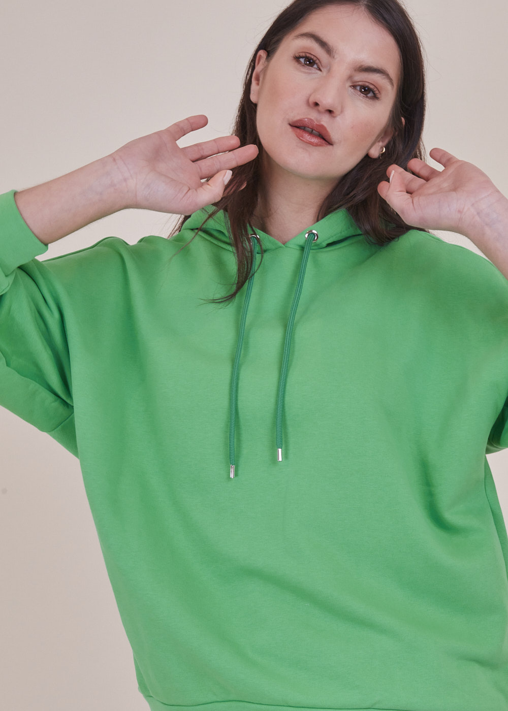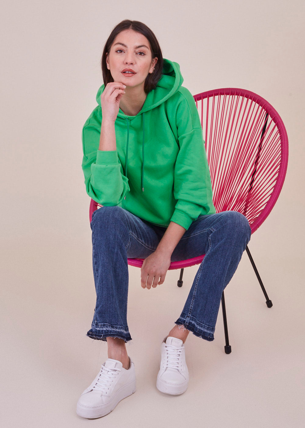 Dieser Hoody lässt einfach jeden Strahlen!! Unser Fashion Hoody in einem wunderschönen Grün Ton. Er hat einen lässigen Schnitt. Die langen Ärmel enden in einem Bündchen, das für guten Sitz sorgt. Mit Tunnelzug am Ausschnitt in einer aufwendigen Verarbeitung.