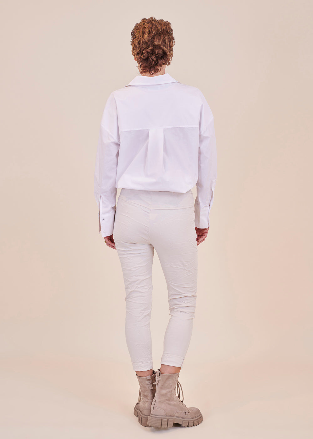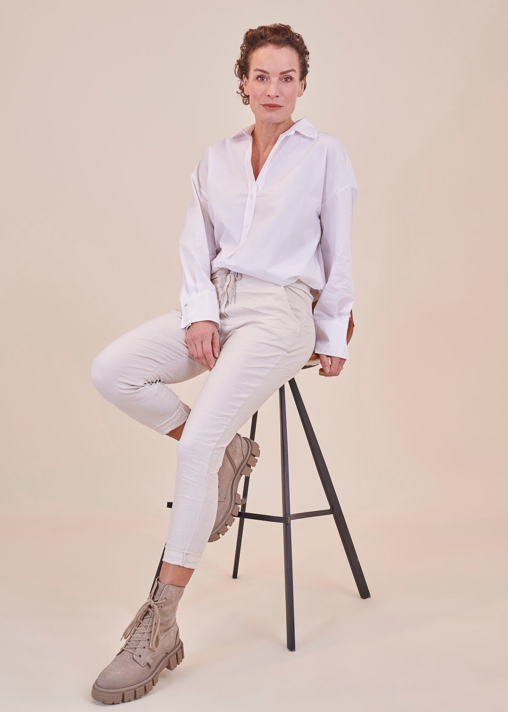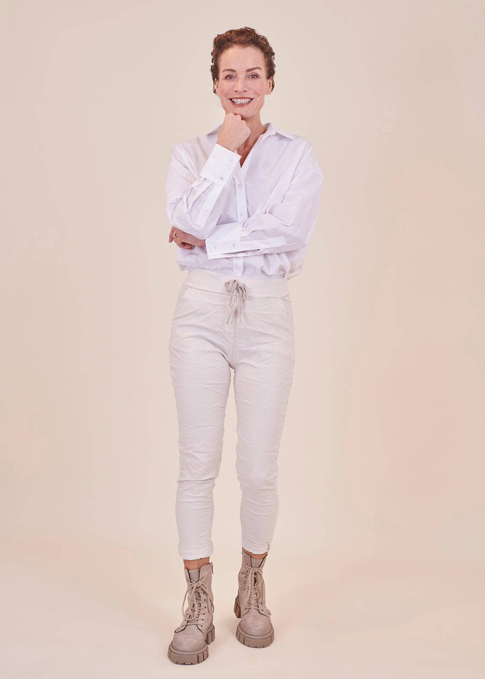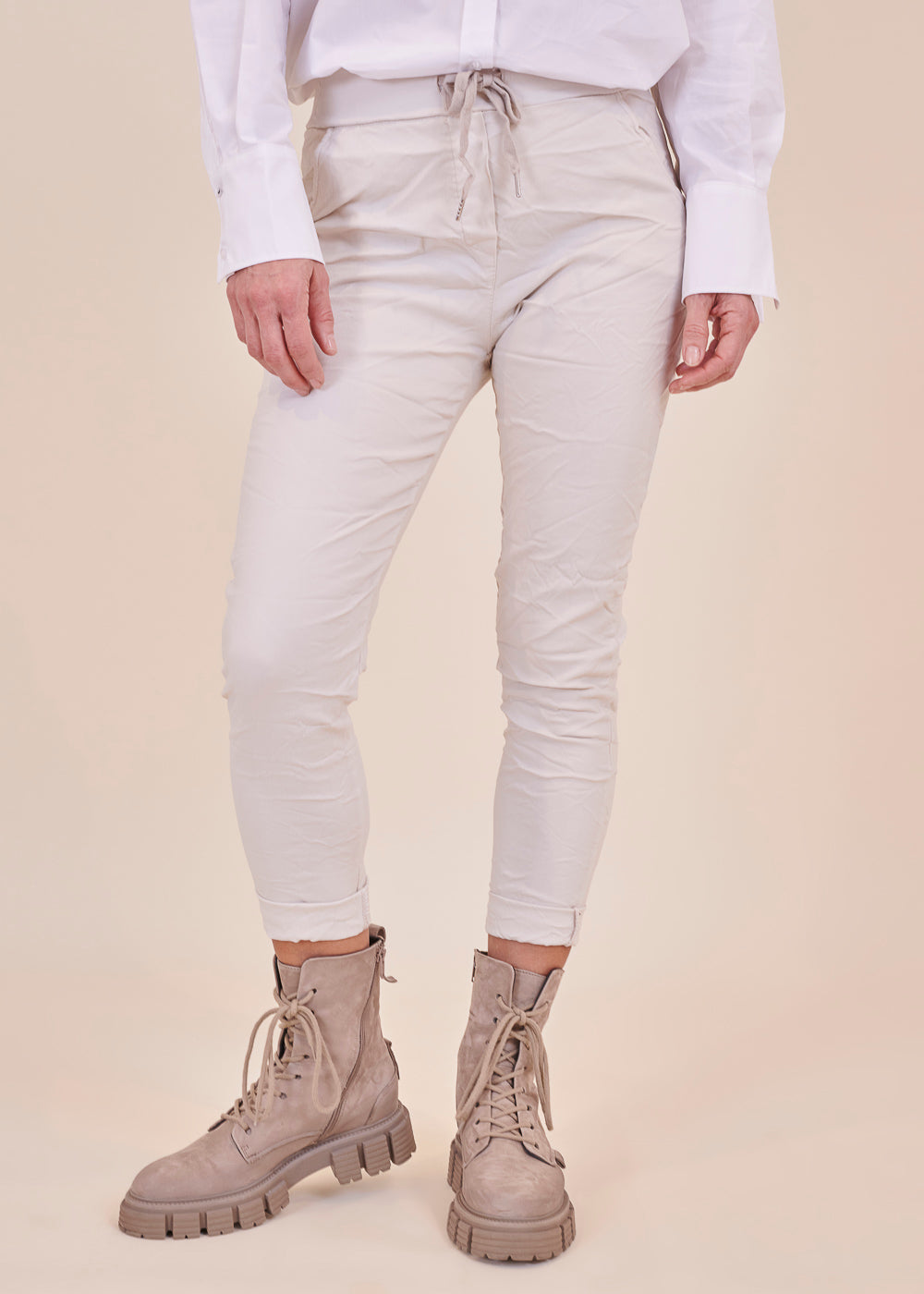 Unser Bestseller! Hose aus Viskose und Elasthan-Anteil. Dadurch sitzt sie super bequem und lässt sich prima zu Allem kombinieren. Gummizug im Bund, Tunnelzug mit Band und seitliche Eingriffstaschen.