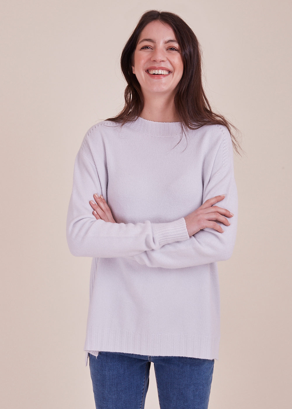Kuscheliger Pullover mit Rundhalsschnitt und lässigen Schnitt. Der wundervolle, helle Ton verleiht jedem Frische. Mit breitem Rippenbündchen am Ausschnitt, Ärmel und Saum. Seitliche Schlitze. Mit einem leicht verlängerten Rückenstück.