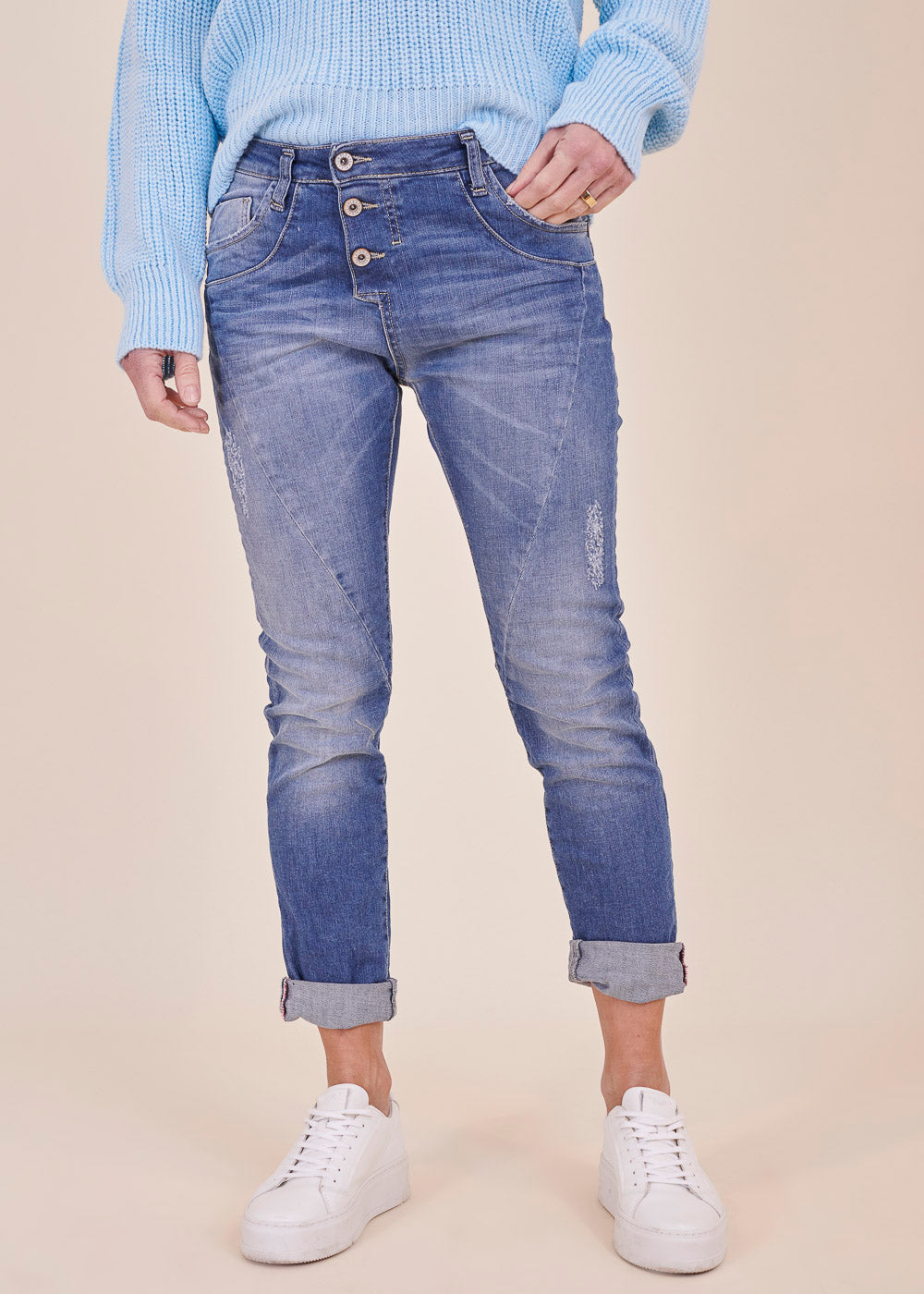 Boyfriend-Fit Jeans von Please. Sie sitzt locker auf den Hüften und hat die typische Ziernaht quer über die Vorderschenkel. Knopfleiste mit 3 Metallknöpfen vorn. Klassischer 5-Pocket Stil, mit dem kleinen Metallherz auf der Gesäßtasche.