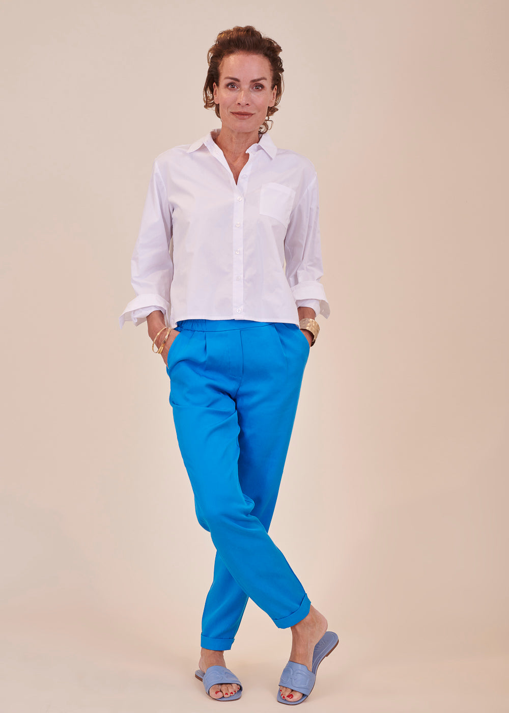 Die elastische Schlupfhose mit lockeren Bein hat einen breiten elastischen Bund für ein besonders bequemes Tragegefühl. Mit seitlichen Eingriffstaschen und Bundfalten. Die fließende Viskose kühlt an den heißen Sommertagen.