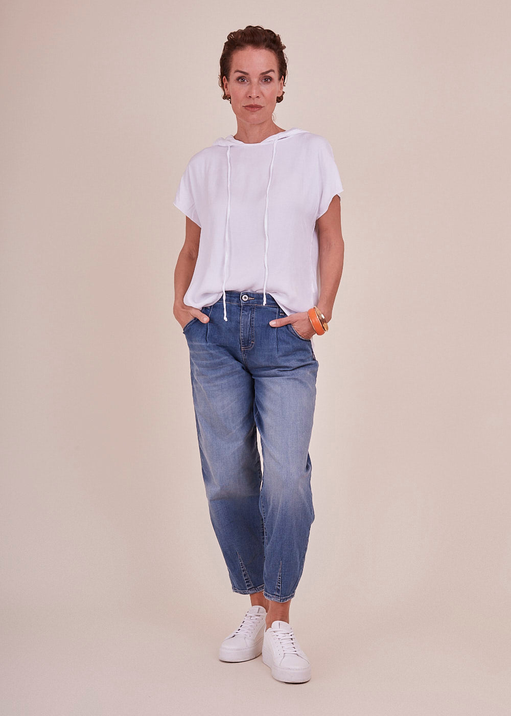 Locker geschnittene Bluse aus einem schönen Viskosemixmaterial. Im sportlichen Hoodie Style überrascht sie mit ihrer Kapuze. Mit kurz geschnittenen Armen und Banddetails.