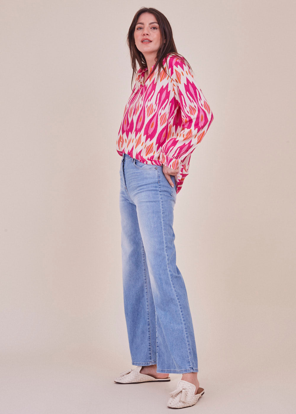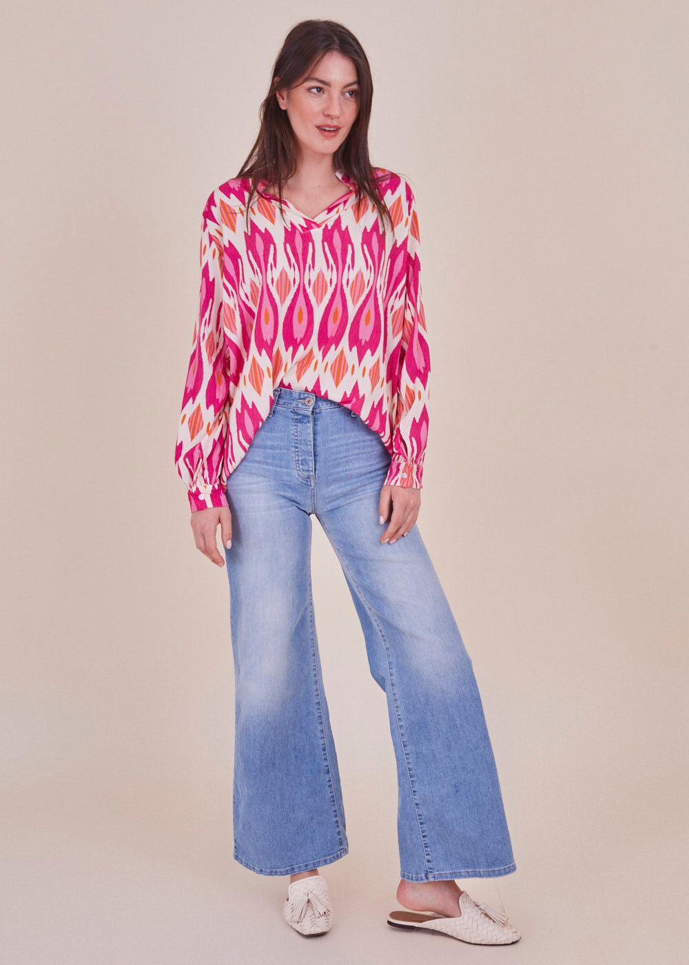 Wir lieben Print! Diese lässig fließende Viskosebluse in den neuen Trendfarben hat lange Ärmel mit überschnittenen Schultern. Durch ihr leichtes Viskosematerial hat sie einen angenehmen Tragekomfort. Sie hat durchgehende Knopfleiste. Ein absoluter Hingucker.
