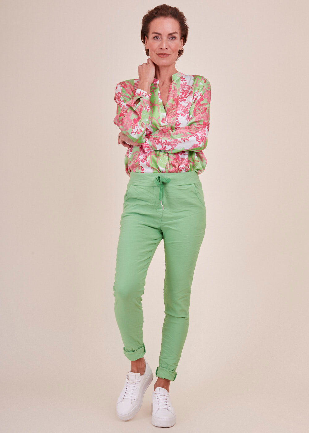 Wir haben Lust auf Farbe! Unser Bestseller! Hose aus Viskose und Elasthan-Anteil. Dadurch sitzt sie super bequem und lässt sich prima zu Allem kombinieren. Gummizug im Bund, Tunnelzug mit Band und seitliche Eingriffstaschen.