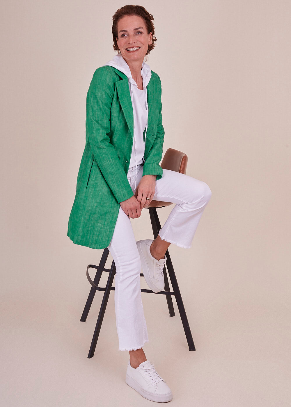 Länger geschnittener Blazer in einem großartigen Design. Er hat seitliche Eingriffstaschen und eine Knopfleiste. Die gekonnte Schnittführung zaubert eine feminine Silhouette. Wer es etwas legerer mag, kann ein lässiges Outfit aus Jeans und Shirt mit der stylischen Jacke aufpeppen. Stilvoller und zeitloser Begleiter.