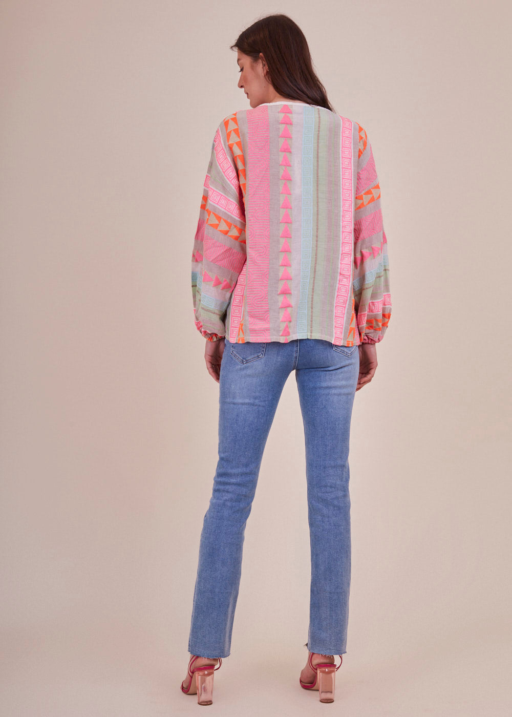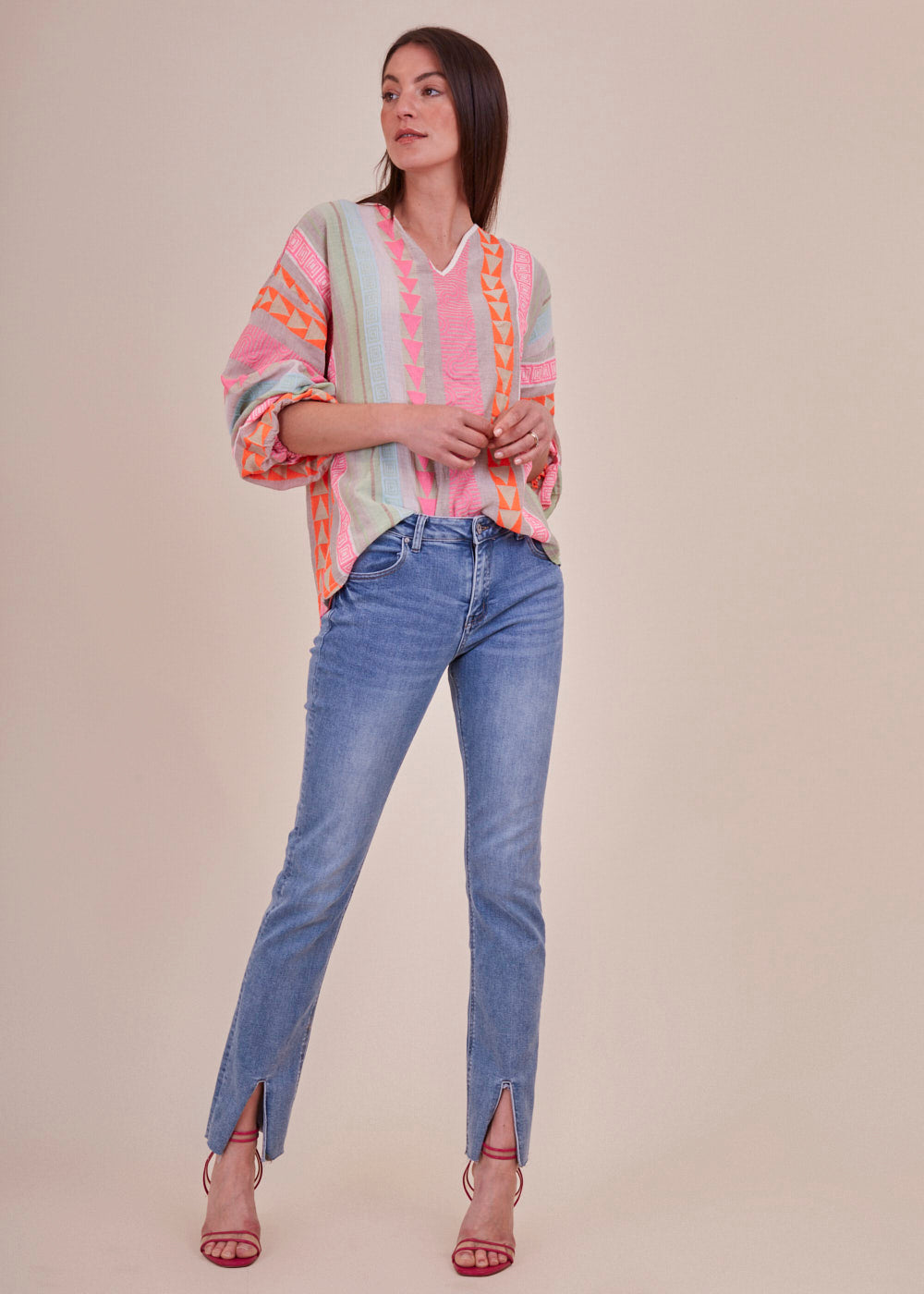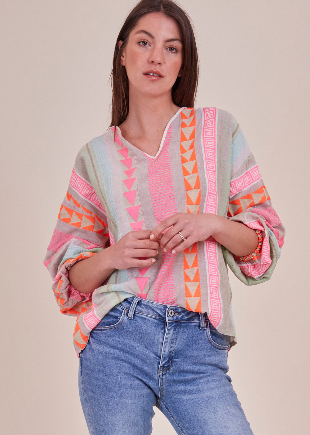 Lust auf den Sommer? Mit dieser besonderen Tunika, holst du dir schon jetzt, die ersten Sonnenstrahlen in deinen Kleiderschrank. Der wunderschöne und farbenfrohe Print der Bluse lässt sich hervorragend mit Jeans oder einer weißen Jeans kombinieren. Durch seinen besonders lässigen Schnitt sitzt diese Tunika besonders gemütlich und engt dich in deinem Alltag nicht ein. Aber auch auf der nächsten Gartenparty deiner Freundin, wirst du mit dieser besonderen Tunika, zum absoluten Blickfang.