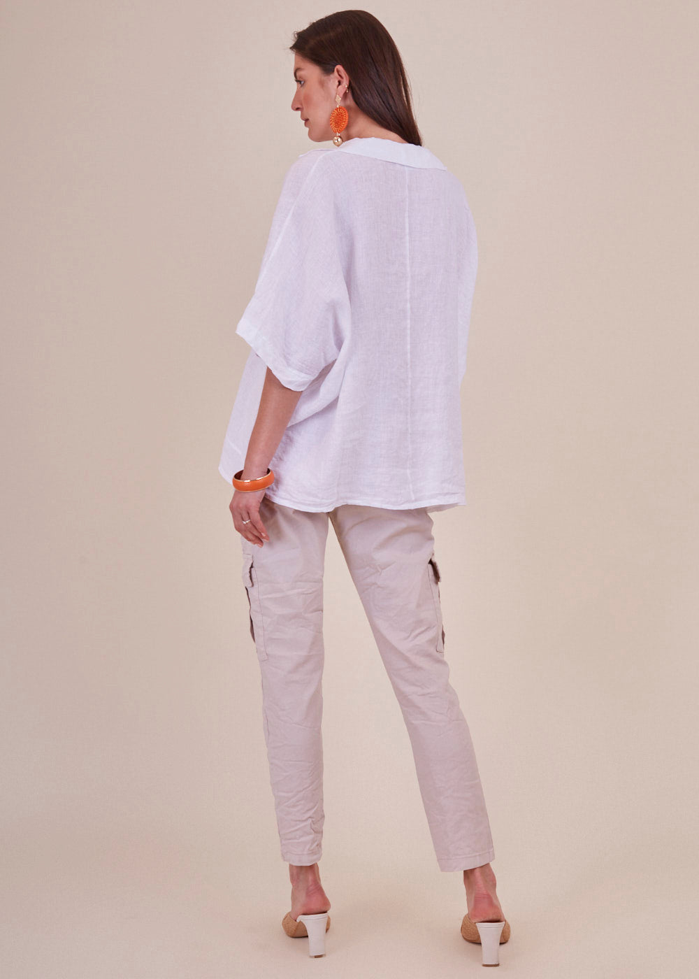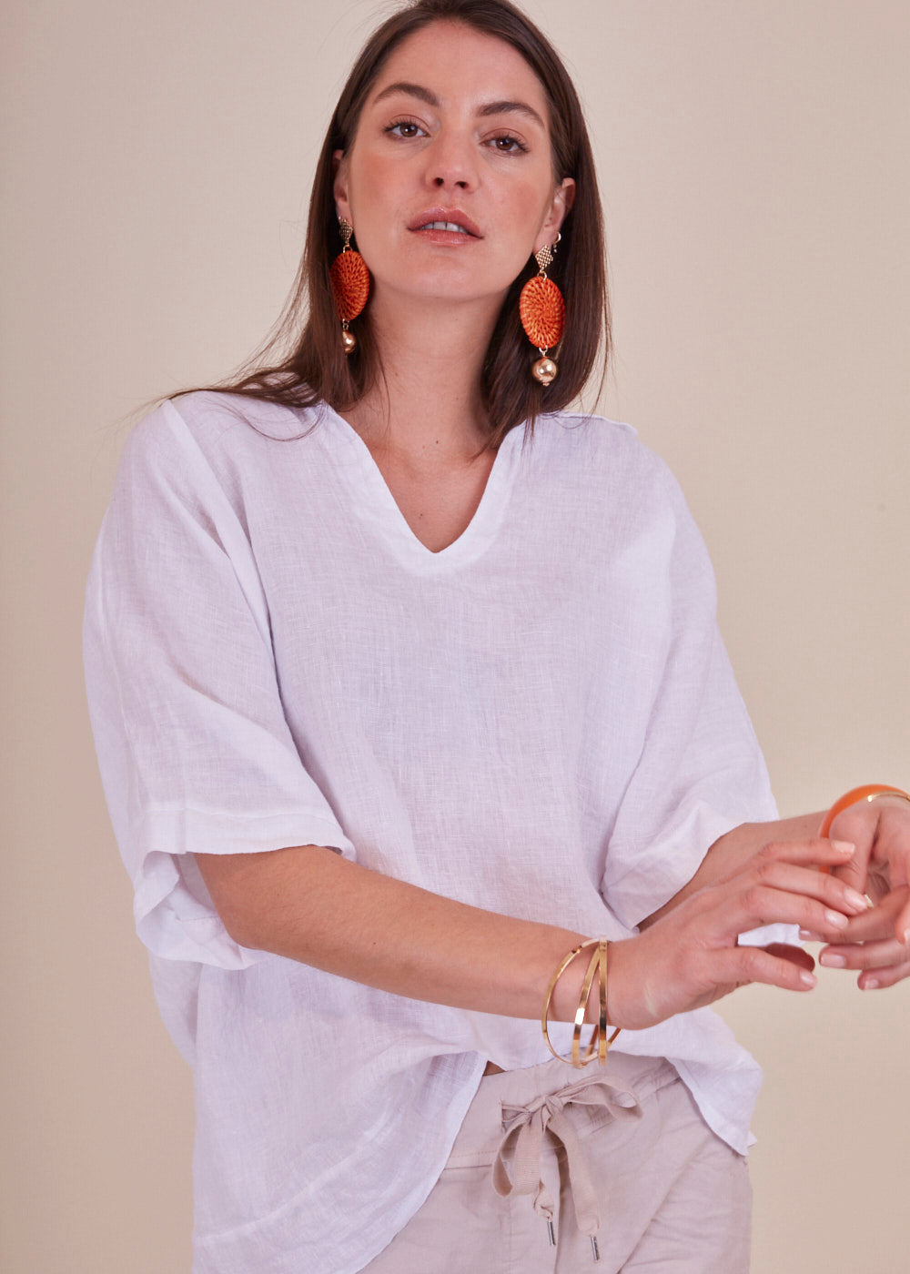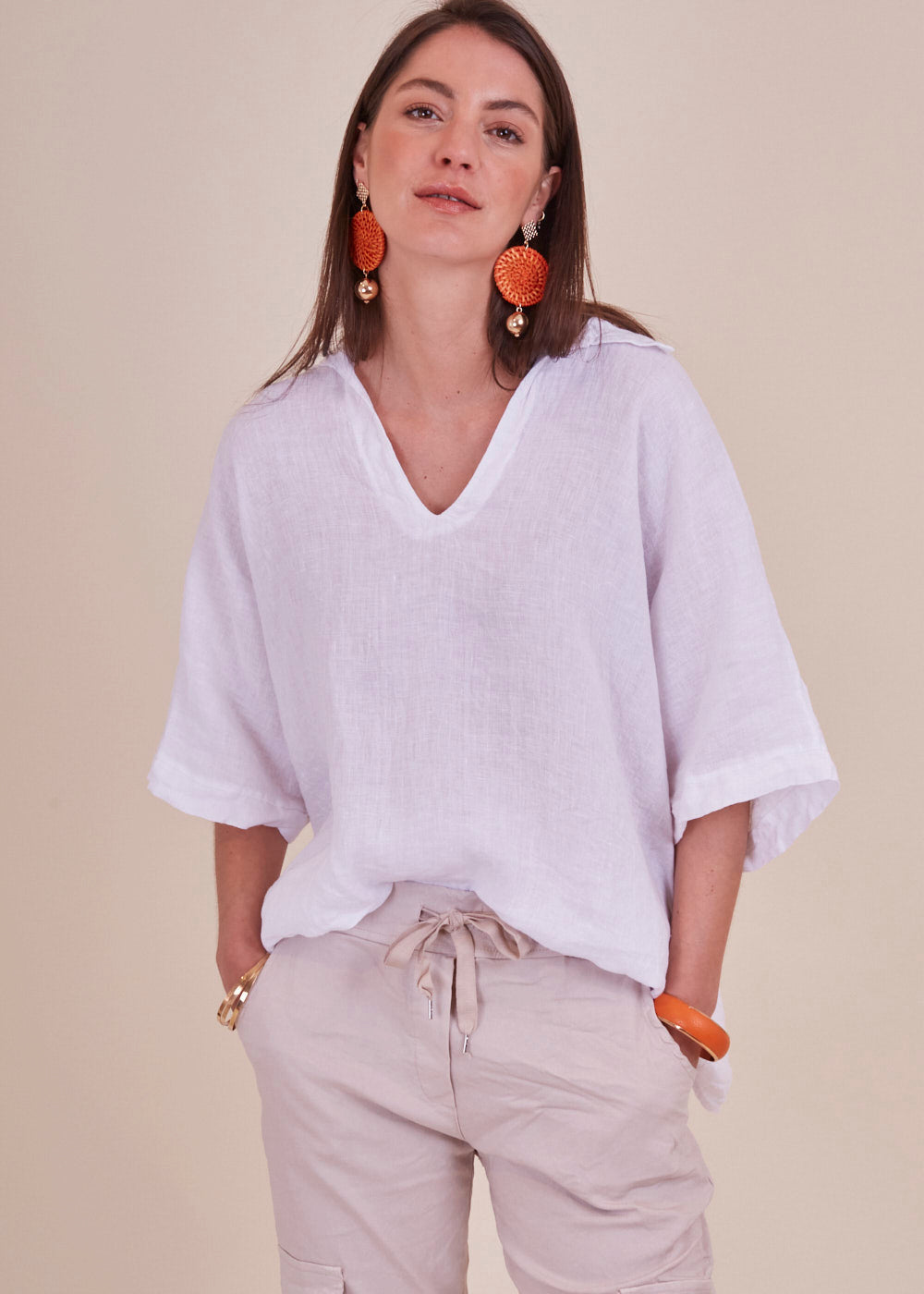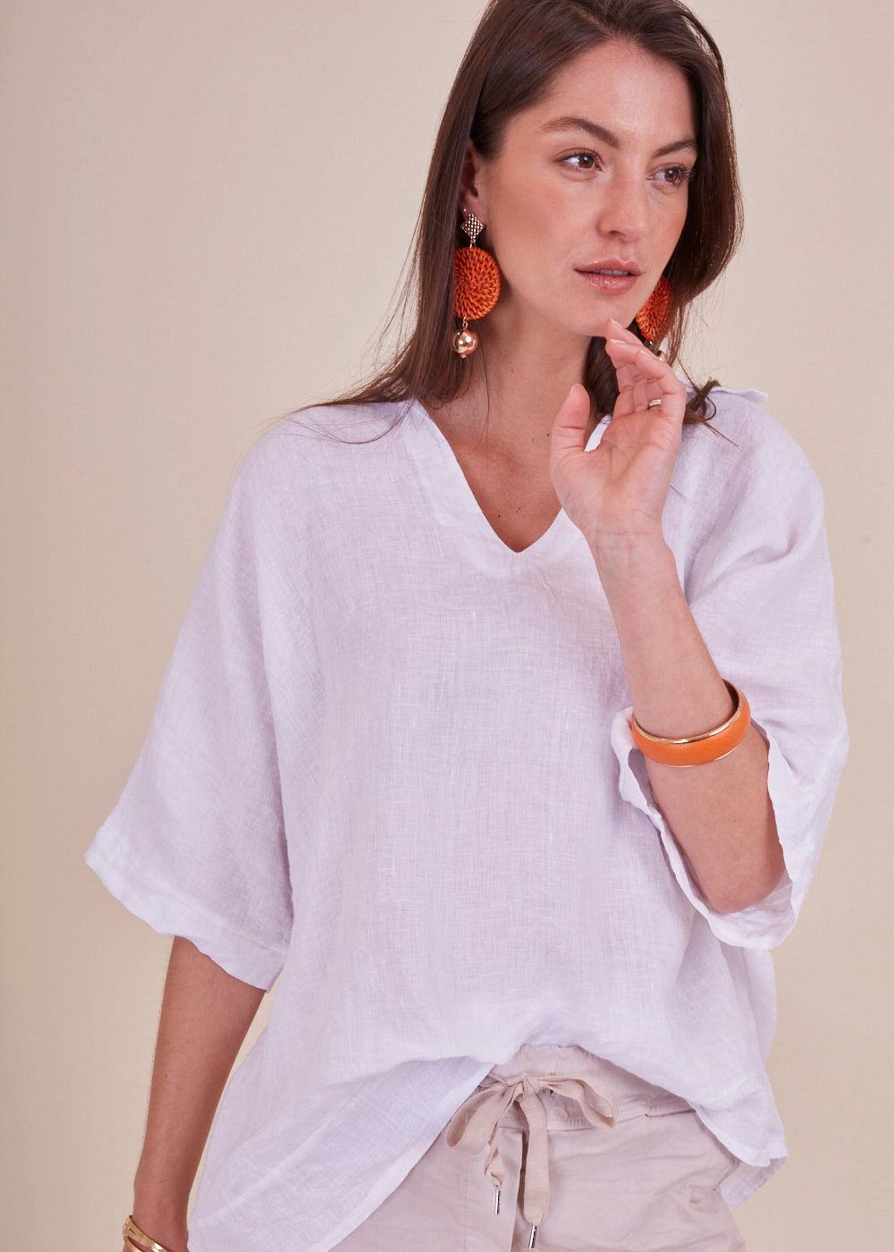Locker leichte Leinenbluse mit kurzem Arm und besonderen Ausschnitt. Die sommerliche Tunika aus 100% kühlendem Leinen ist der ideale Begleiter für deinen nächsten Urlaub oder einen gemütlichen Stadtbummel mit der besten Freundin.