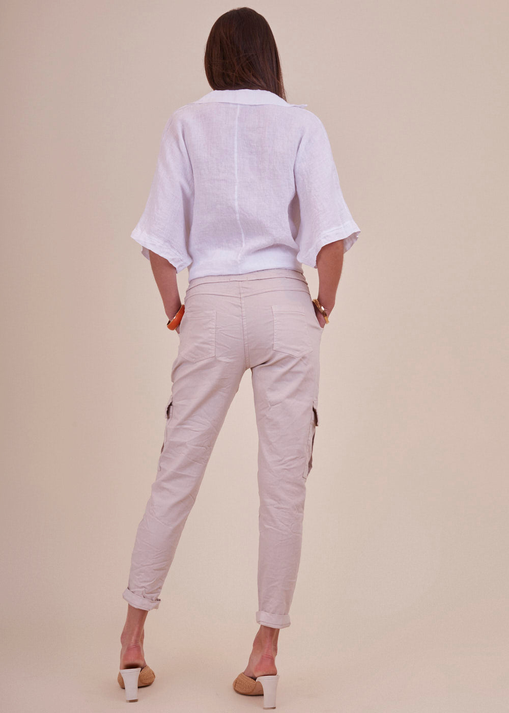 Unser Bestseller in der neuen Trendform mit seitlichen Eingriffstaschen. Hose aus Viskose und Elasthan-Anteil. Dadurch sitzt sie super bequem und lässt sich prima zu Allem kombinieren. Gummizug im Bund, Tunnelzug mit Band und seitliche Eingriffstaschen.