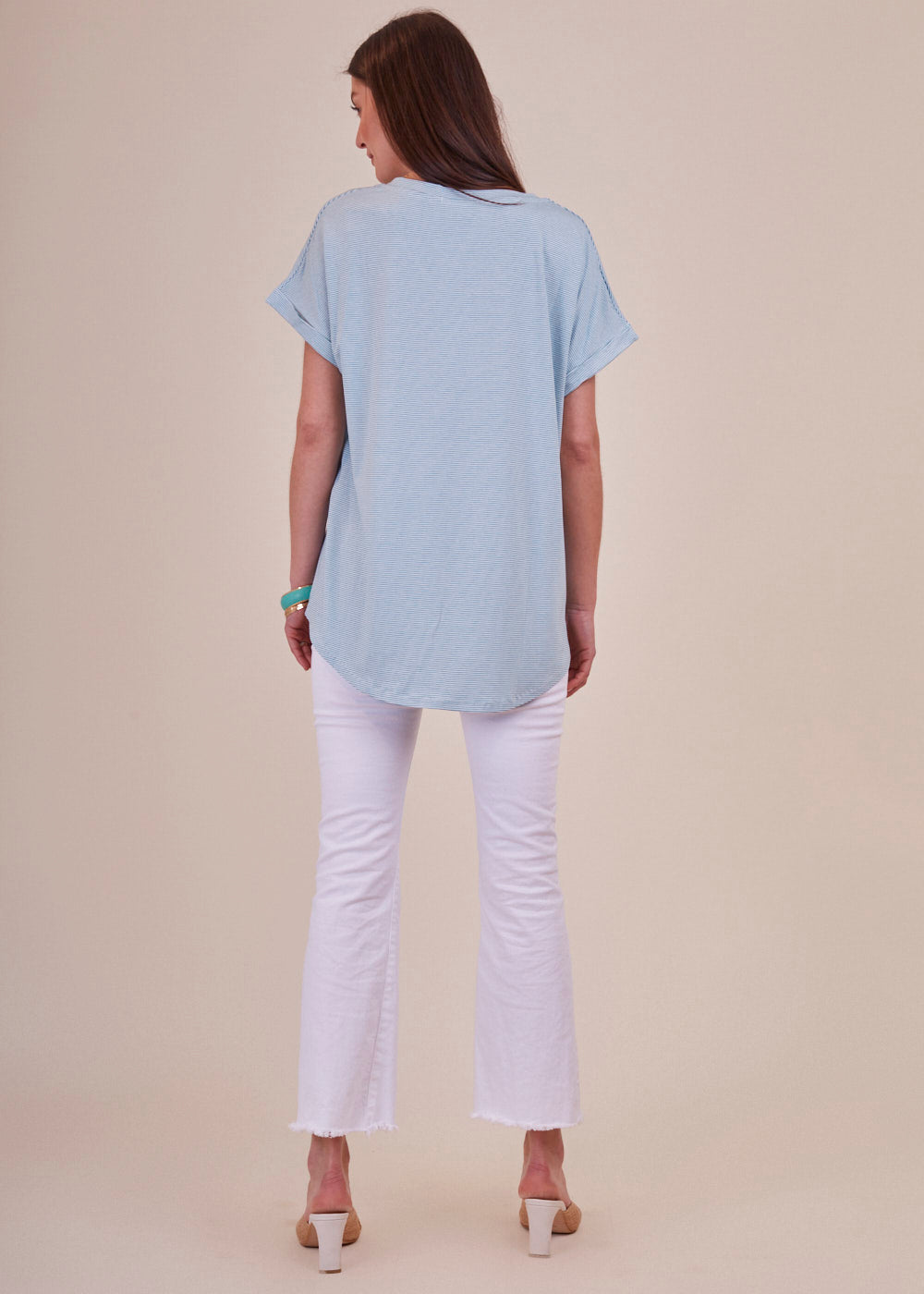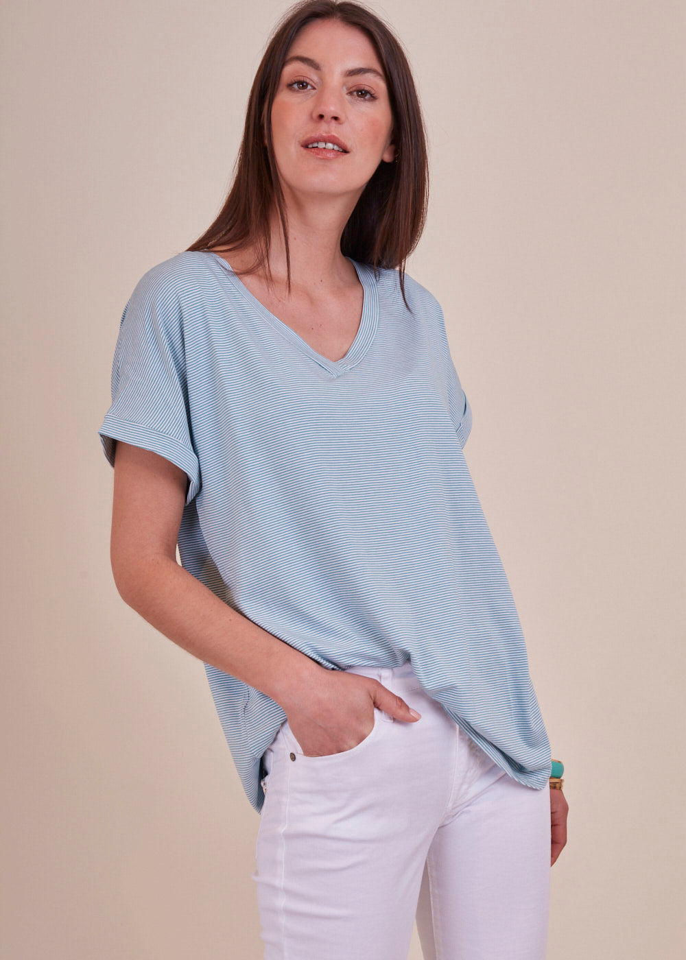 Ein maritimer und wunderbar zeitloser Klassiker ist das Streifenshirt! Schön gerade geschnitten setzt das T-Shirt auf Komfort und liegt dank seines Materials besonders angenehm auf der Haut. Ein schöner V-Ausschnitt und umgeschlagene kurze Arme, runden dieses besondere Shirt, perfekt ab!