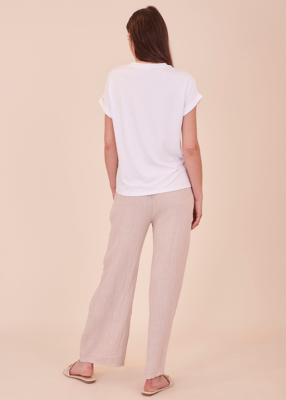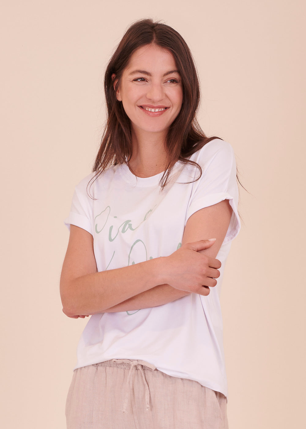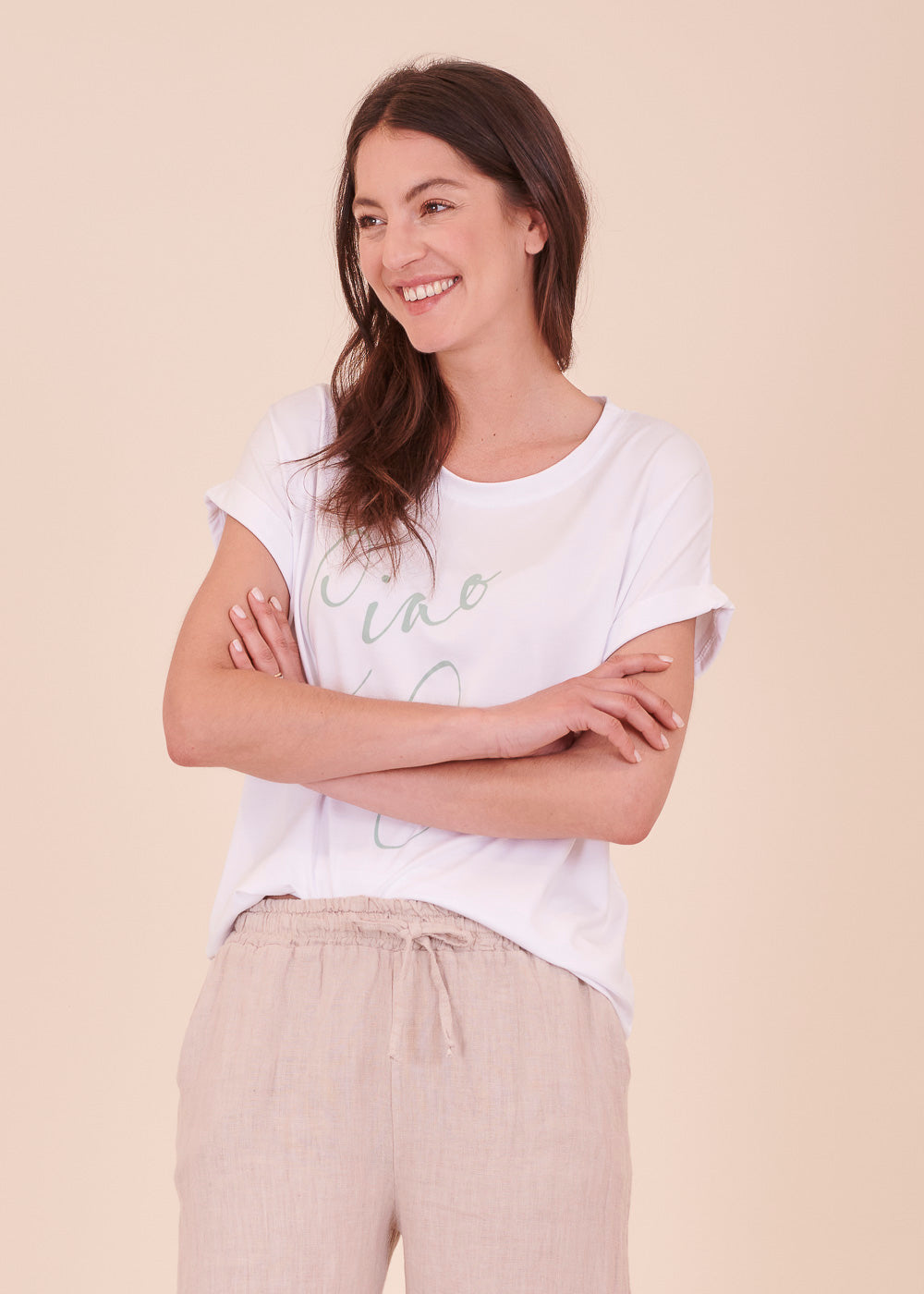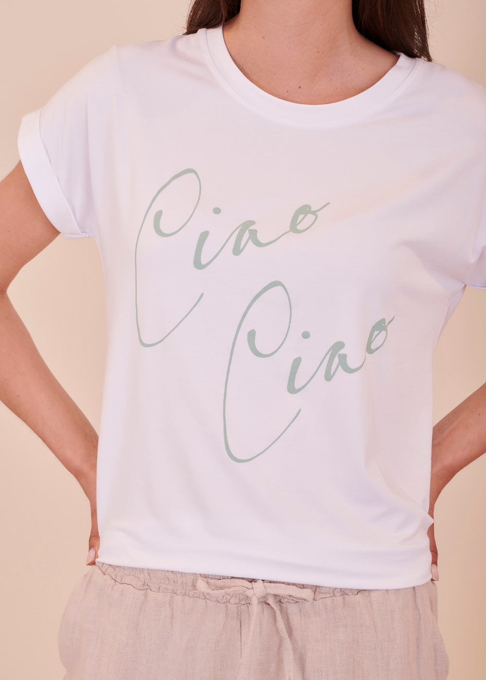 Ciao Ciao! T-Shirt aus weicher Baumwolle mit Frontdruck, Rundausschnitt mit Rippenblende und überschnittenen Schultern und umgekrempelten Ärmeln.