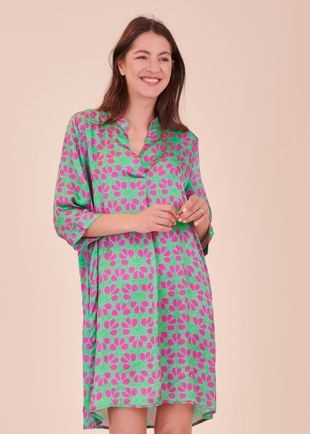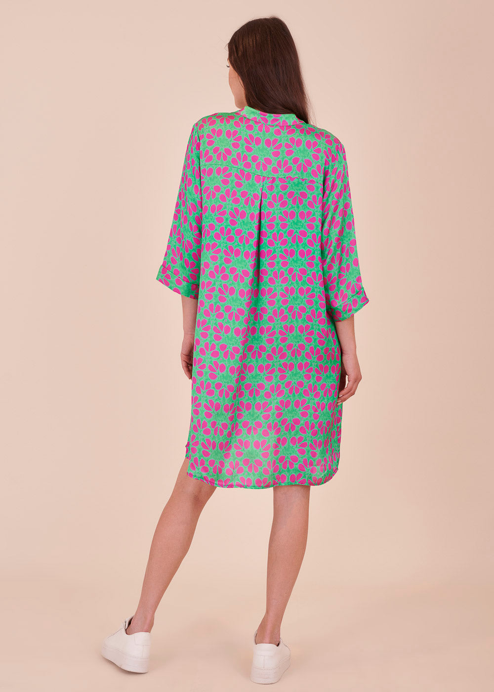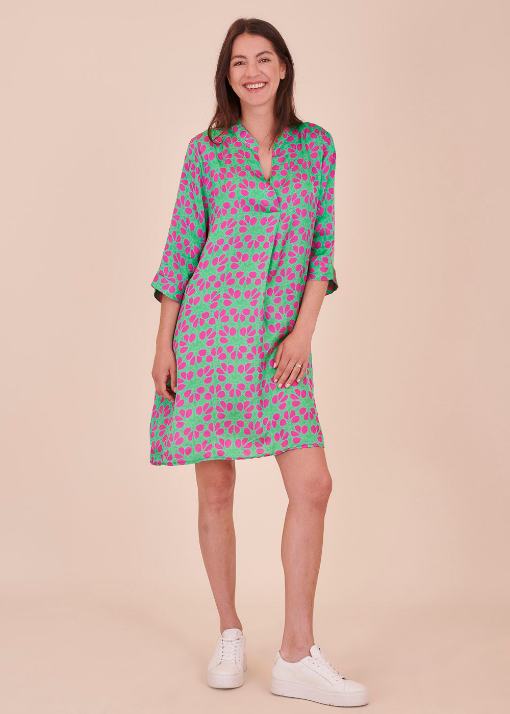 Dieses sommerliche Kleid erstrahlt in frischen neuen Trendfarben und einem All-Over-Print. Das Kleid besitzt einen Stehkragen, sowie  3/4 lange Ärmel. Der fließende Schnitt sorgt für ein luftig-leichtes Tragegefühl.