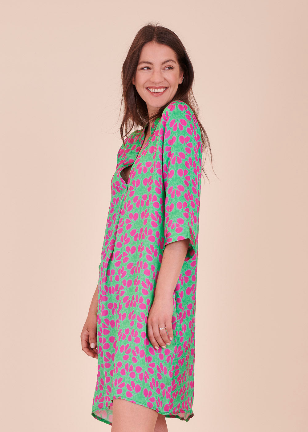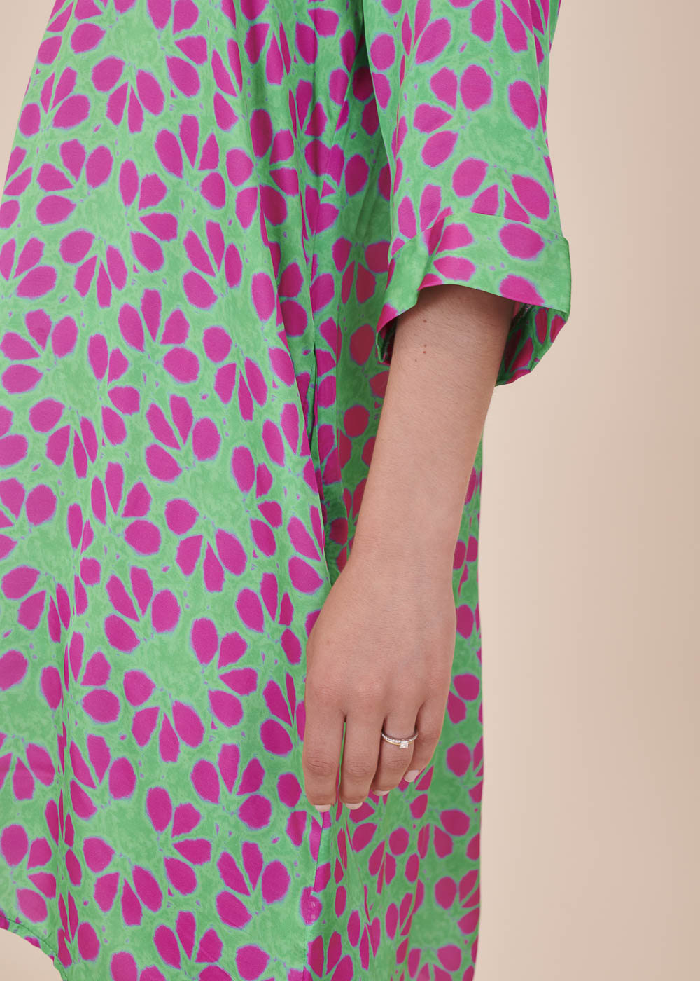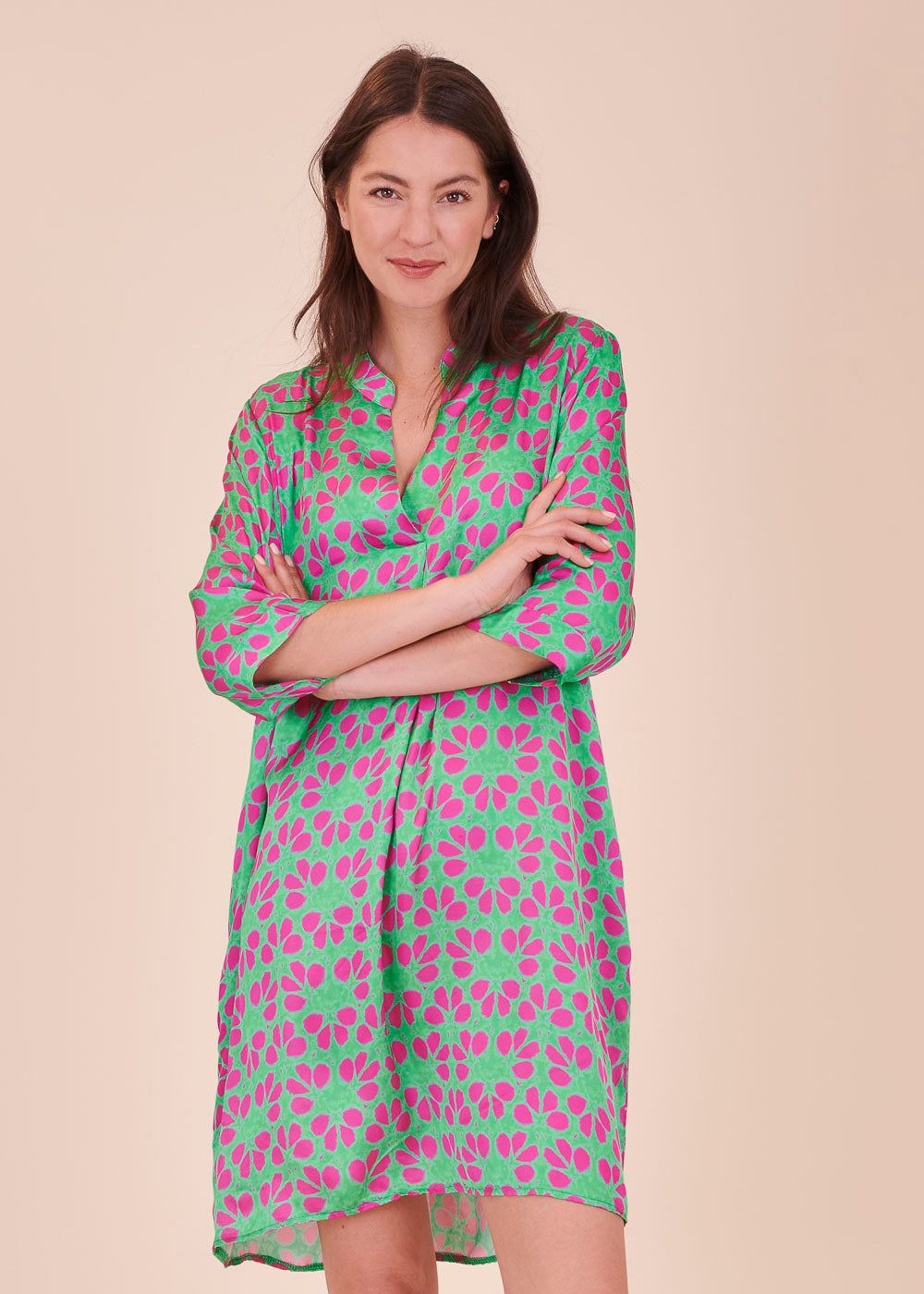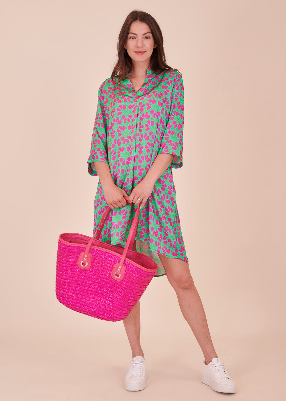 Dieses sommerliche Kleid erstrahlt in frischen neuen Trendfarben und einem All-Over-Print. Das Kleid besitzt einen Stehkragen, sowie  3/4 lange Ärmel. Der fließende Schnitt sorgt für ein luftig-leichtes Tragegefühl.