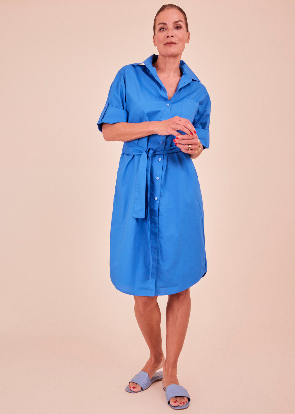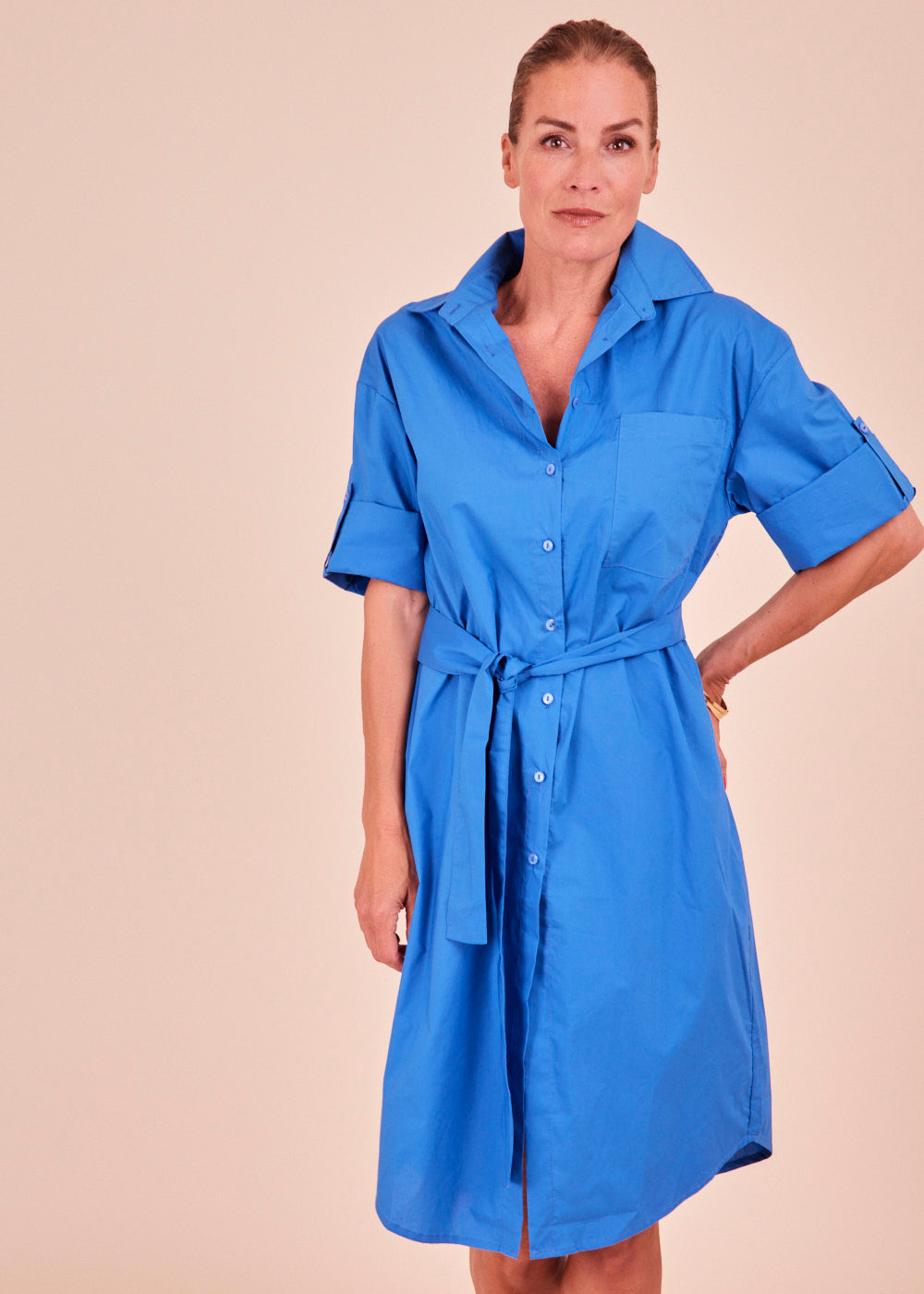 Oversized geschnittenes Hemdblusenkleid mit dreiviertel Ärmeln in einem großartigen blau Ton. Dieses Blusenkleid hat eine offene Knopfleiste vorne. Der lässig fallende Schnitt eignet sich perfekt für legere Alltags-Looks. Mit einem passenden Bindegürtel. Egal ob mit Sneakern oder Sandalen, das Kleid ist ein absoluter Hingucker.