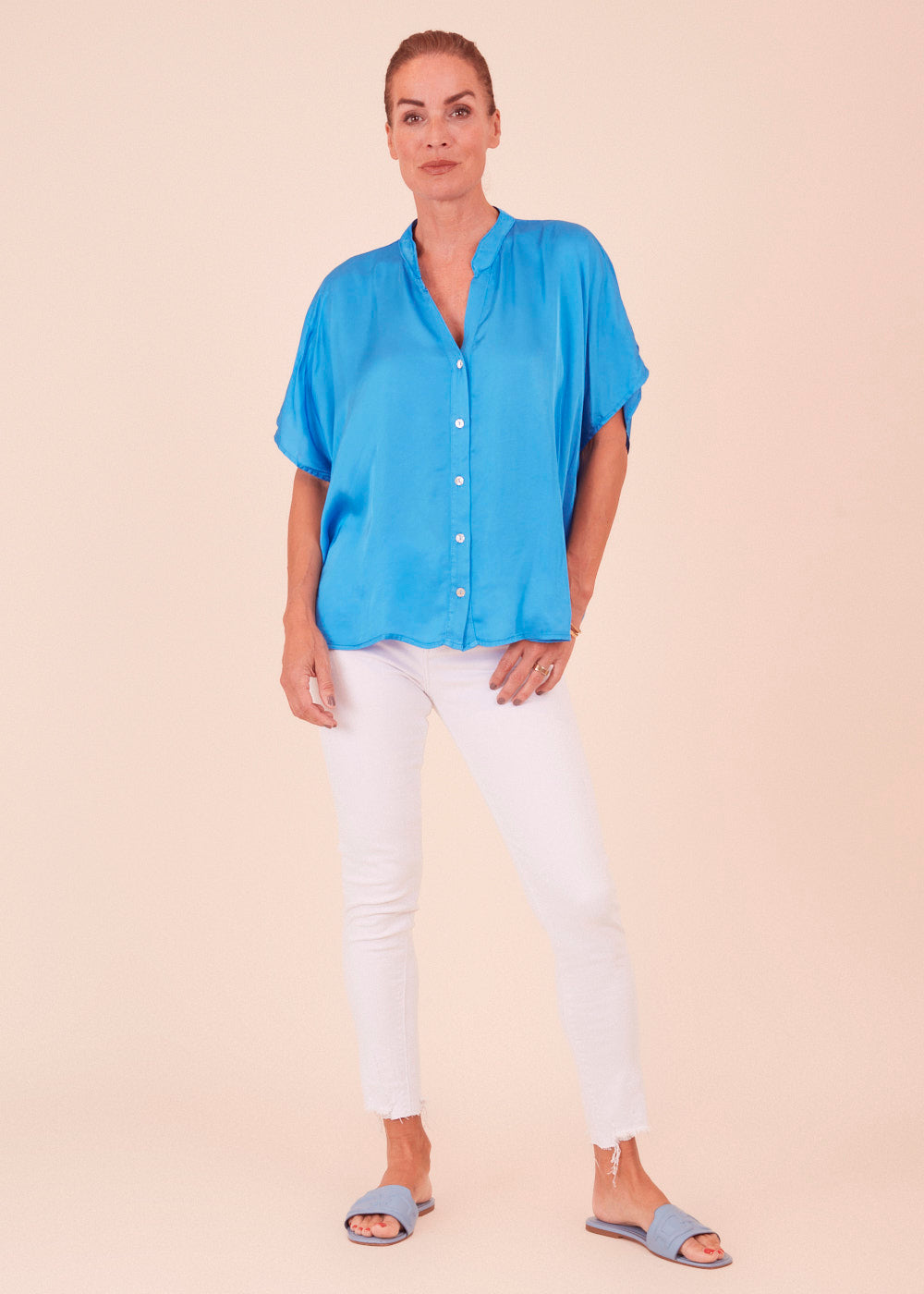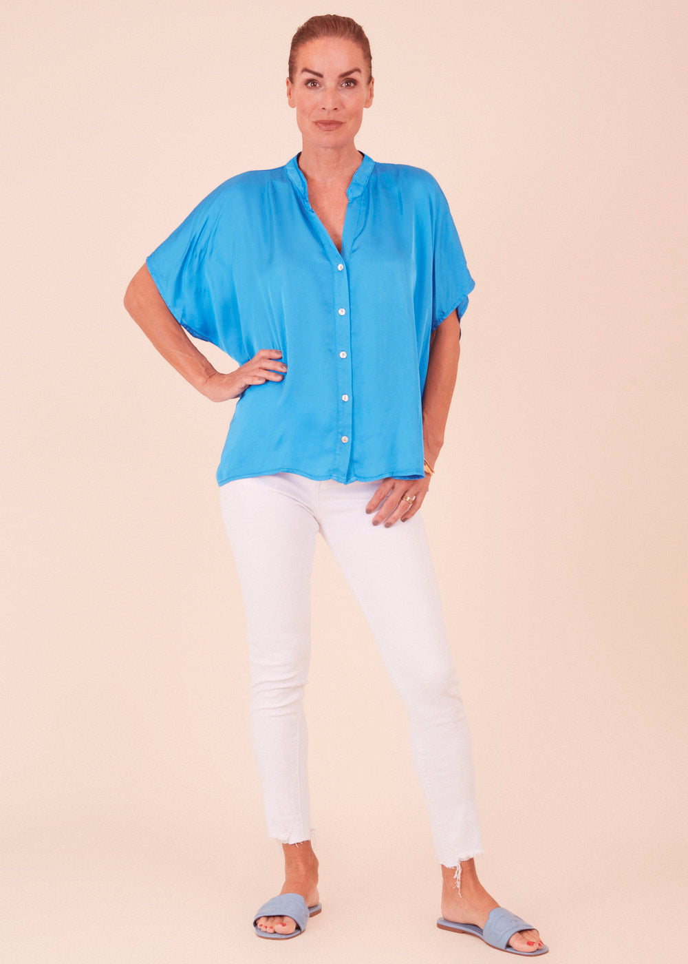 Lässige Stehkragen Bluse mit durchgehender Knopfleiste aus einem fließenden Viskosematerial.  Sie dreiviertel Ärmel und einem lässigen Schnitt. Das luftig leichte Material eignet sich perfekt für die heißen Tage.