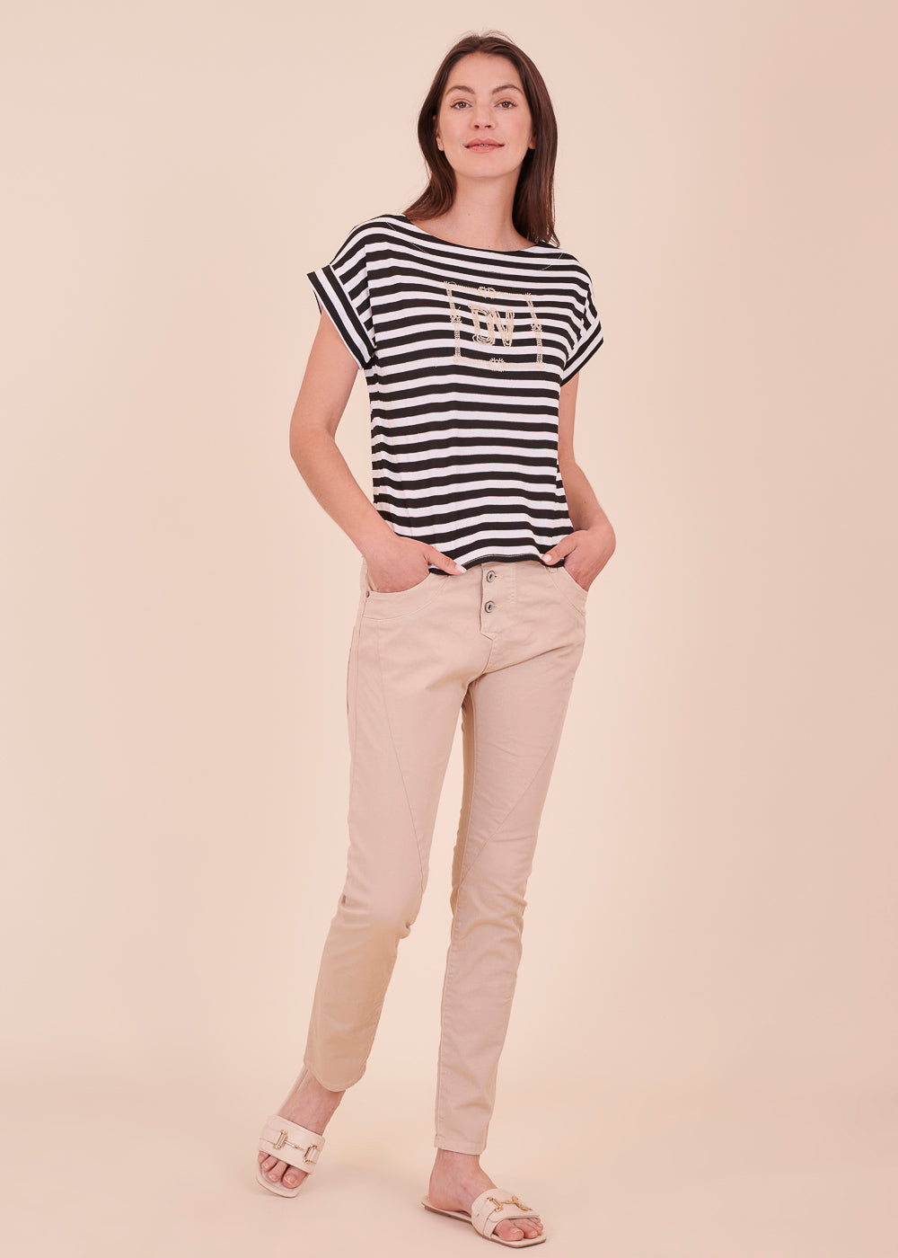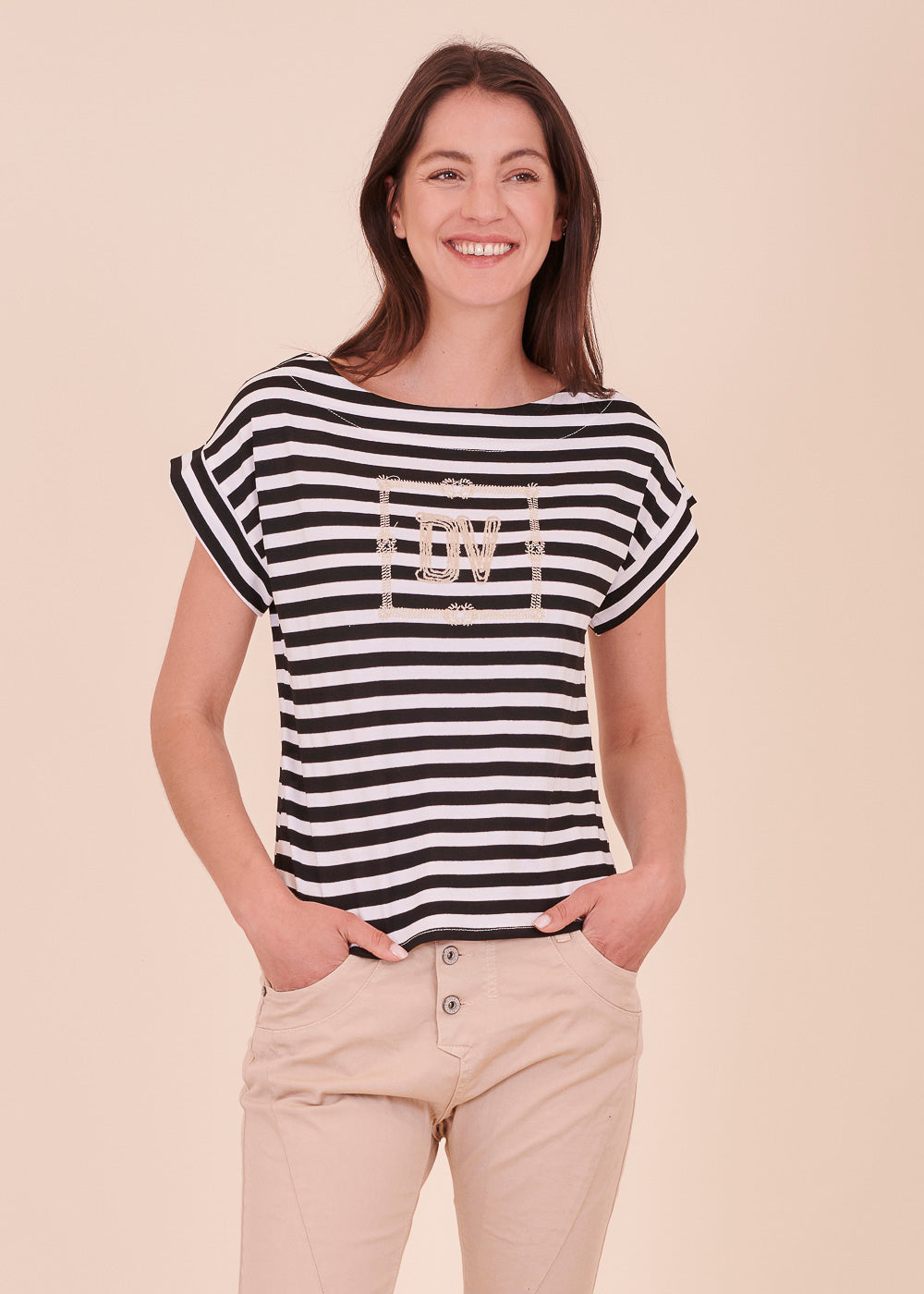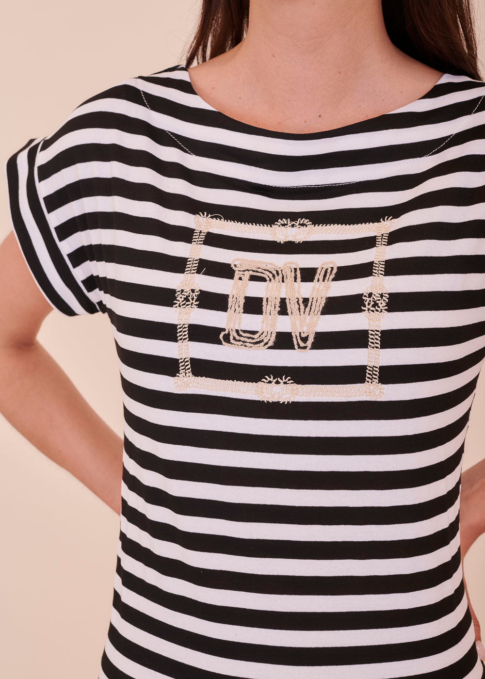 T-Shirt aus weicher Baumwolle mit Frontstickerei, Rundausschnitt und überschnittenen Schultern.